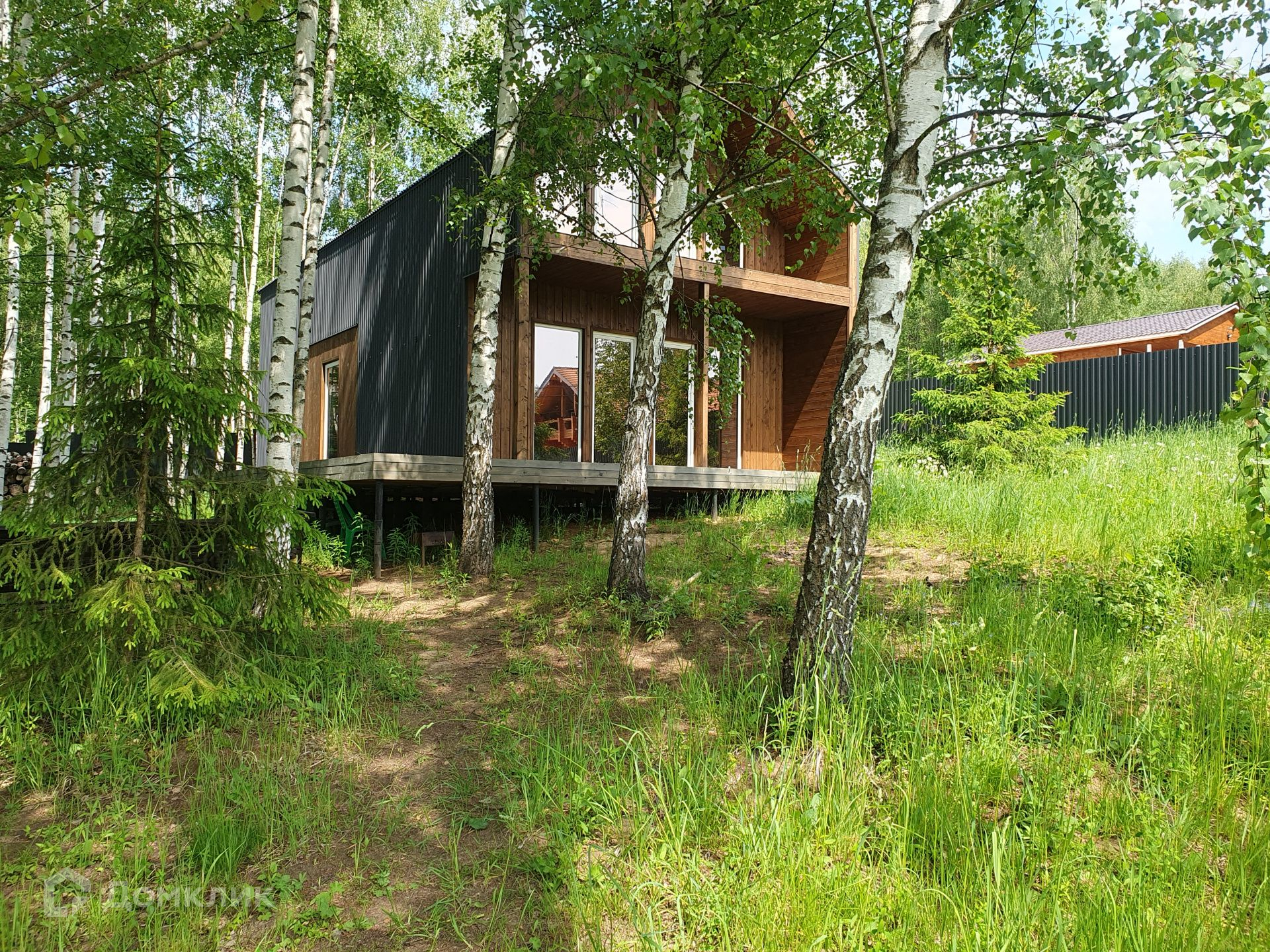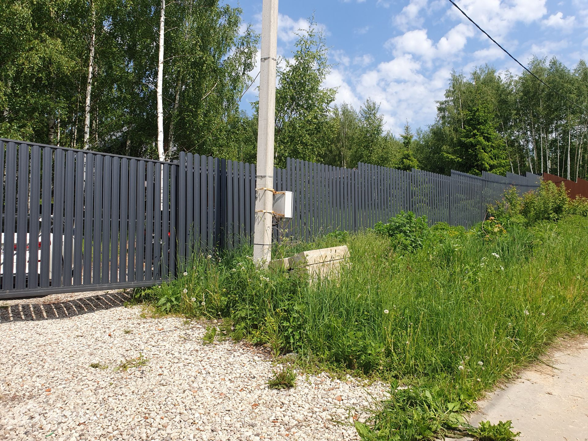Участок огорожен, въезд осуществляется через автоматические ворота, отдельно сделан выход в лес.