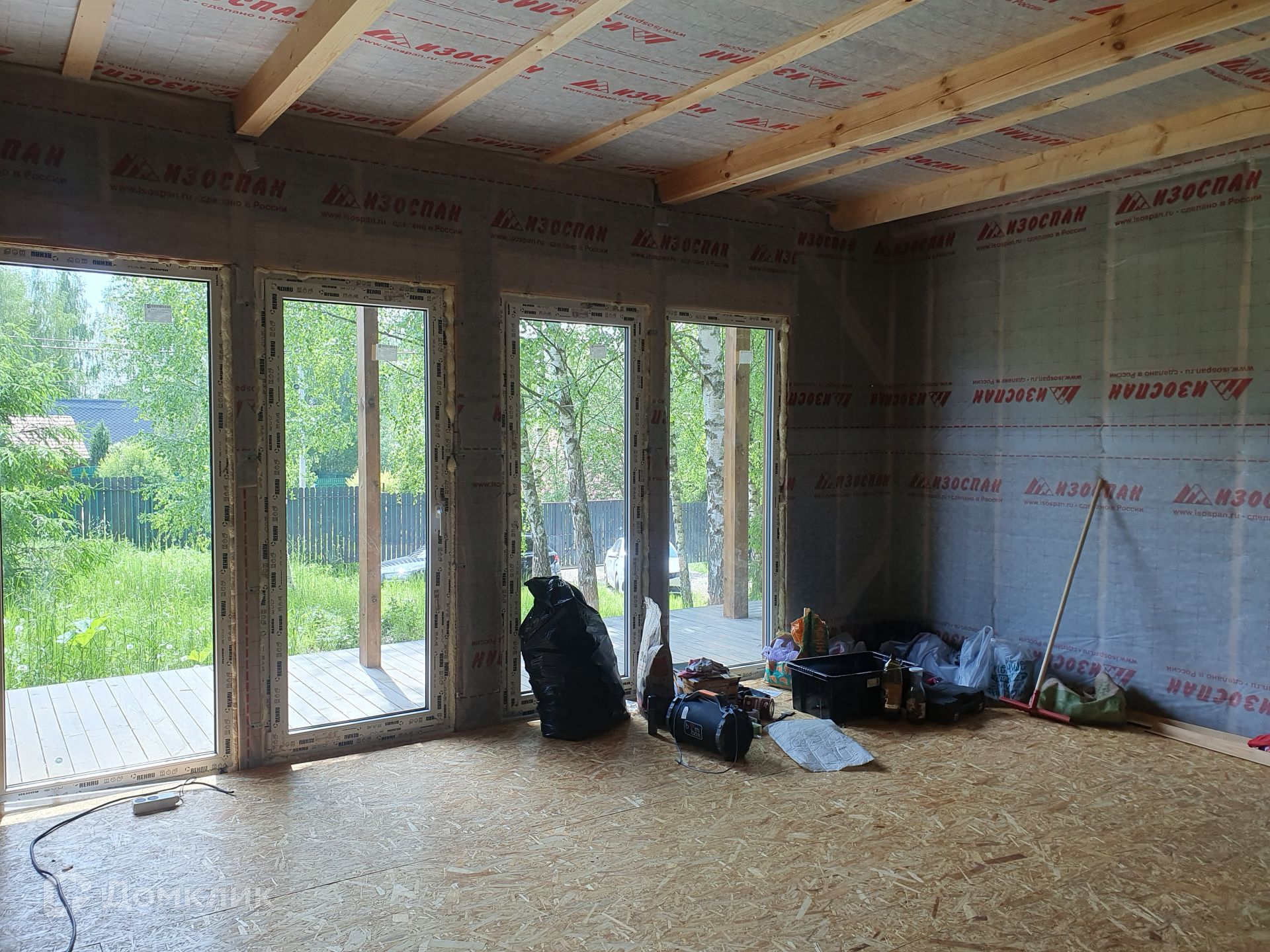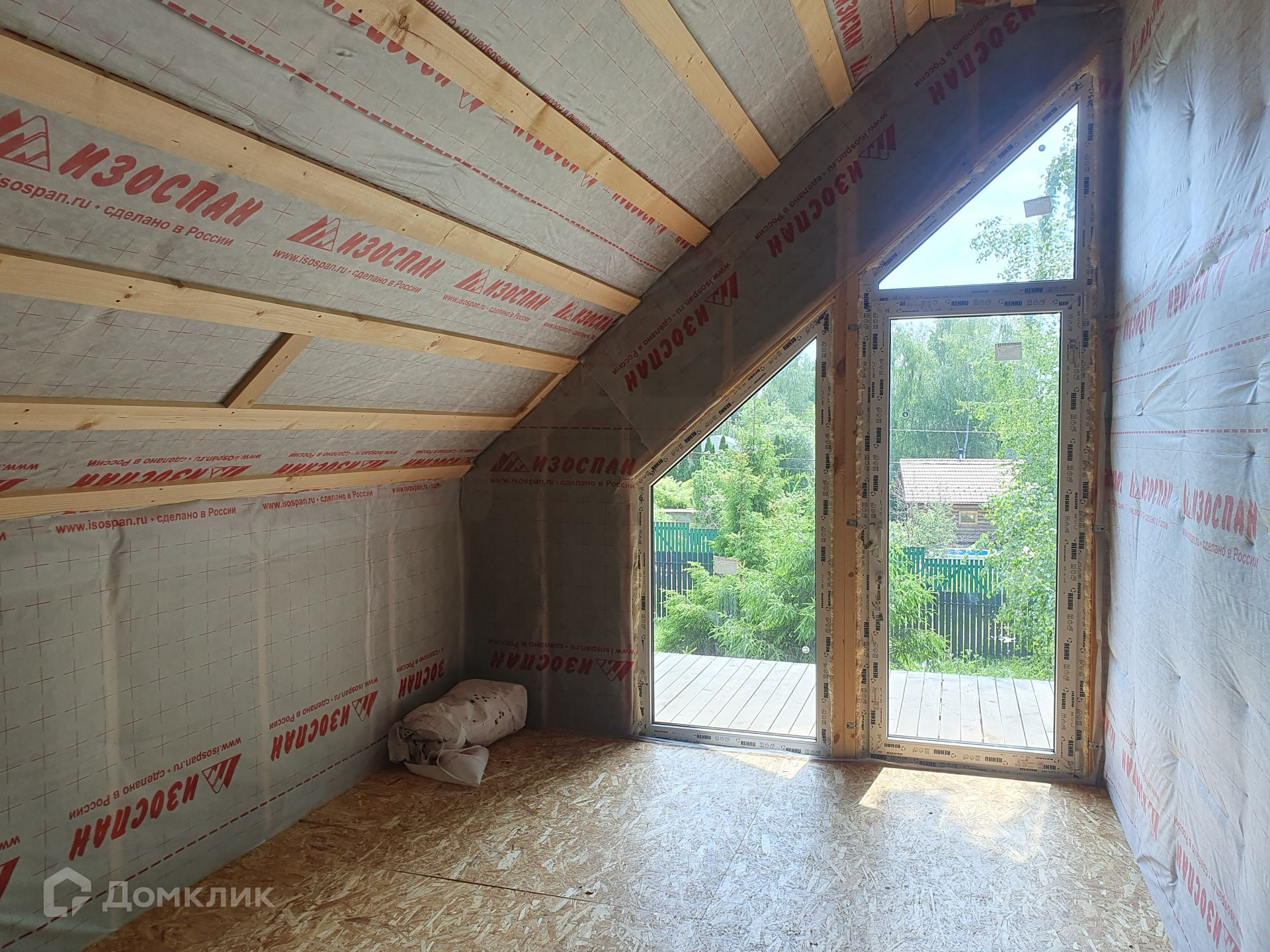 Дом сделан в стиле "Barn hous", утеплен перекрестным утеплителем (250 мм), фундамент - сваи, остекление Rehau.