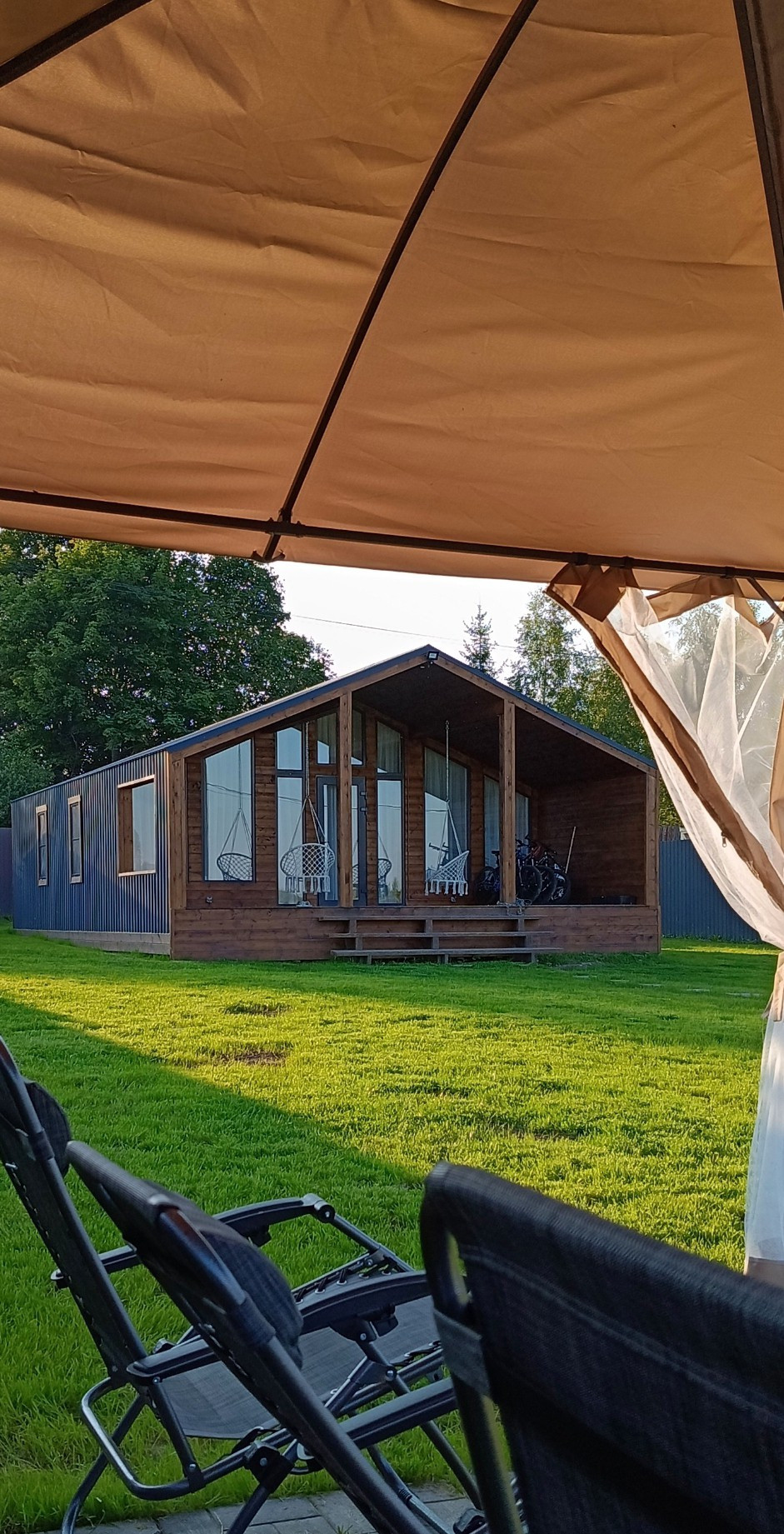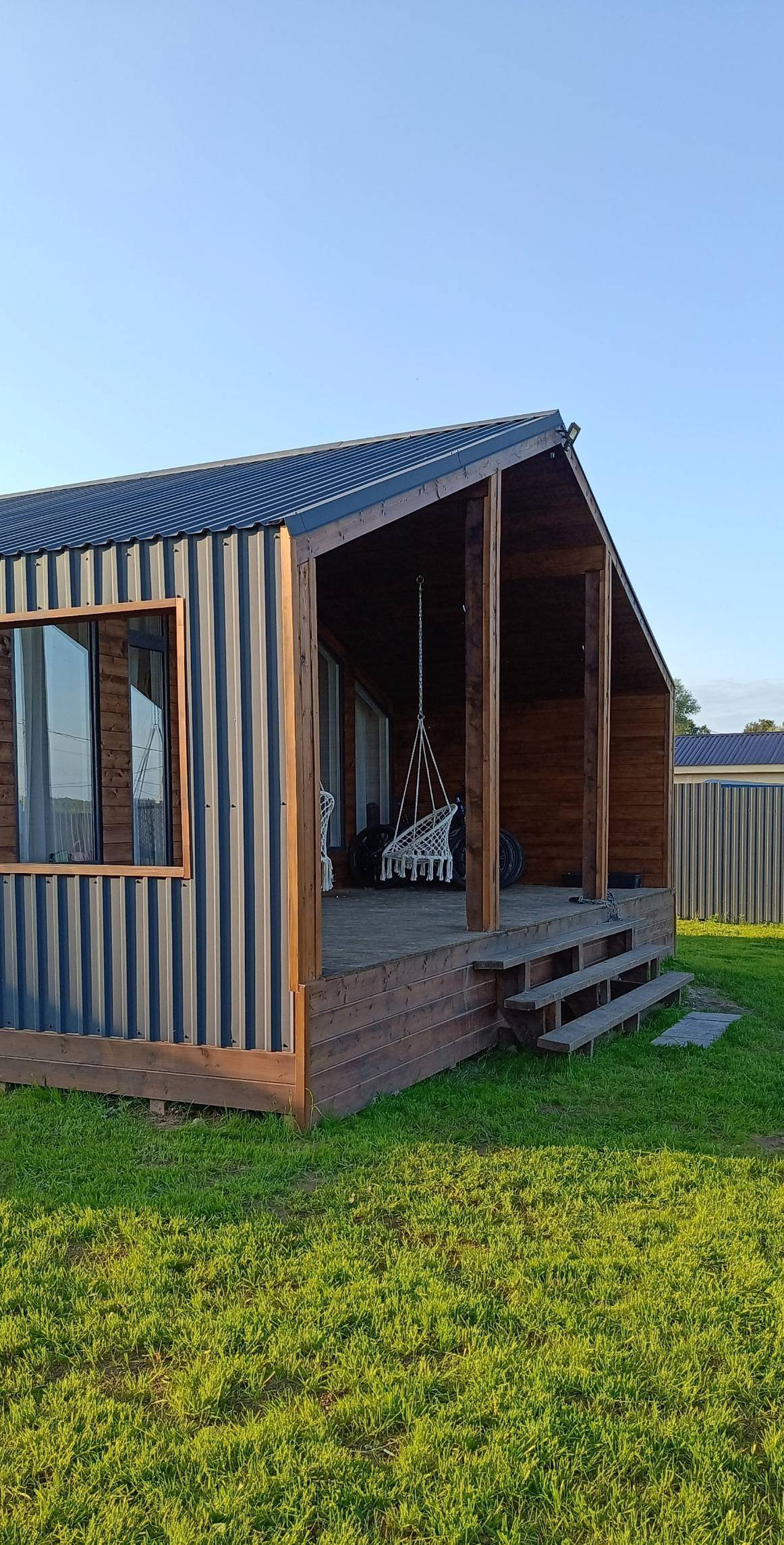 Утеплен базальтовым утеплителем Технониколь 150мм по кругу. Наружняя отделка комбинированная, профлист С20 мат, имитация бруса и панорамное остекление