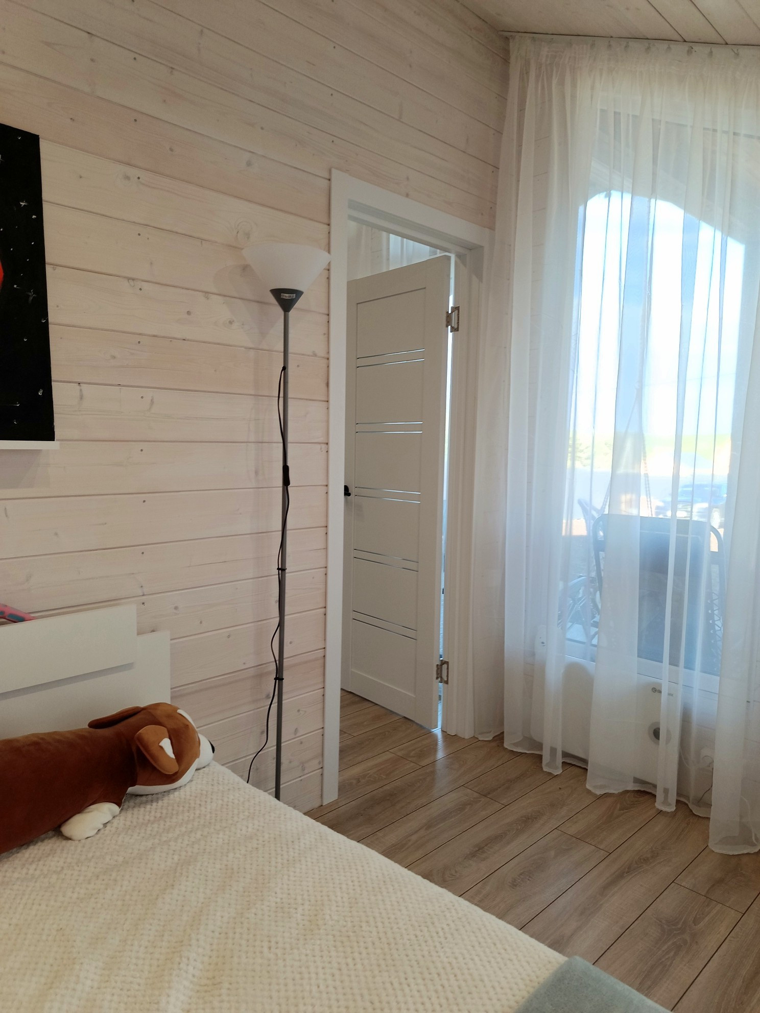 Внутренняя отделка стен выполнена имитацией бруса , полов - ламинат,