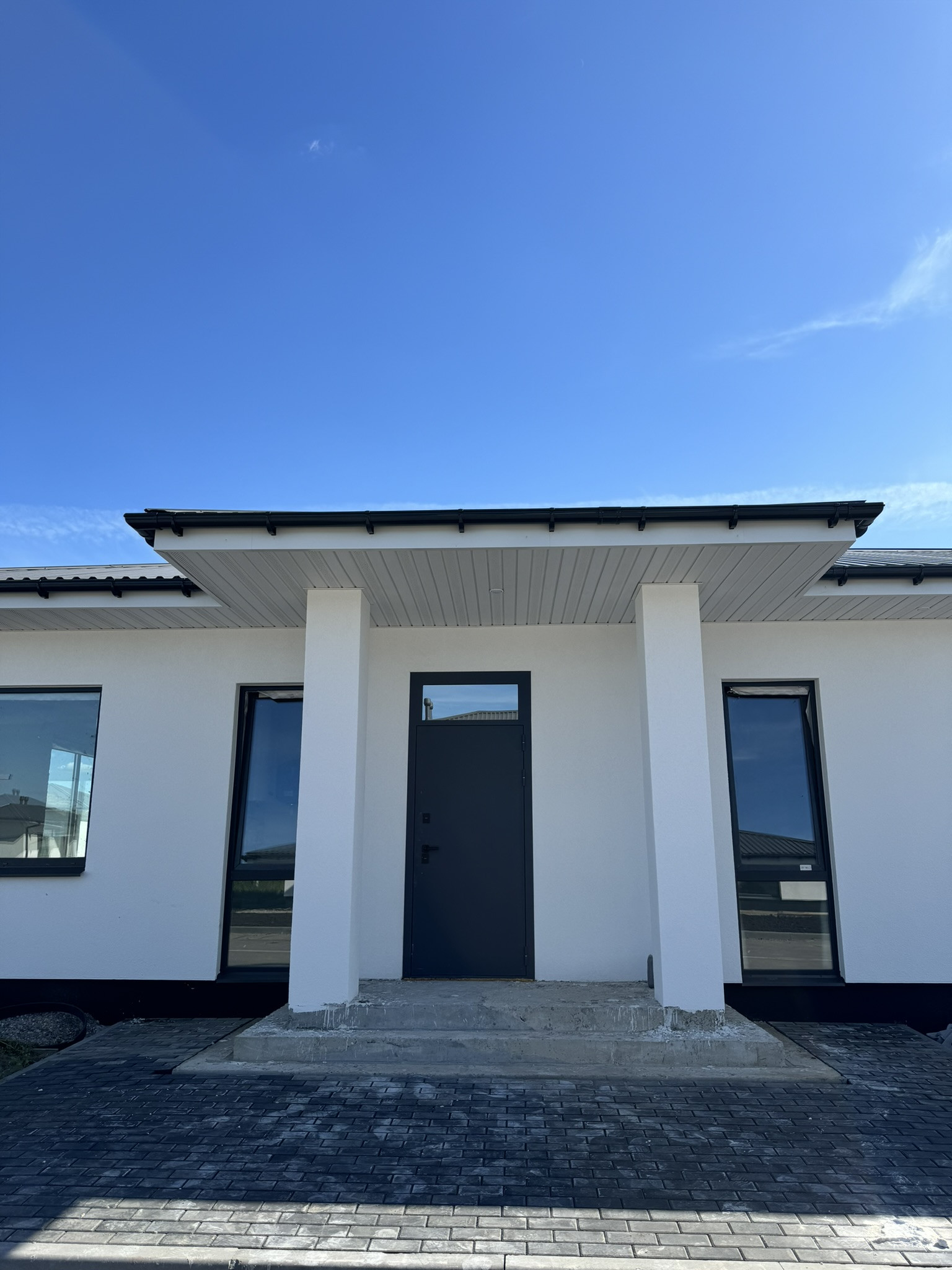 - Благоустроенная территория у входа в дом с машиноместом из брусчатки