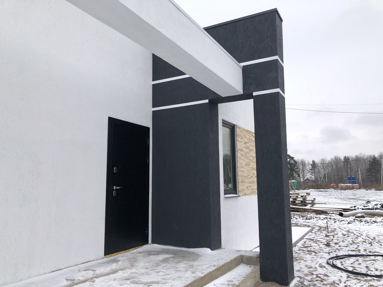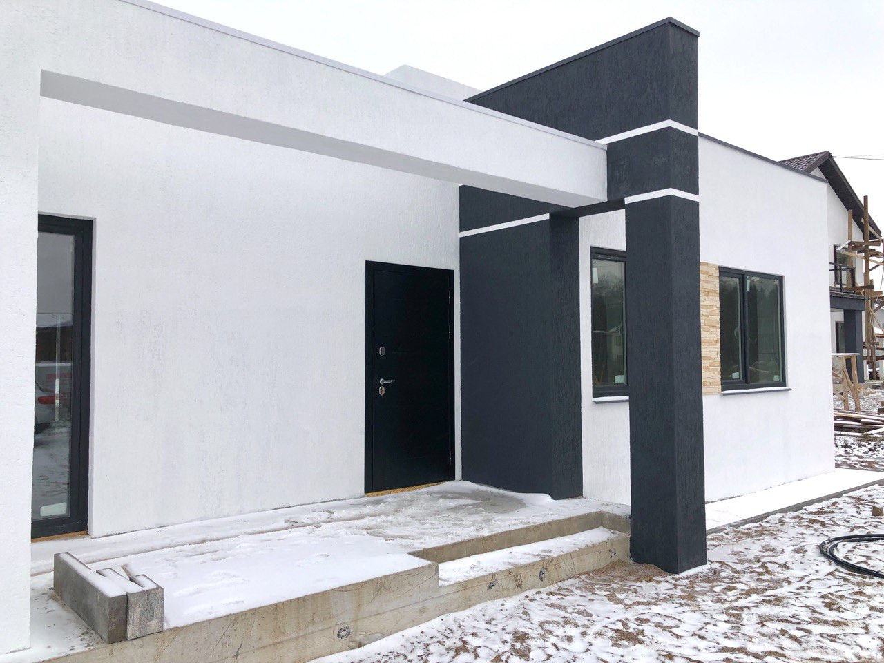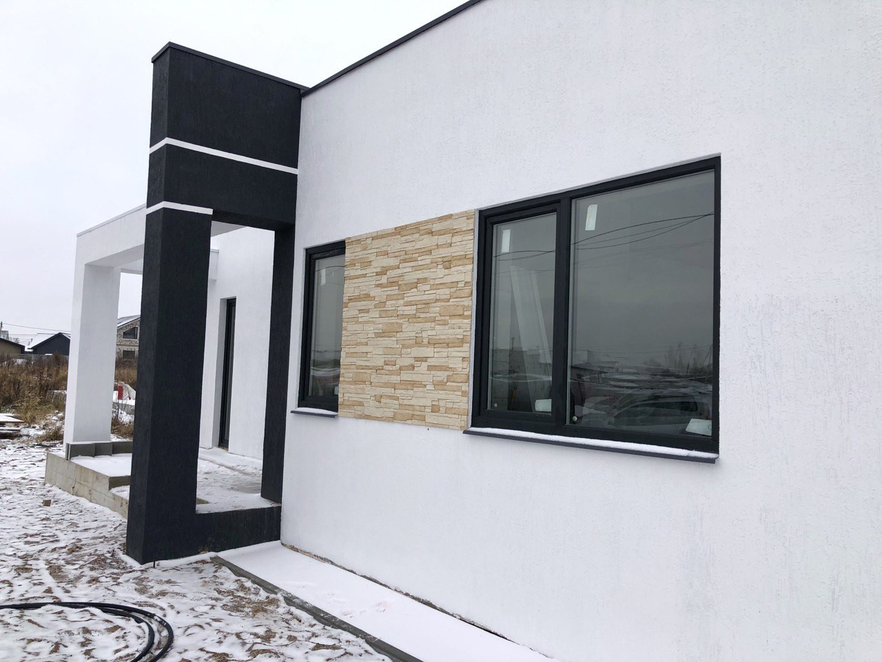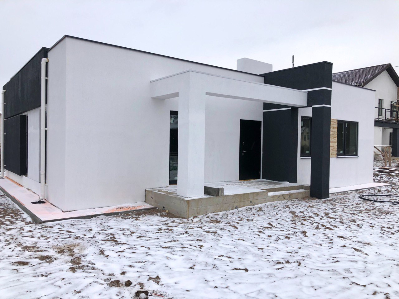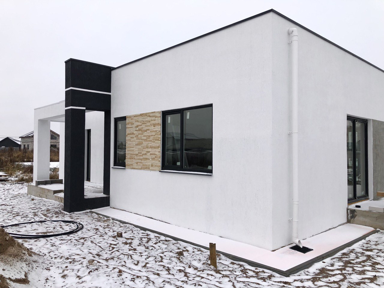 Дом стоит на УШП с теплыми полами. Стены газобетон 400 мм. Кровля плоская, монолитная. 150 мм утепление, гидроизоляция Технониколь.