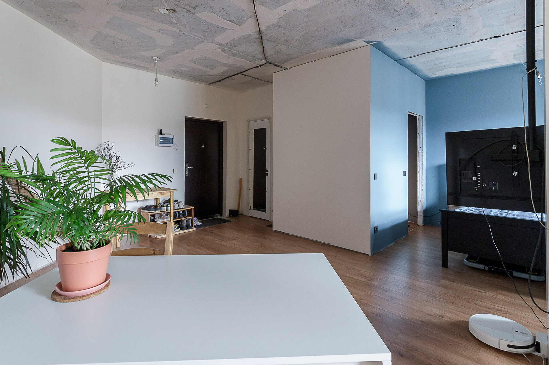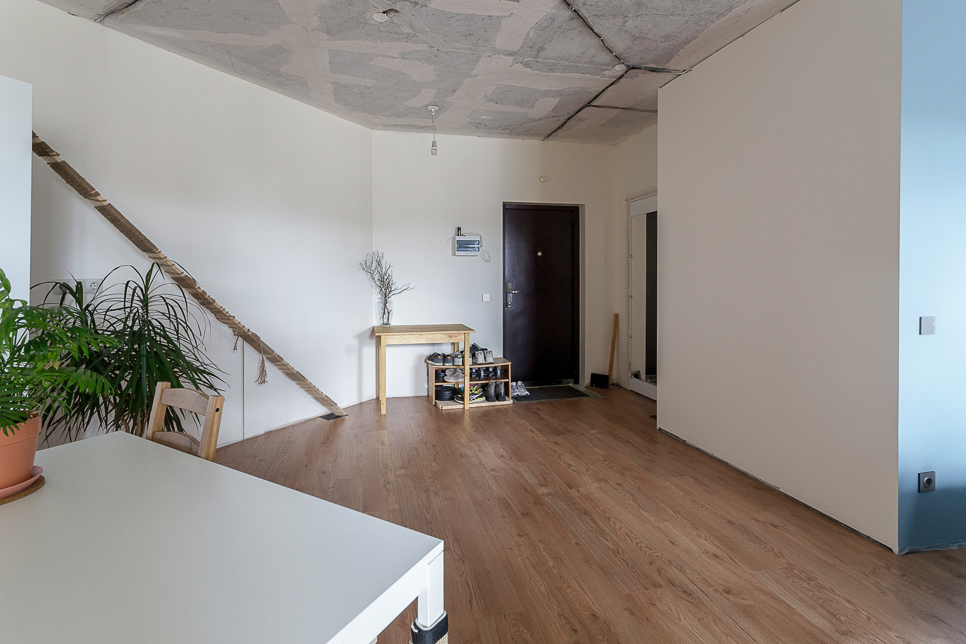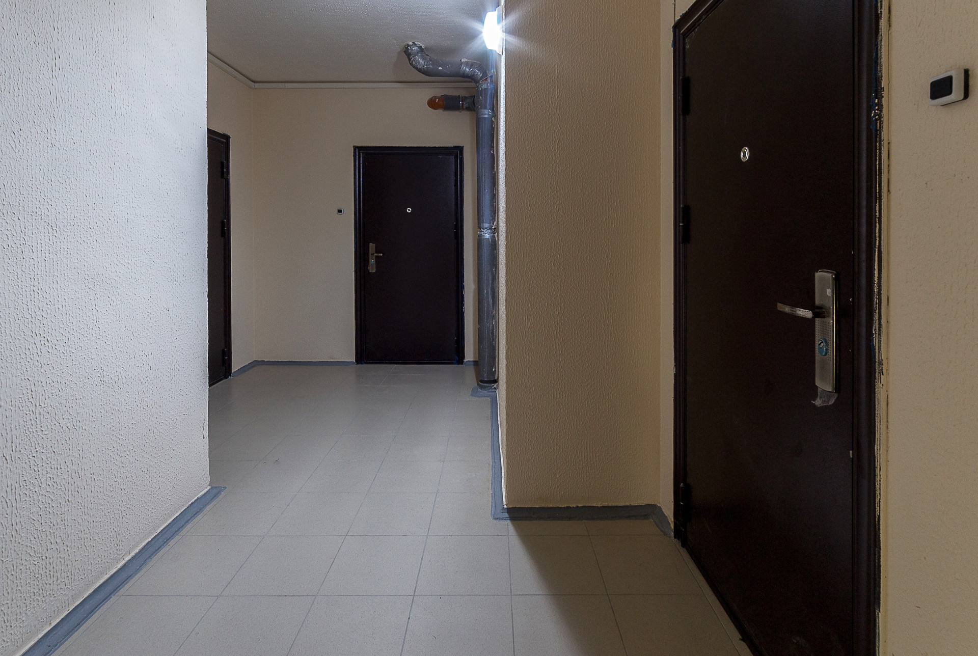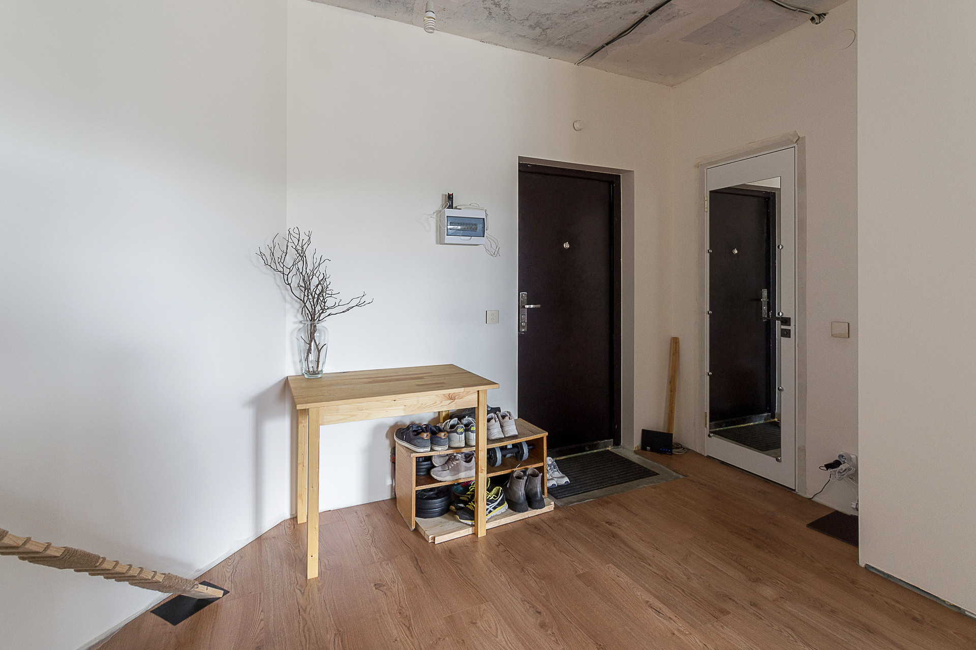 Стены окрашены, санузел совмещённый, есть гардеробная комната, пол ламинат. Двойной балкон. Большое преимущество, что три квартиры на лестничной площадке, что достаточно редко в многоквартирных домах