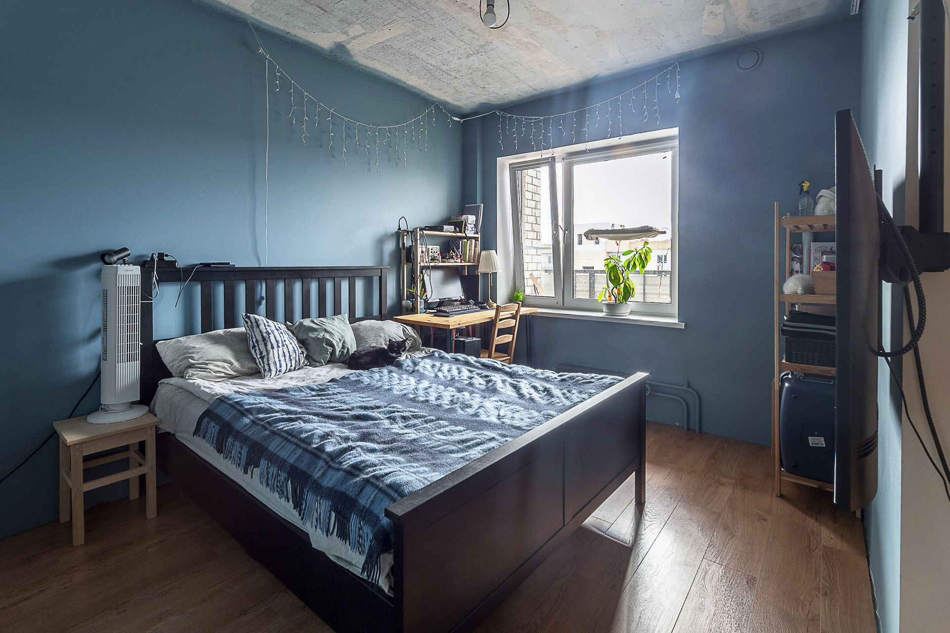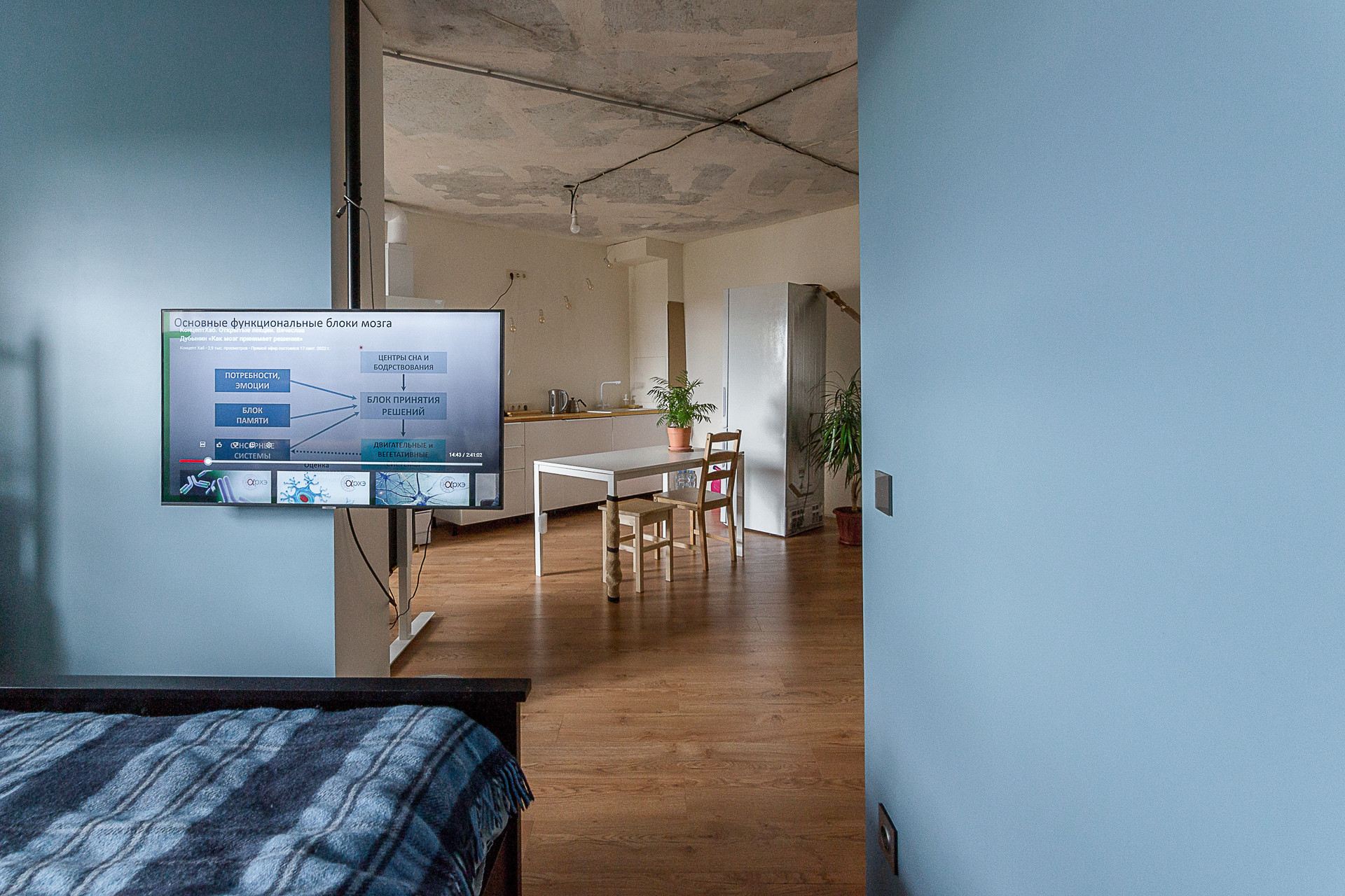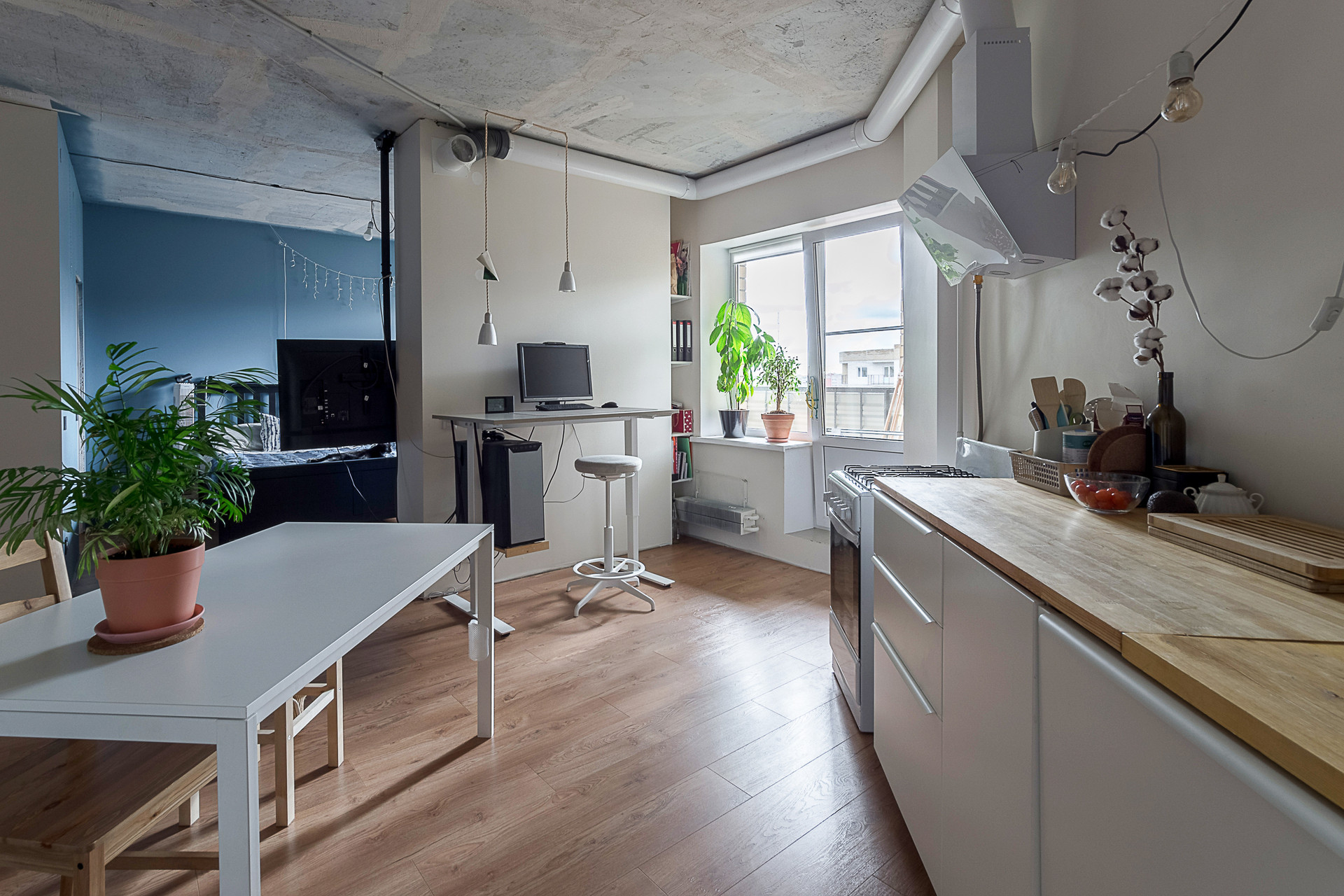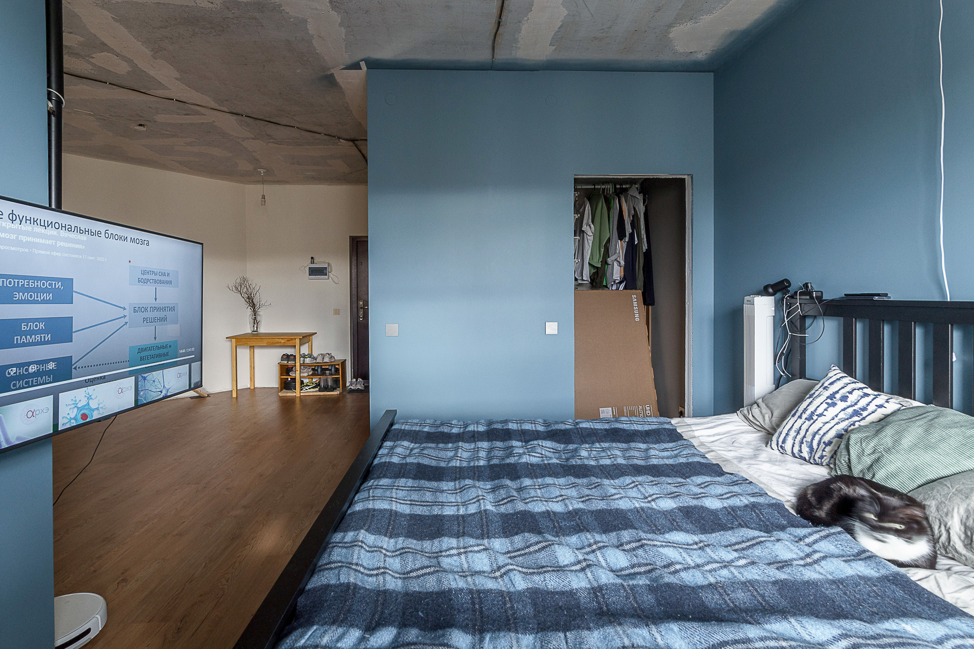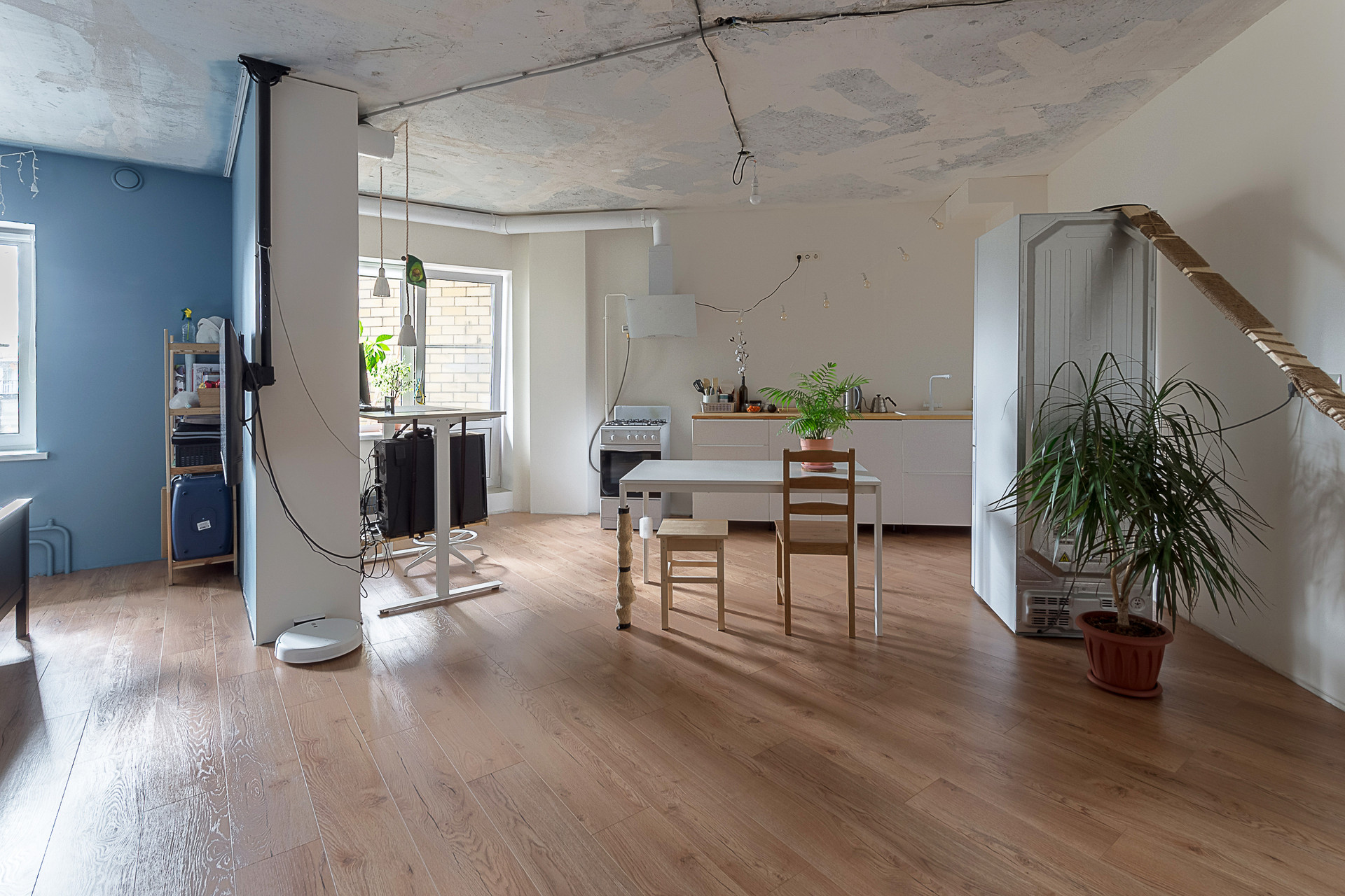 Стены окрашены, санузел совмещённый, есть гардеробная комната, пол ламинат. Двойной балкон. Большое преимущество, что три квартиры на лестничной площадке, что достаточно редко в многоквартирных домах