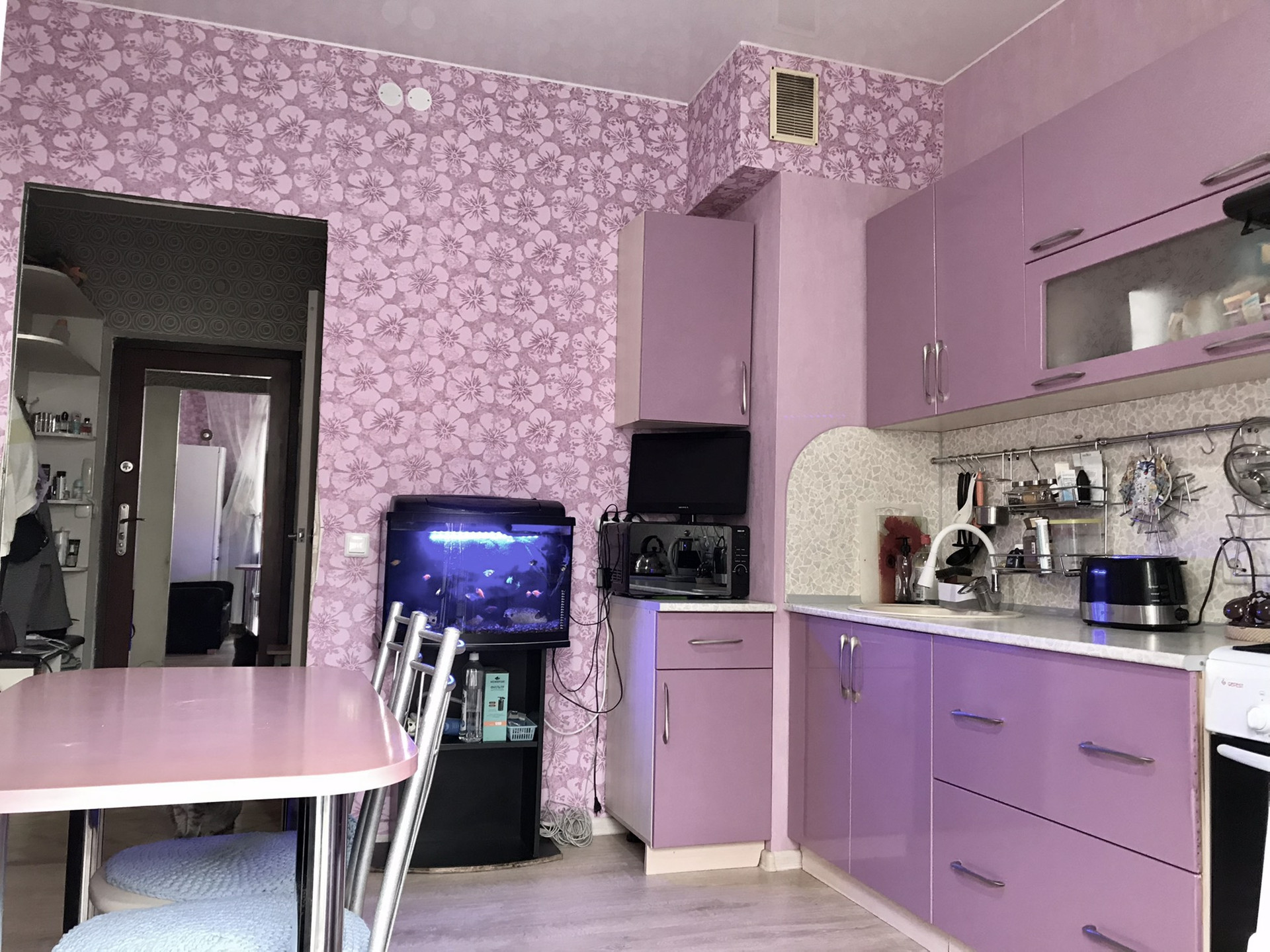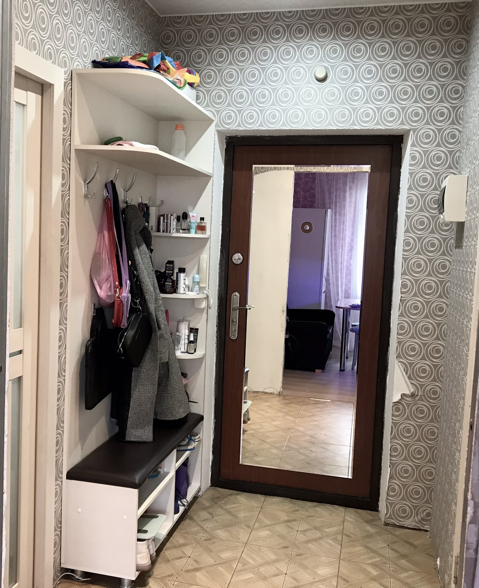 В квартире остается кухонная мебель, шкаф-купе в комнате (вместительный, много места для хранения, полки, ящики, штанги), корпусная мебель в комнате, прихожая.