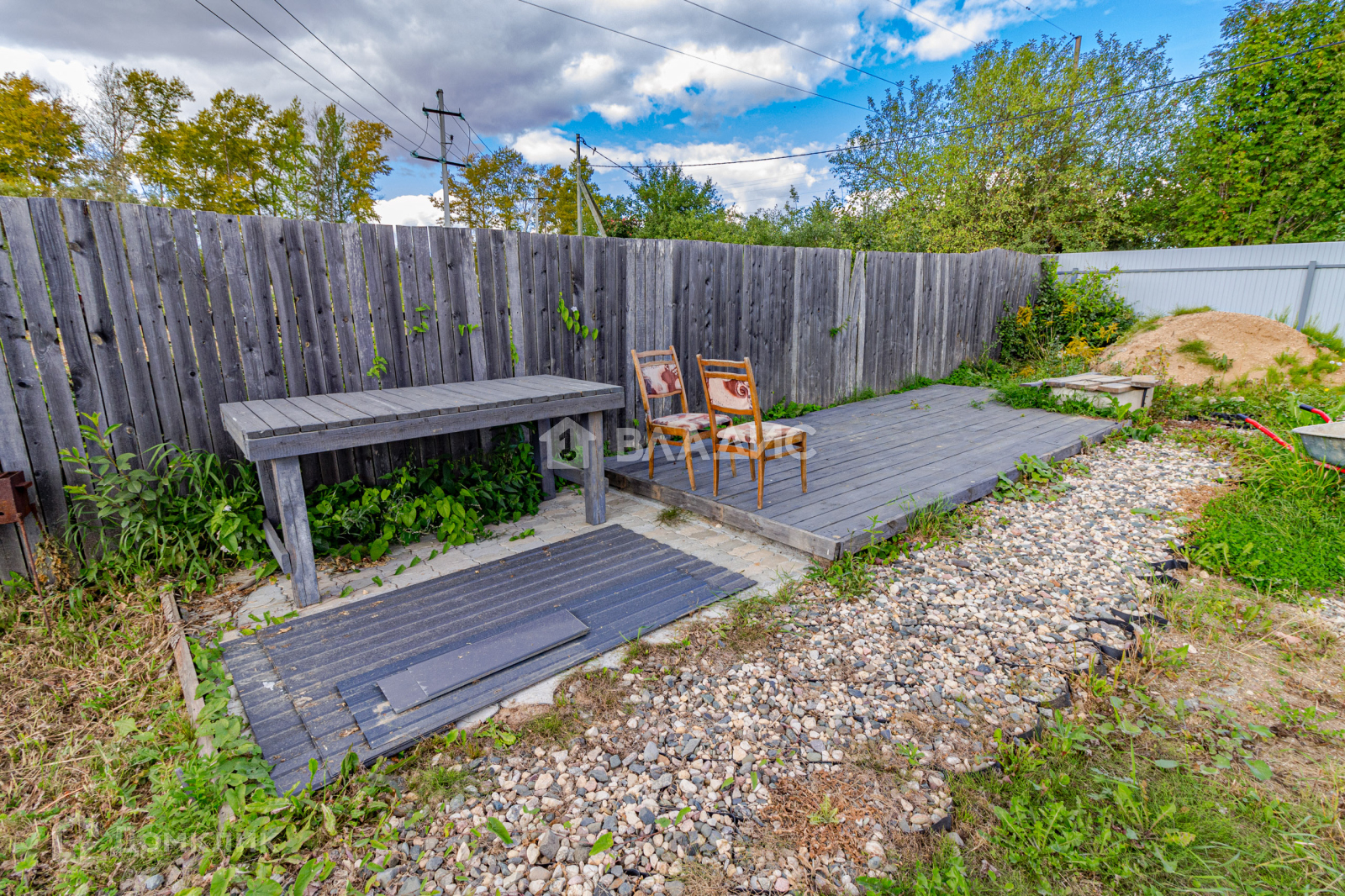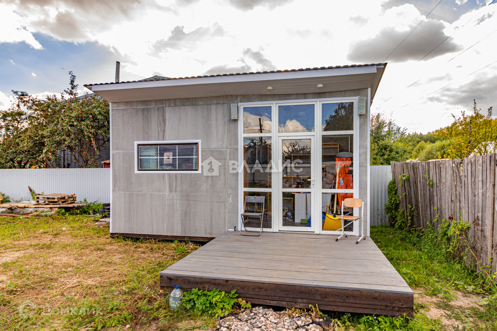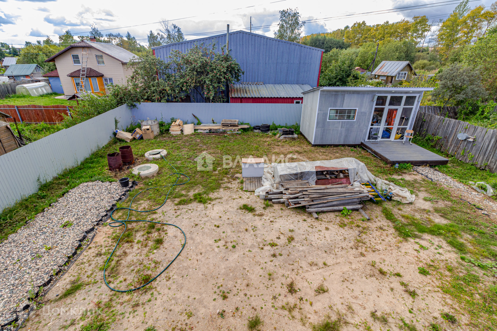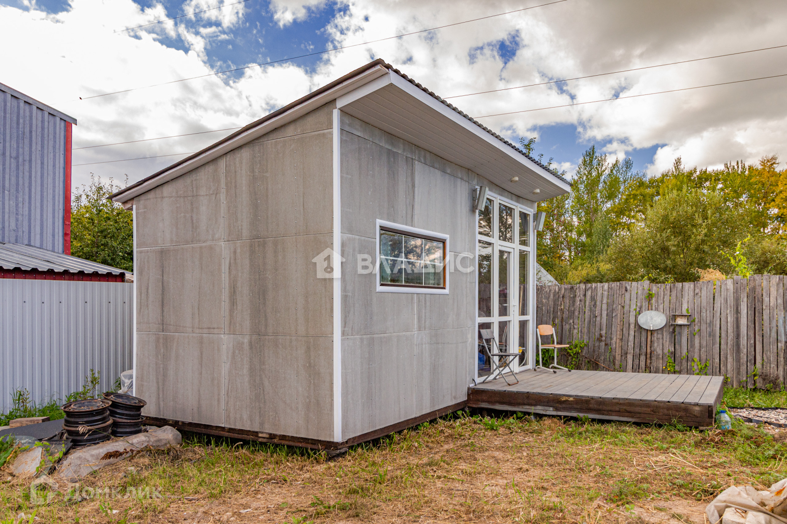 Имеется частично утепленная каркасная хозяйственная постройка на свайном фундаменте, которая может использоваться для хранения инвентаря, бензо-инструмента или других хозяйственных нужд.