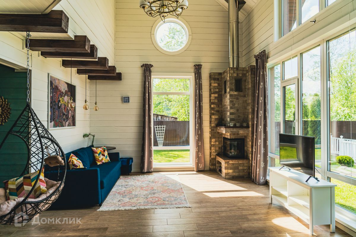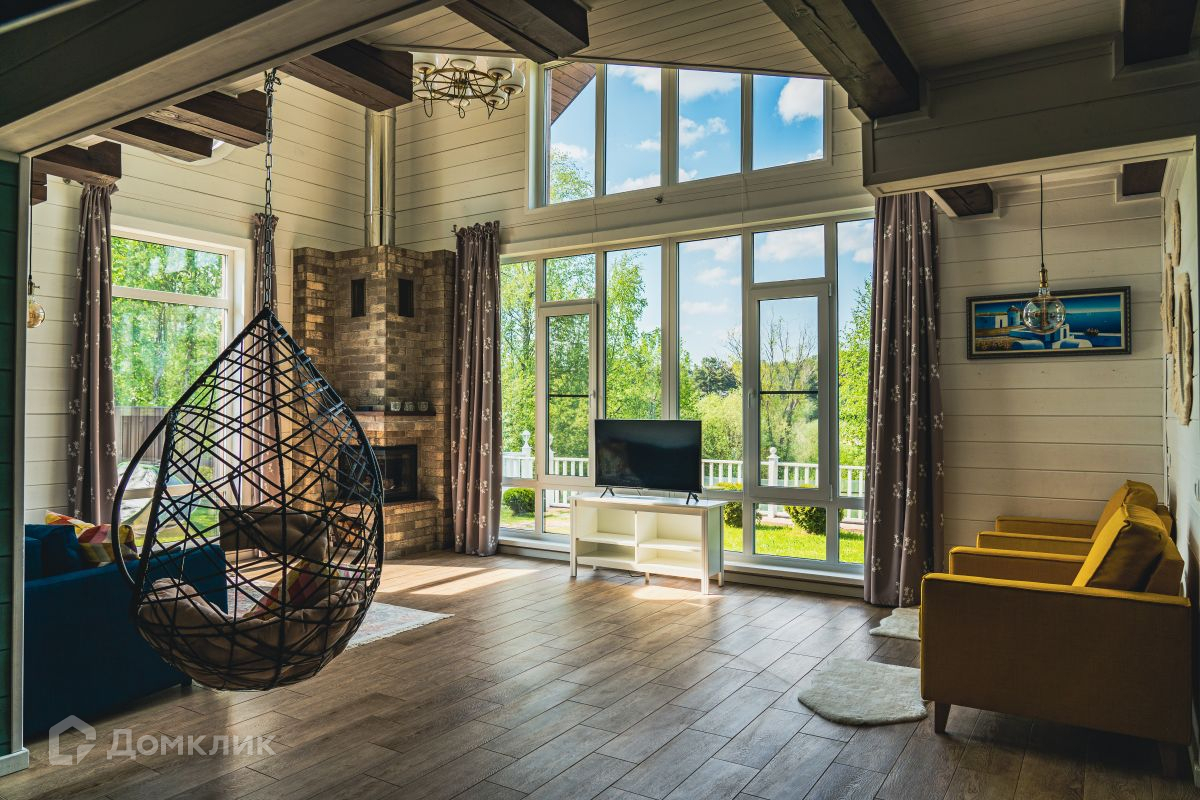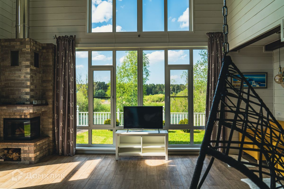 - Гостиная с камином, с вторым светом, панорамными окнами и с видом на реку.