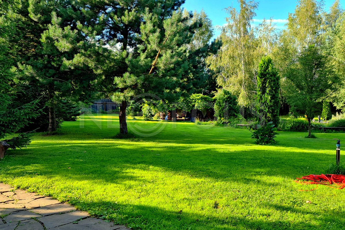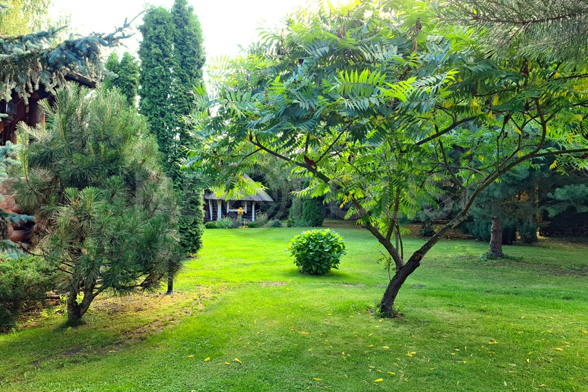 На участке выполнен ландшафтный дизайн, засеян газон, высажены взрослые хвойные и лиственные деревья, плодовые и декоративные растения.