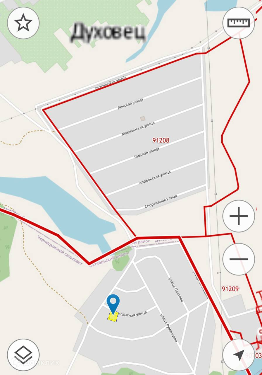 Въезд удобный через Духовец, попутно в том же Духовце в 7-ми минутах езды от участка супермаркеты: Магнит и Пятерочка.
