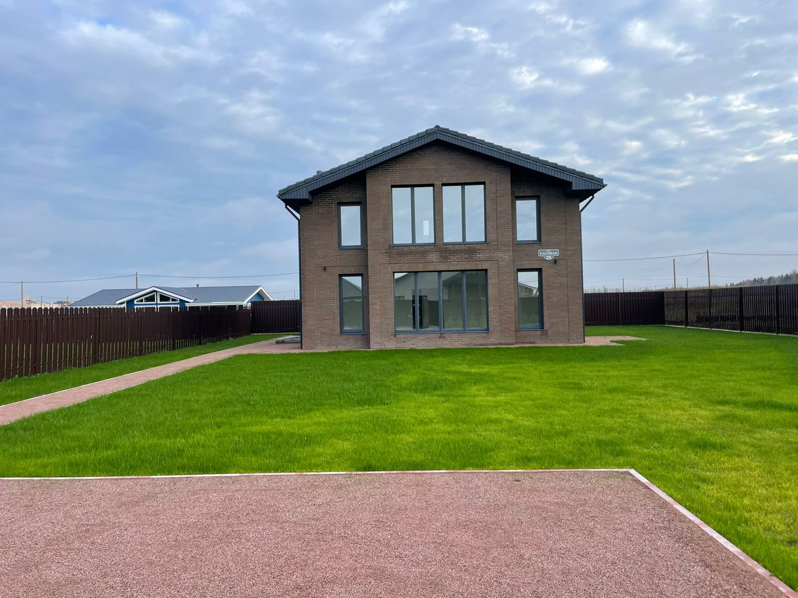 Качественный забор из штакетника по всему периметру участка, откатные ворота на пульте, домофон. Ровный сухой участок, посевной газон и елочки. Очень хорошее расположение, много солнечного света.