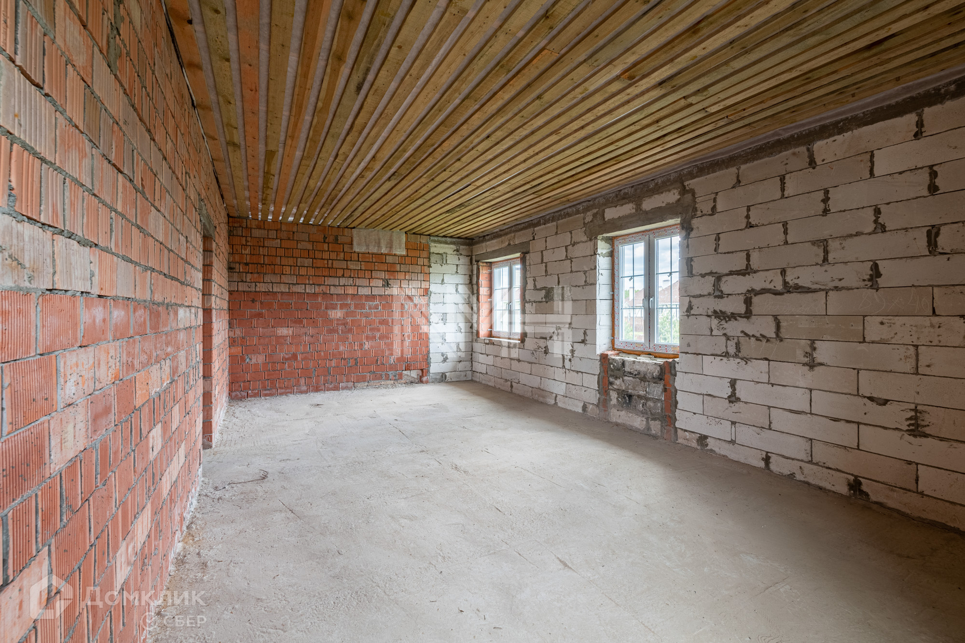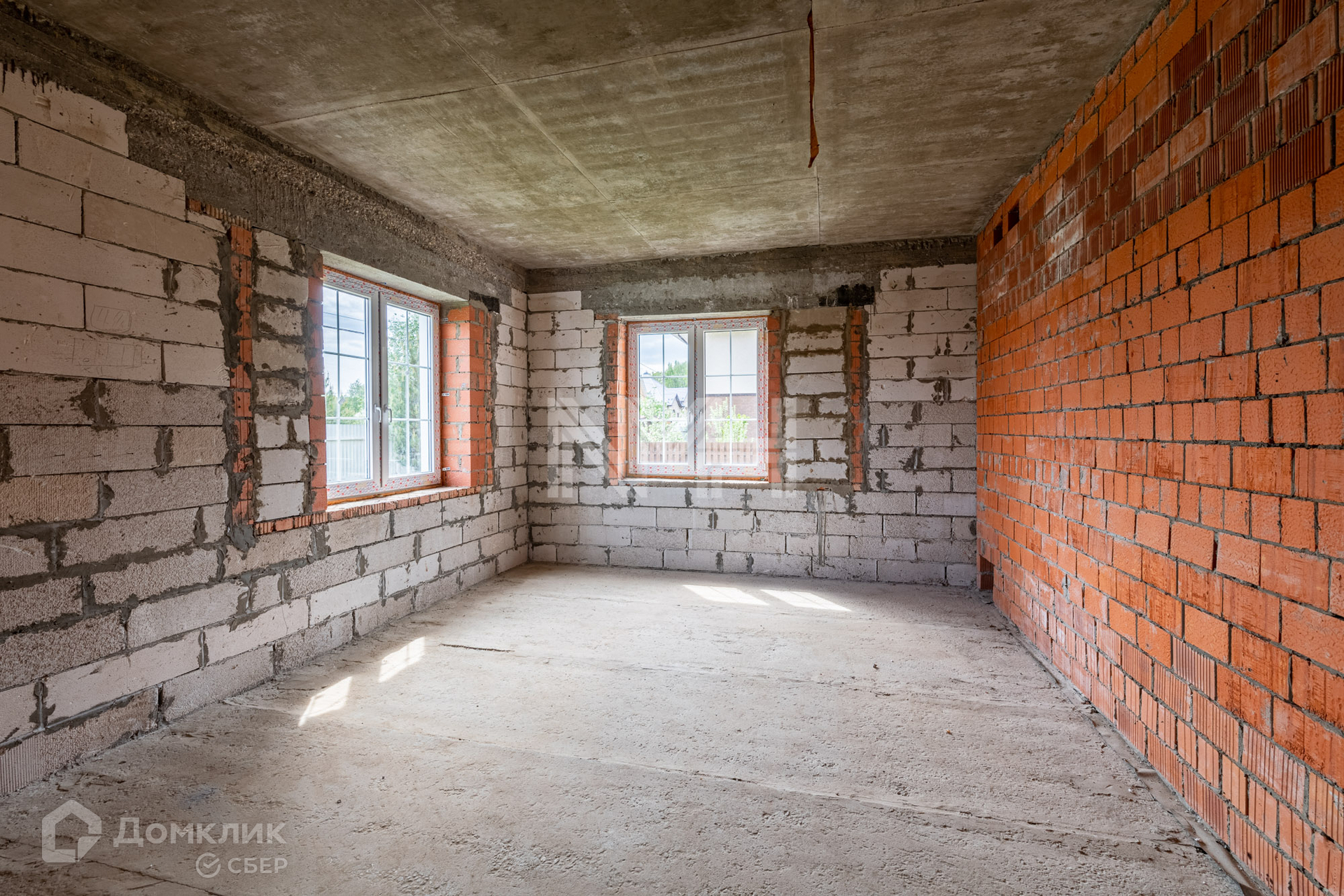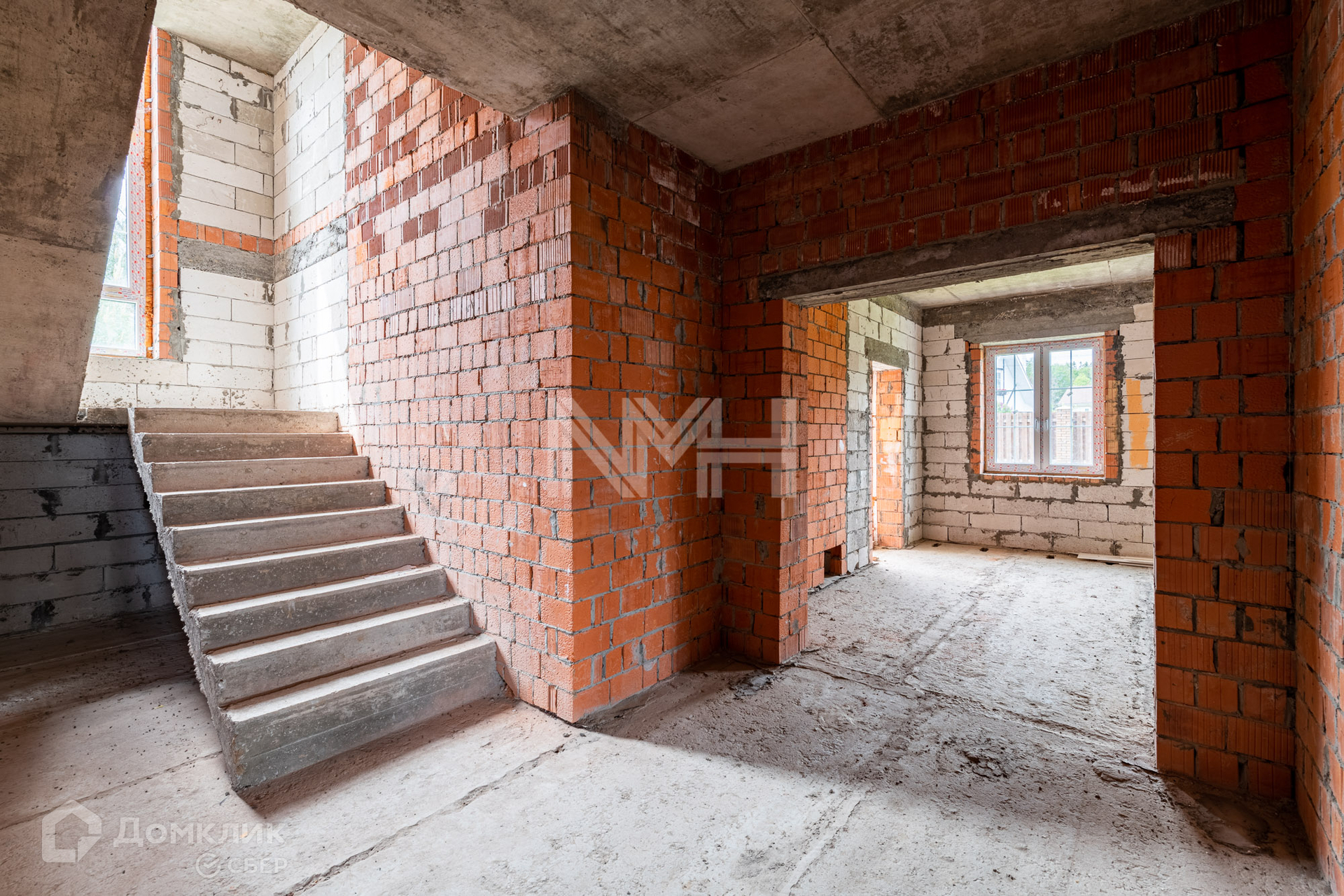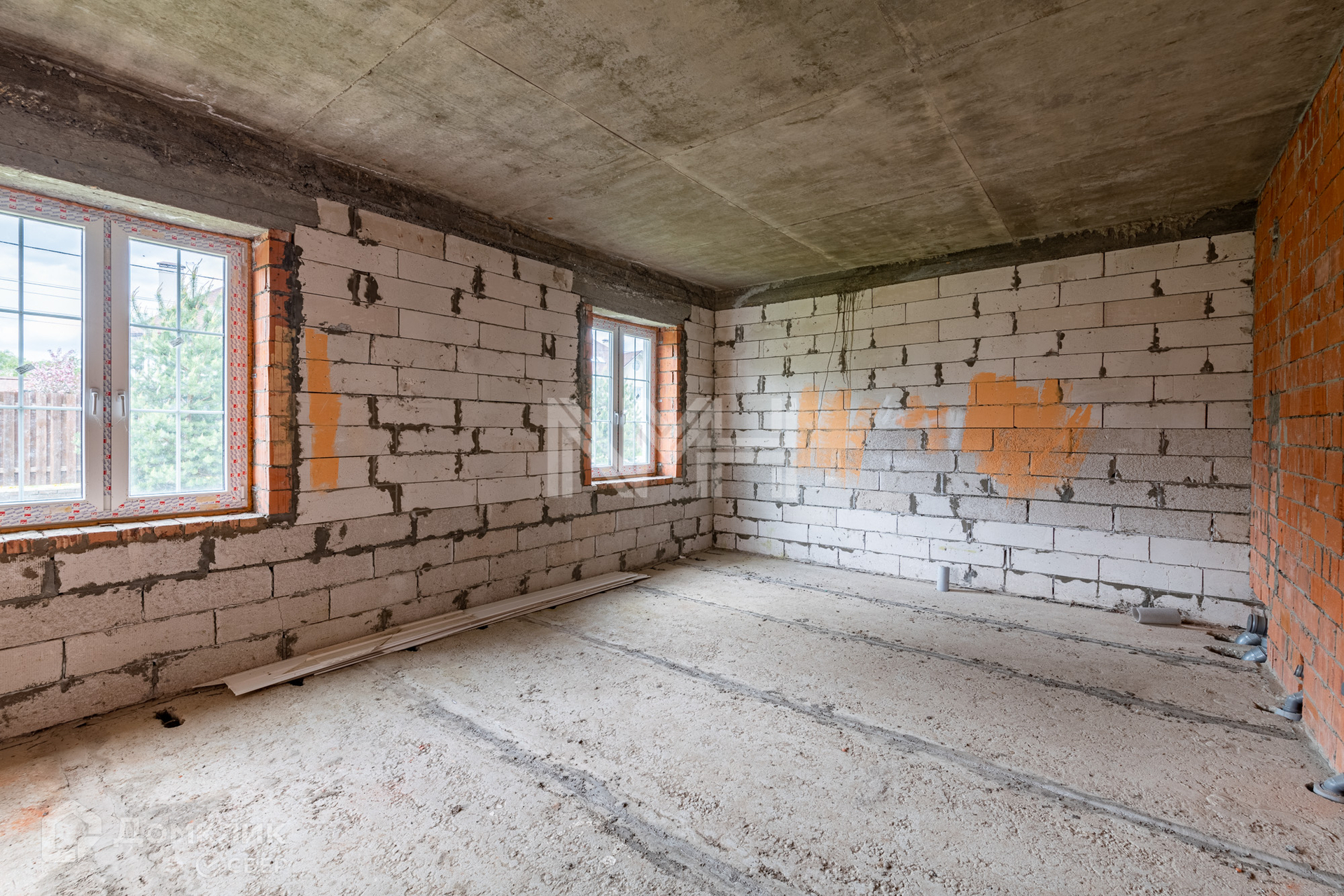 Дом построен из газоблоков, несущие стены — кирпичные, фундамент – ленточный, перекрытия — ж/б плиты, окна — двухкамерные стеклопакеты, наружная отделка — штукатурка. Внутри дома сделаны перегородки, установлена монолитная лестница. В строительстве дома использовались качественные материалы. Все коммуникации подведены. Газ по границе участка.
