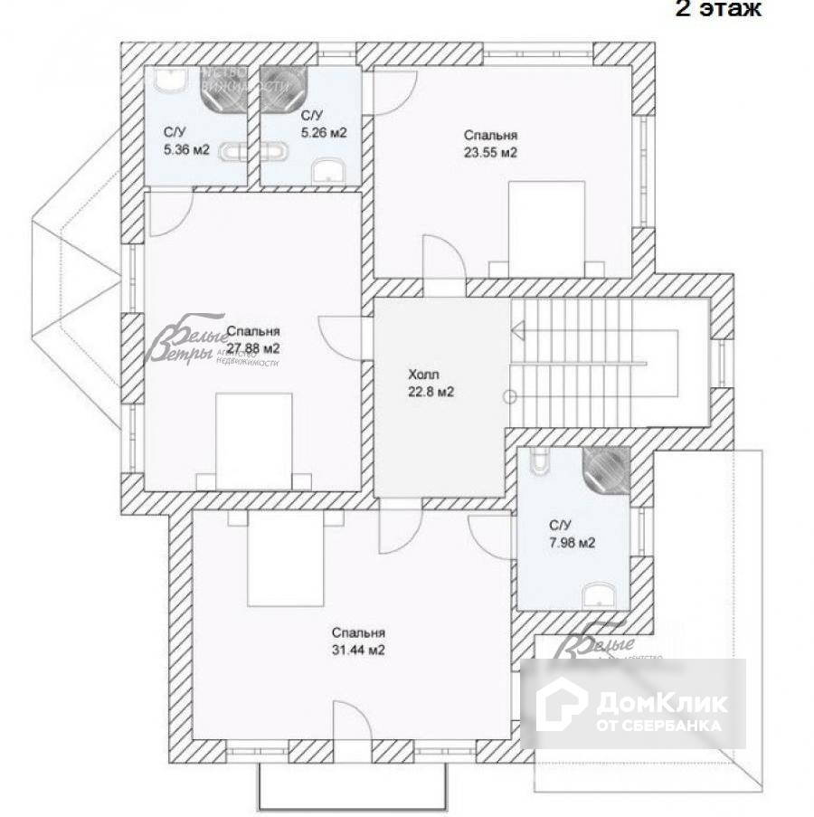 2-ой этаж: холл 23 кв.м, главная спальня 31 кв.м с с/узлом 8 кв.м и выходом на балкон, 2 спальни 23.5 кв.м и 28 кв.м со своими с/узлами по 5 кв.м.