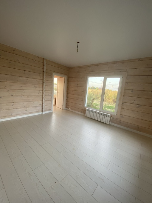Выполнена внутренняя чистовая отделка! Пол - ламинат, потолок - натяжной, стены из бруса тонированы пропиткой в приятный светлый оттенок.