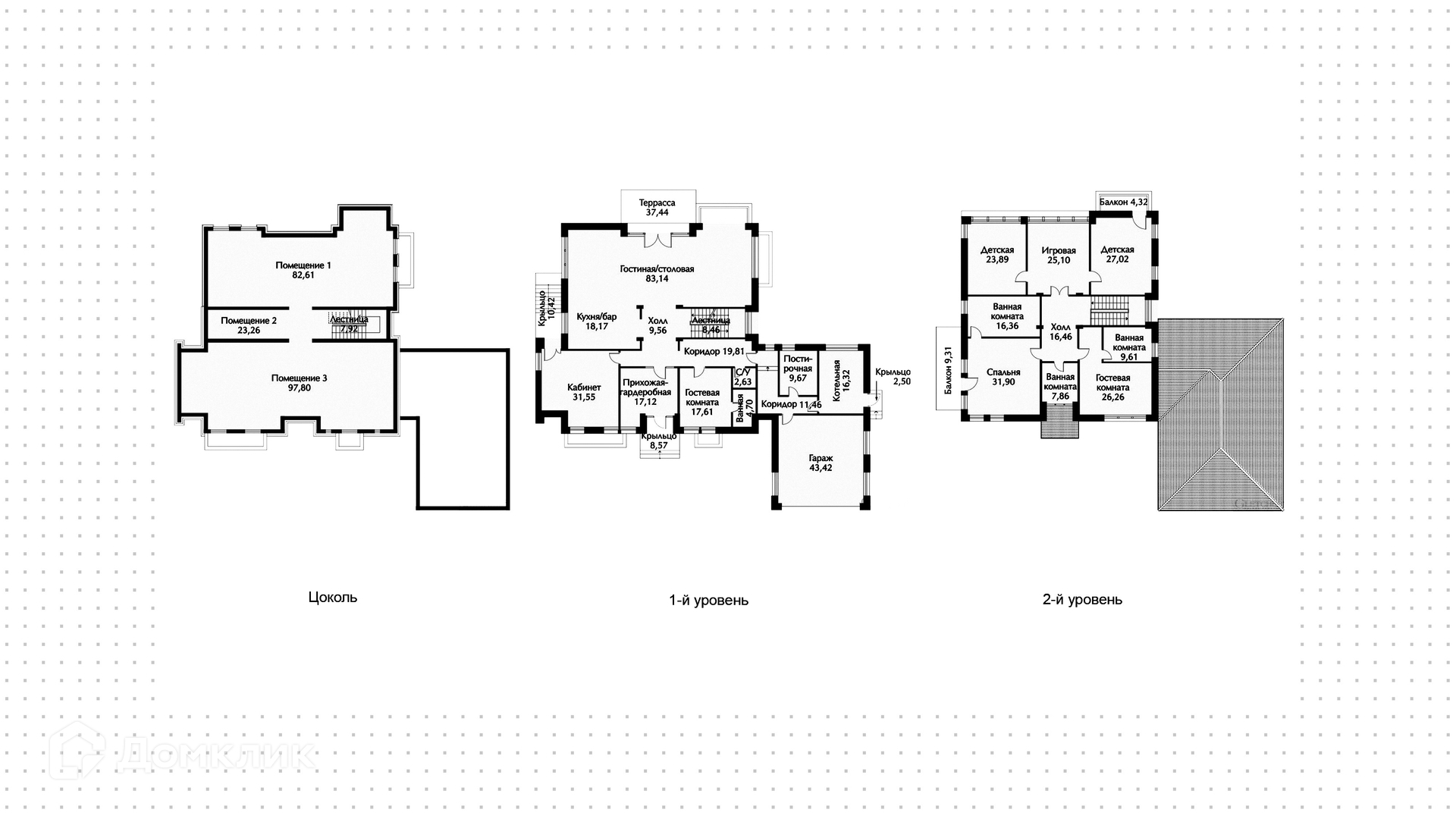 2-й уровень: 2 детских, спальня с ванной комнатой, гостевая комната с ванной комнатой, игровая.