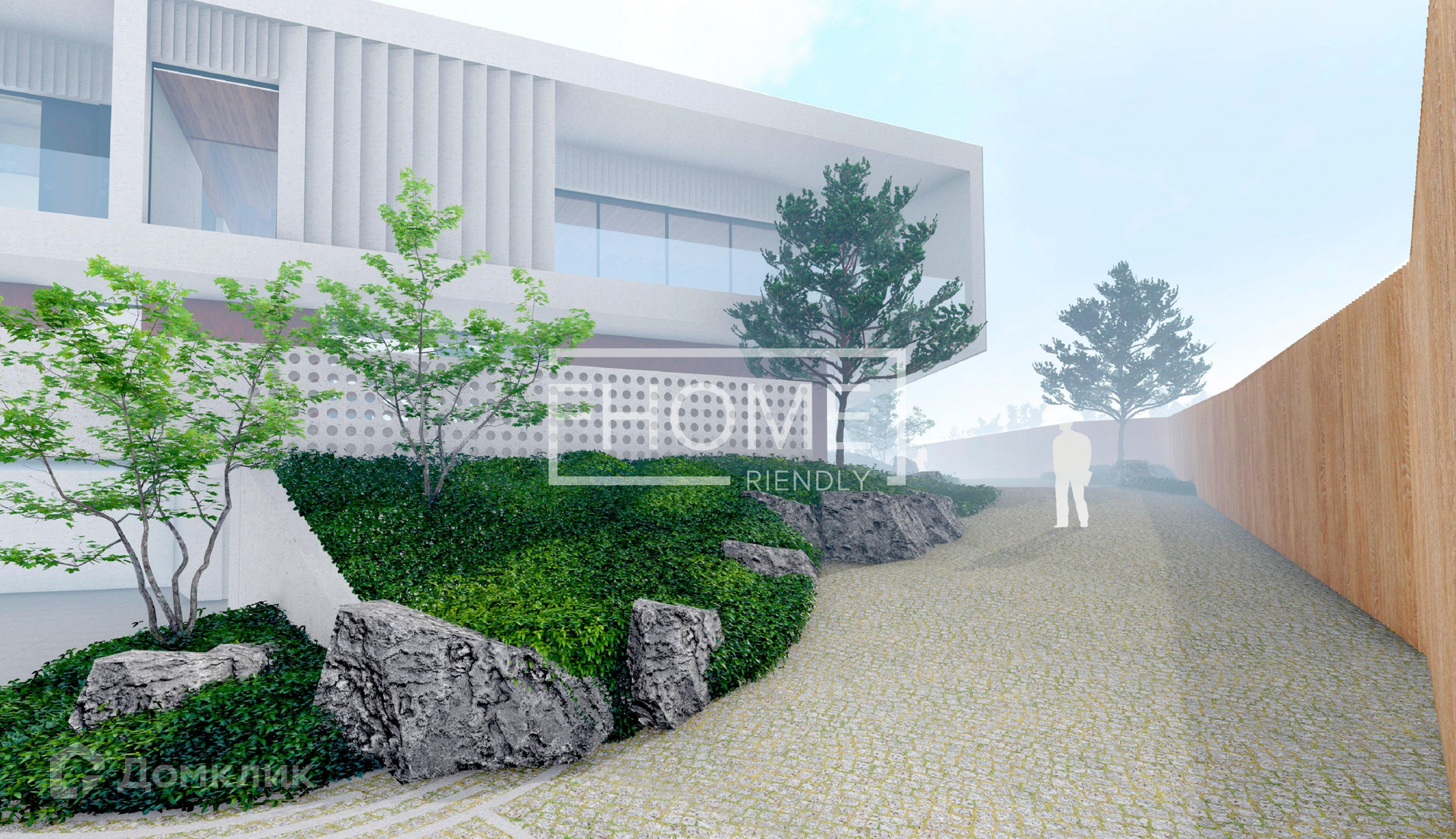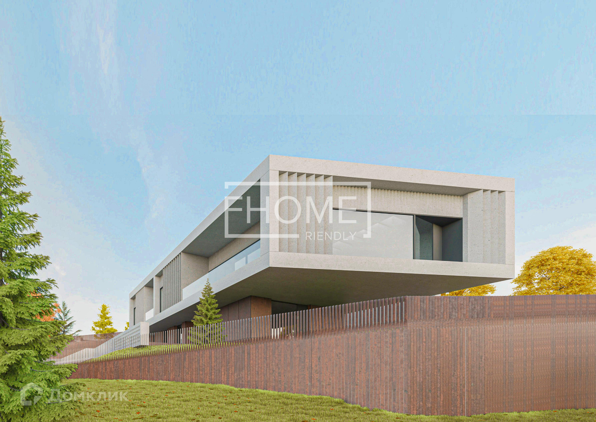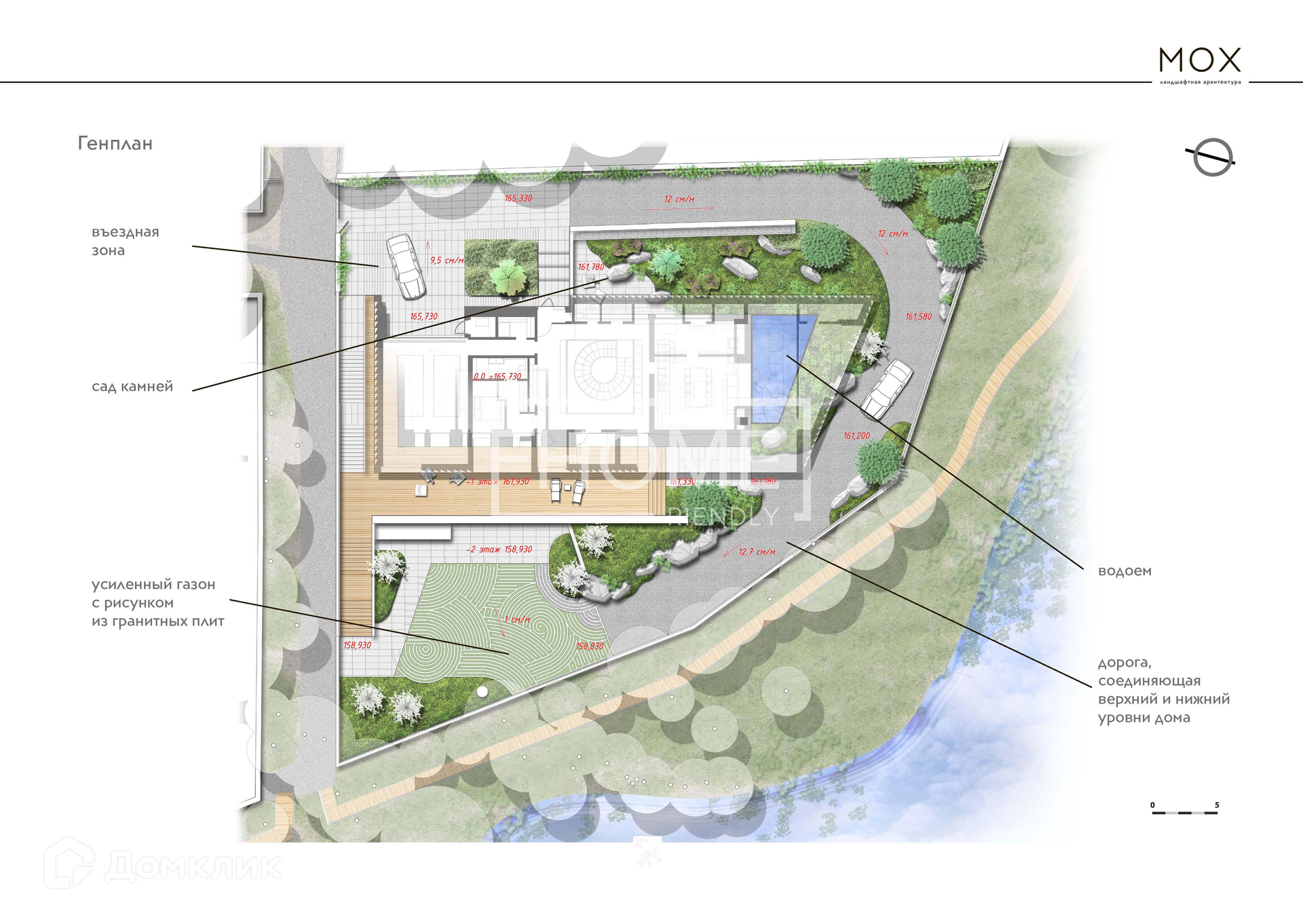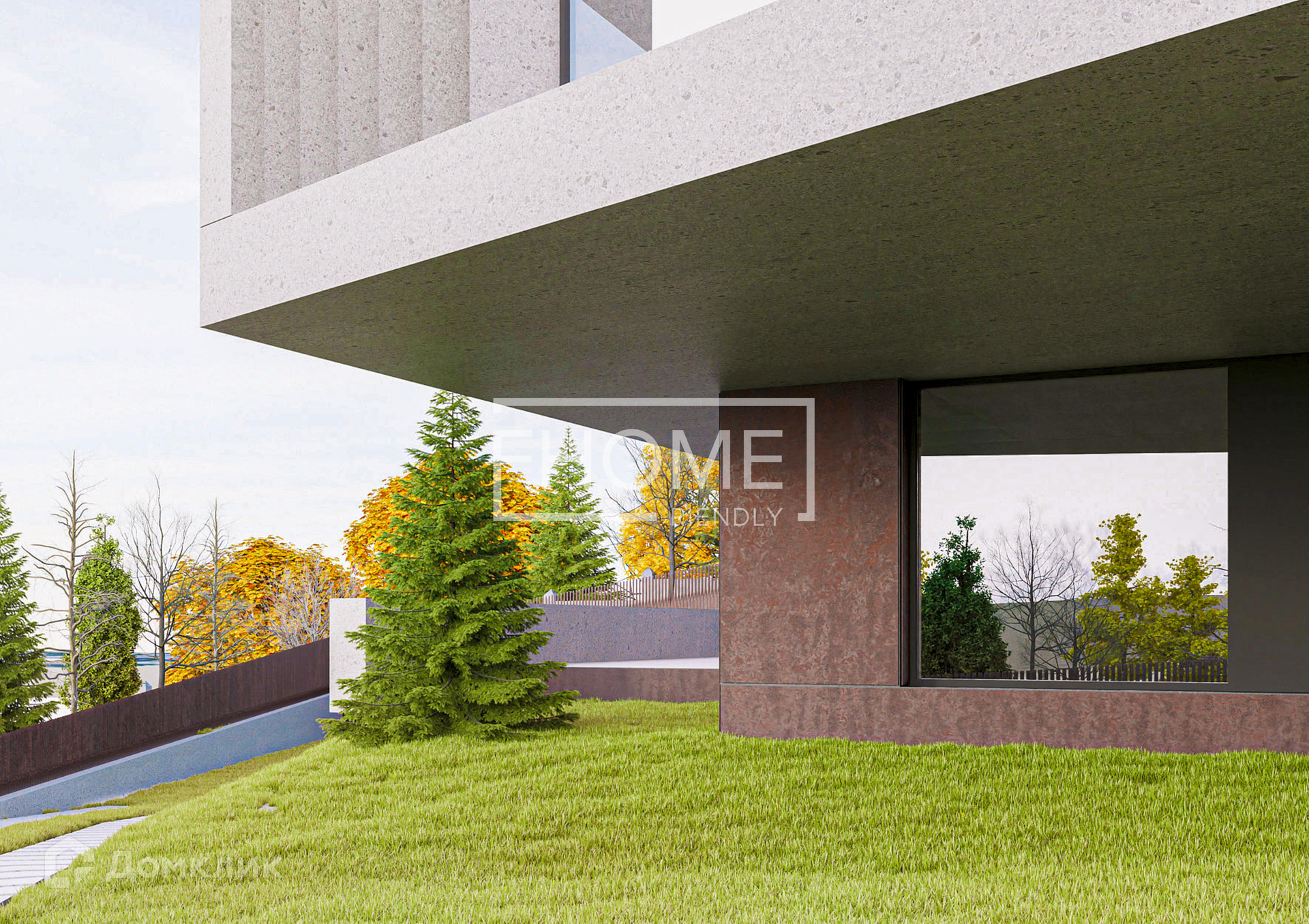 Монолитный проект разработан до мельчайших деталей, посажен на участок с учетом рельефа с перепадом высот.
