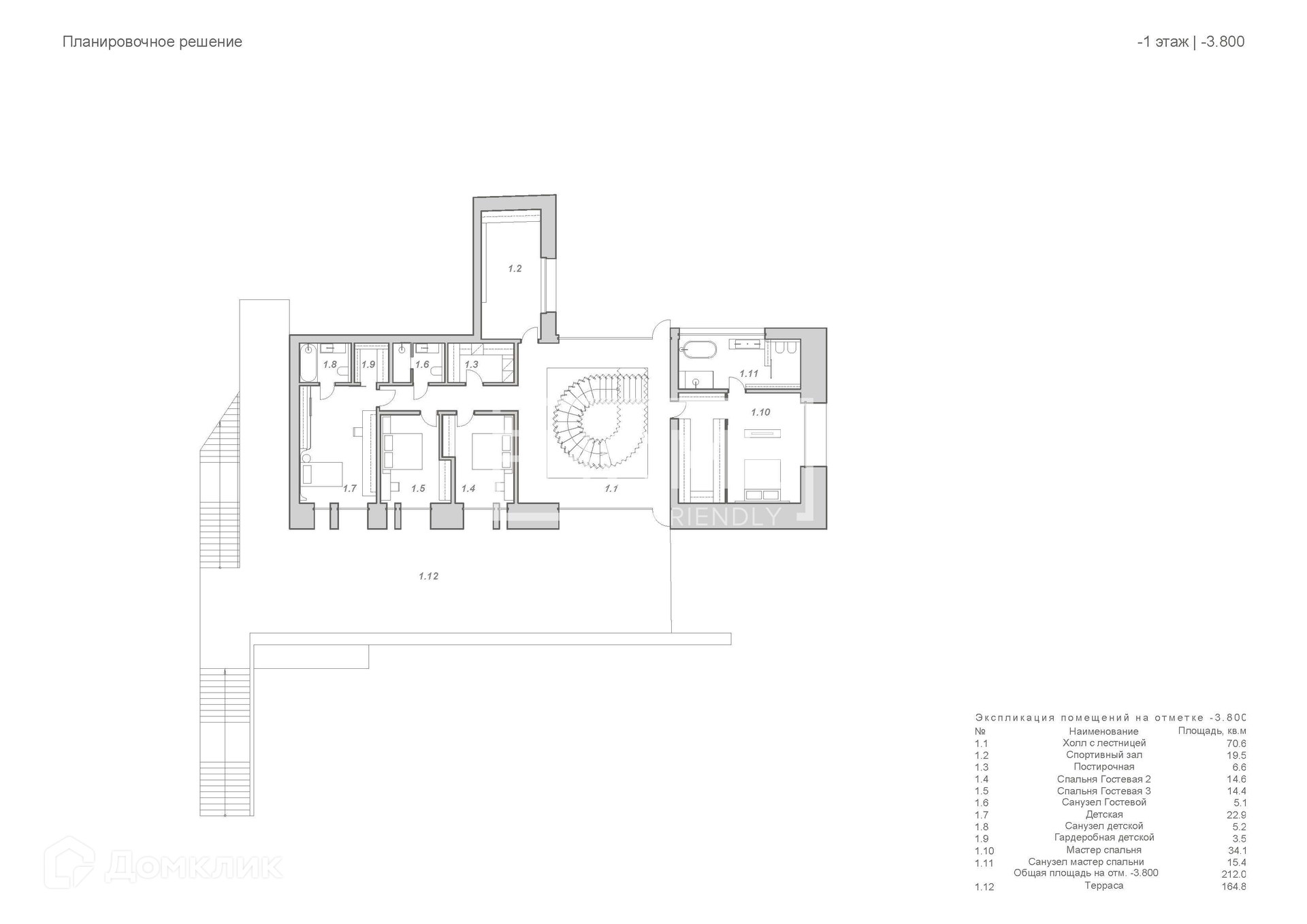 Средний уровень: мастер-спальня с санузлом и гардеробной, вторая спальня с санузлом и гардеробной, два детские спальни, санузел, спортивный зал c видом на сад.