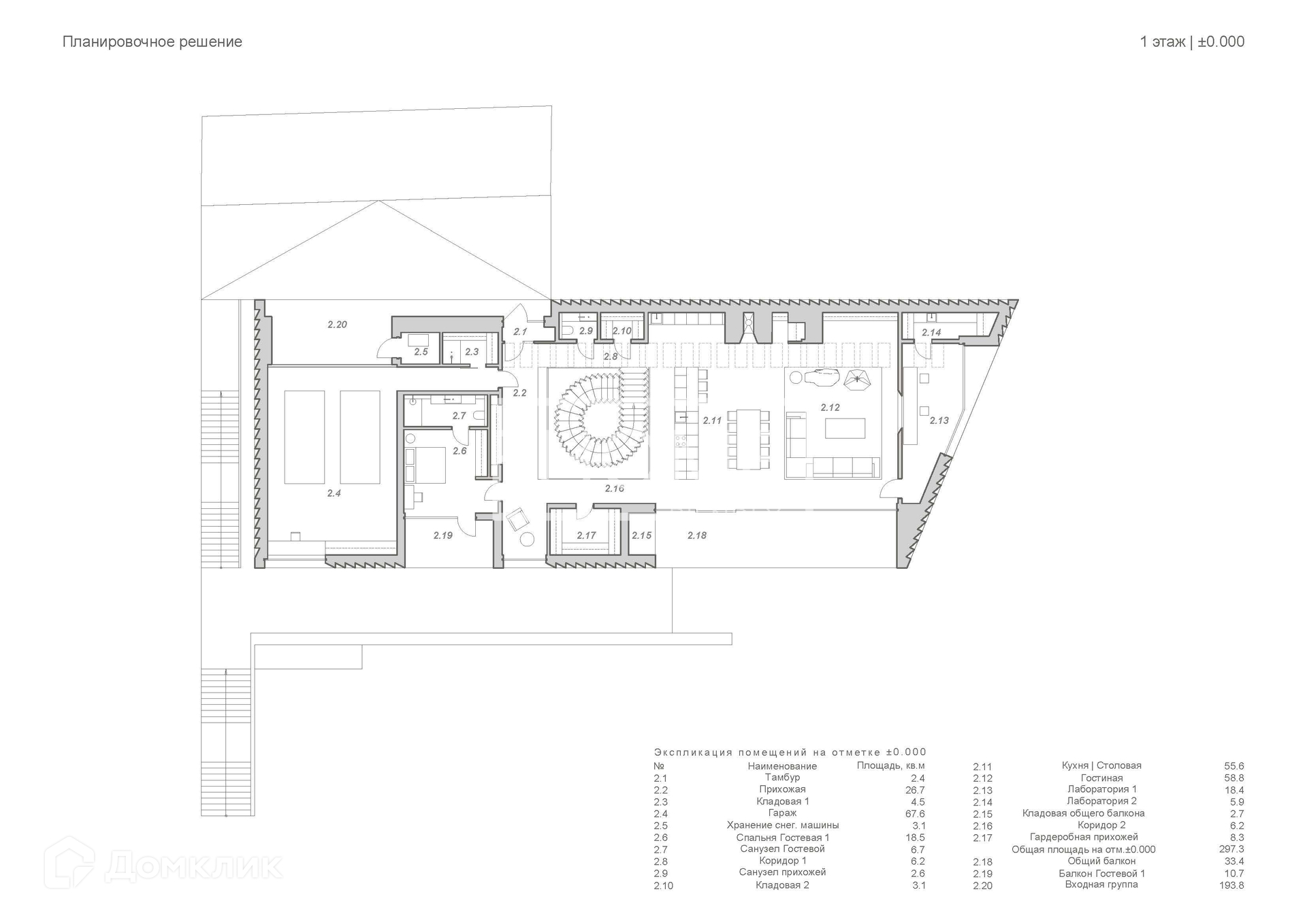 Верхний уровень: прихожая с гардеробной и санузлом, холл, просторная (более 100м2) гостиная – кухня – столовая с выходом на террасу с зоной барбекю, гостевая спальня с санузлом и выходом на балкон, кабинет, гараж на 2 автомобиля с зарядной станцией для электрокаров.