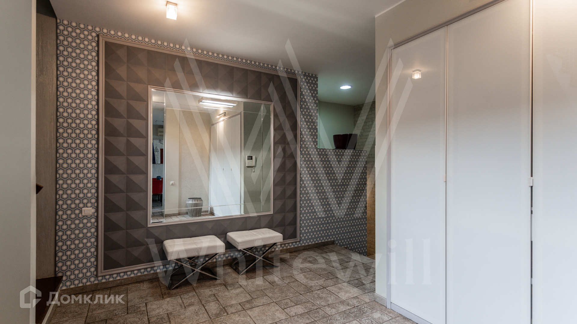 ID 11 674. Барвиха-2. Просторный таунхаус площадью 500 м² расположен на полевом участке 6,5 соток. Современный фасад облицован строгой серой штукатуркой в сочетании с красным клинкерным кирпичом. В отделке интерьера использованы молочные оттенки, фактура дерева, орнаменты и узоры. Планировка дома включает 4 спальни, уютную гостиную с камином, кухню-столовую и кабинет с выходом на участок. На территории засеян газон, высажены хвойные деревья, вымощены дорожки и обустроена зона отдыха на террасе.
