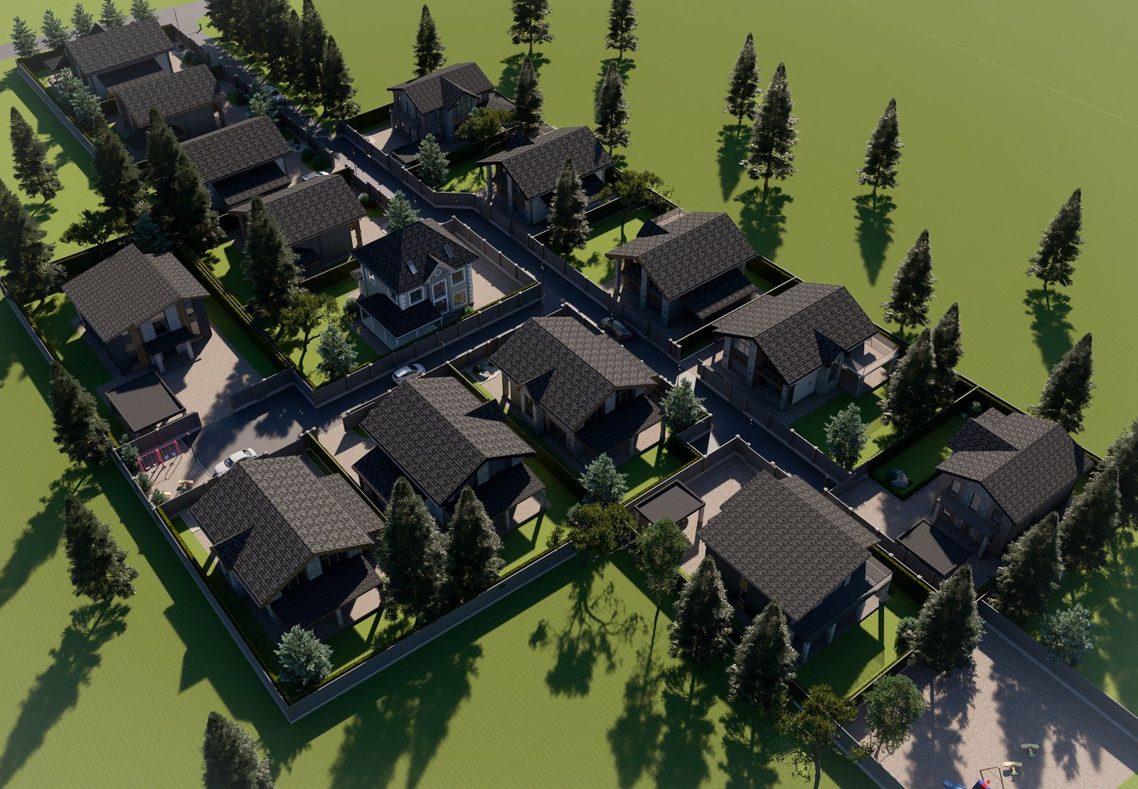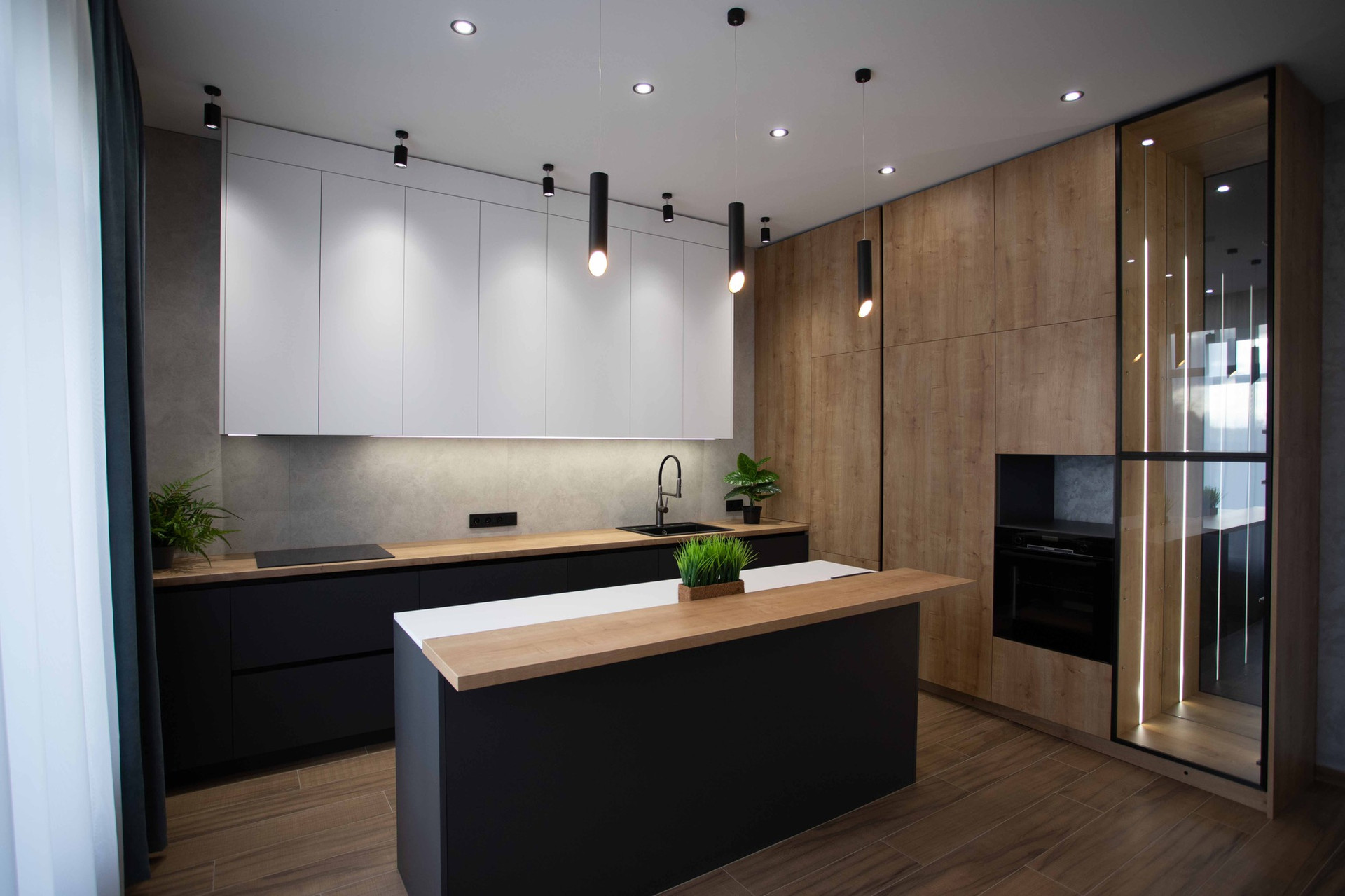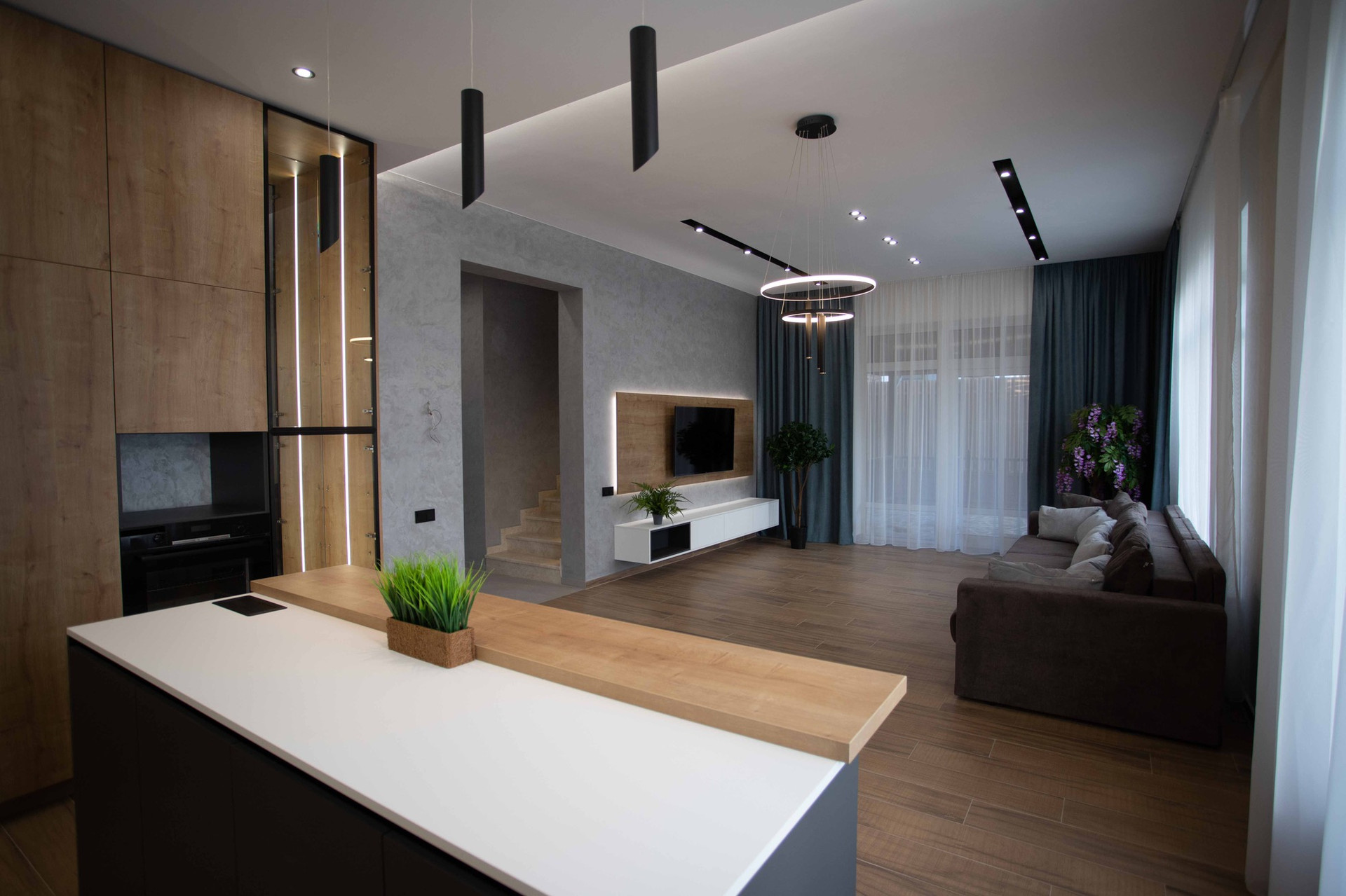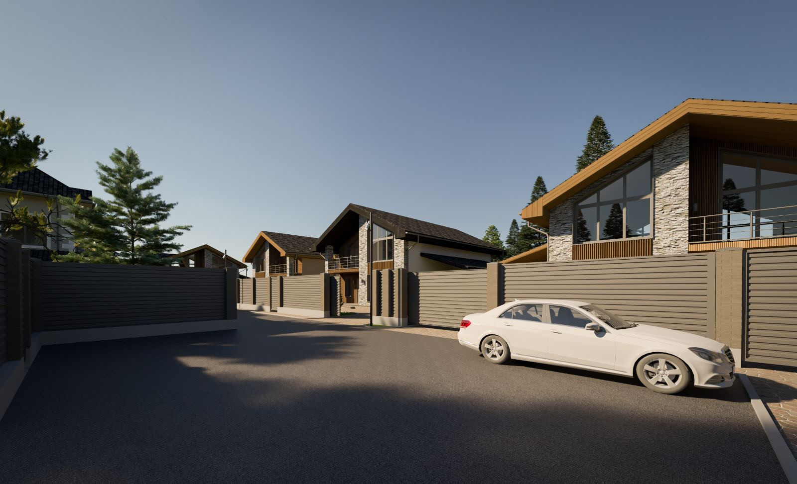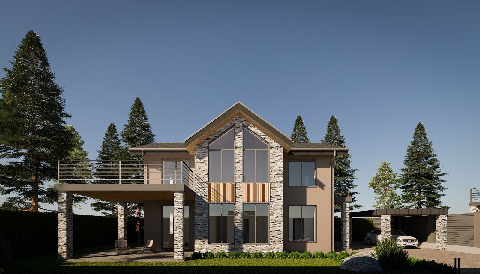 1-й этаж: Кухня-гостиная с выходом на просторную веранду и панорамным видом на участок, комната на первом этаже, санузел, гардеробная, бойлерная;