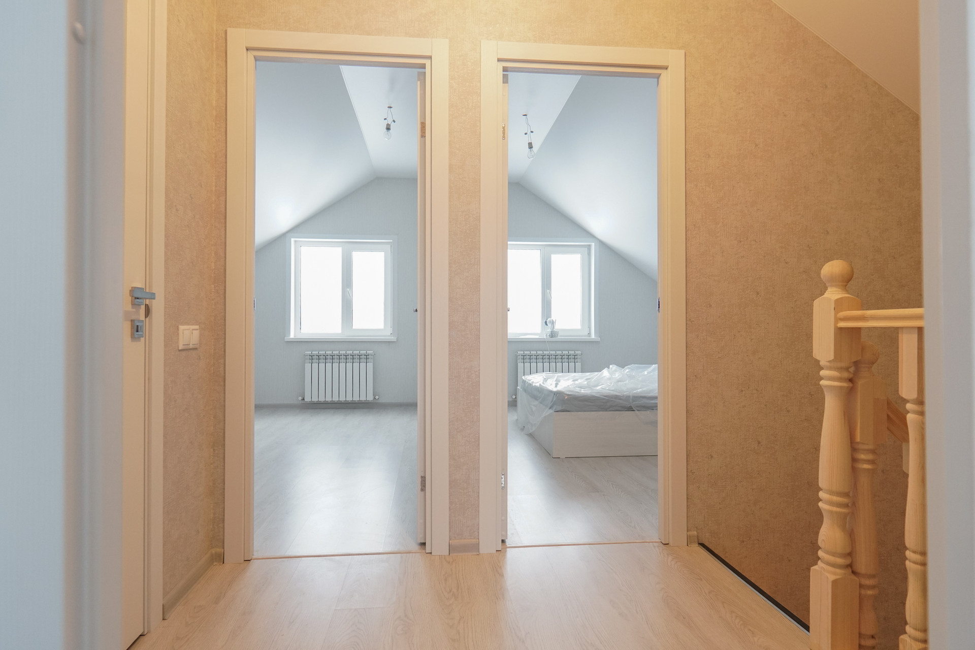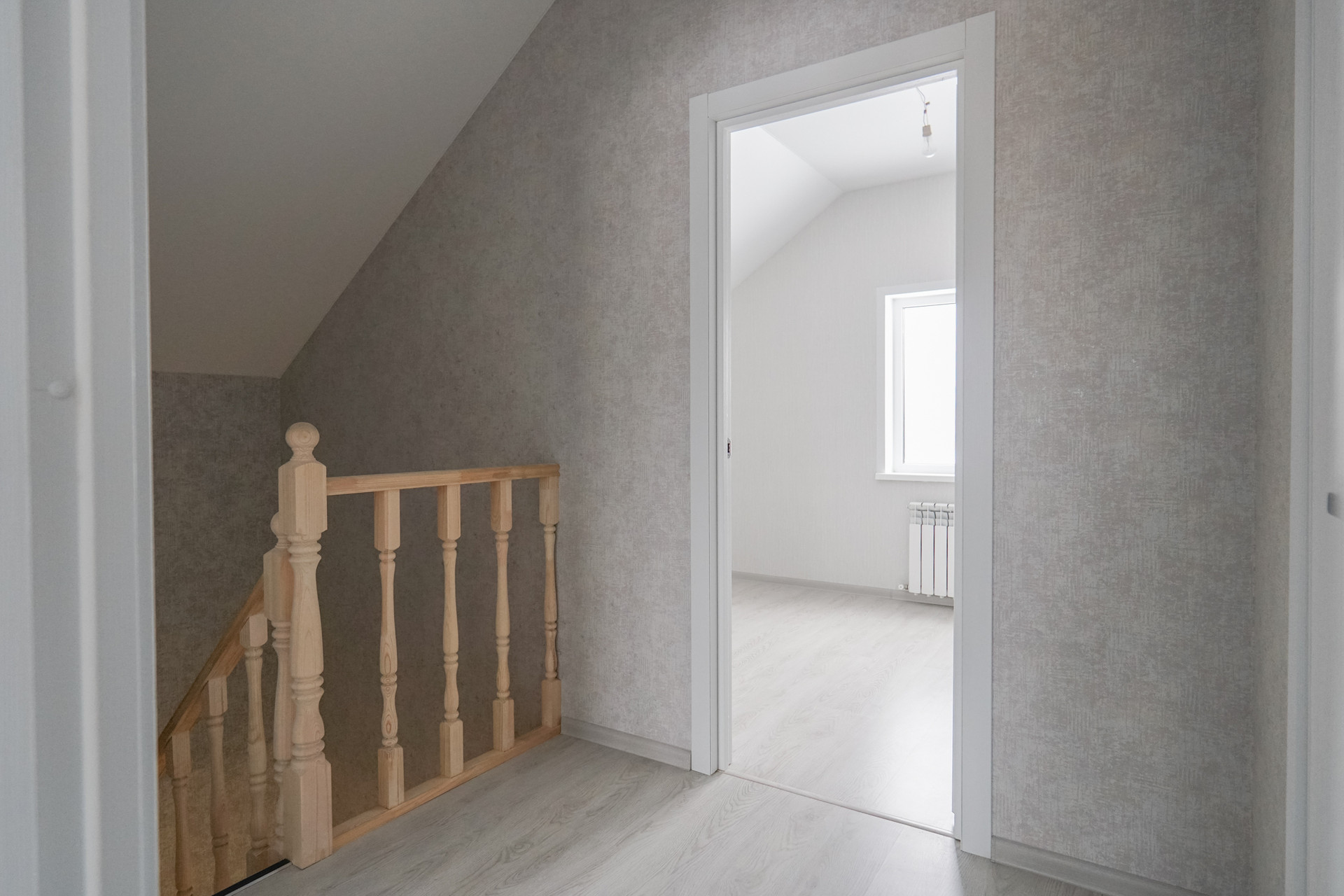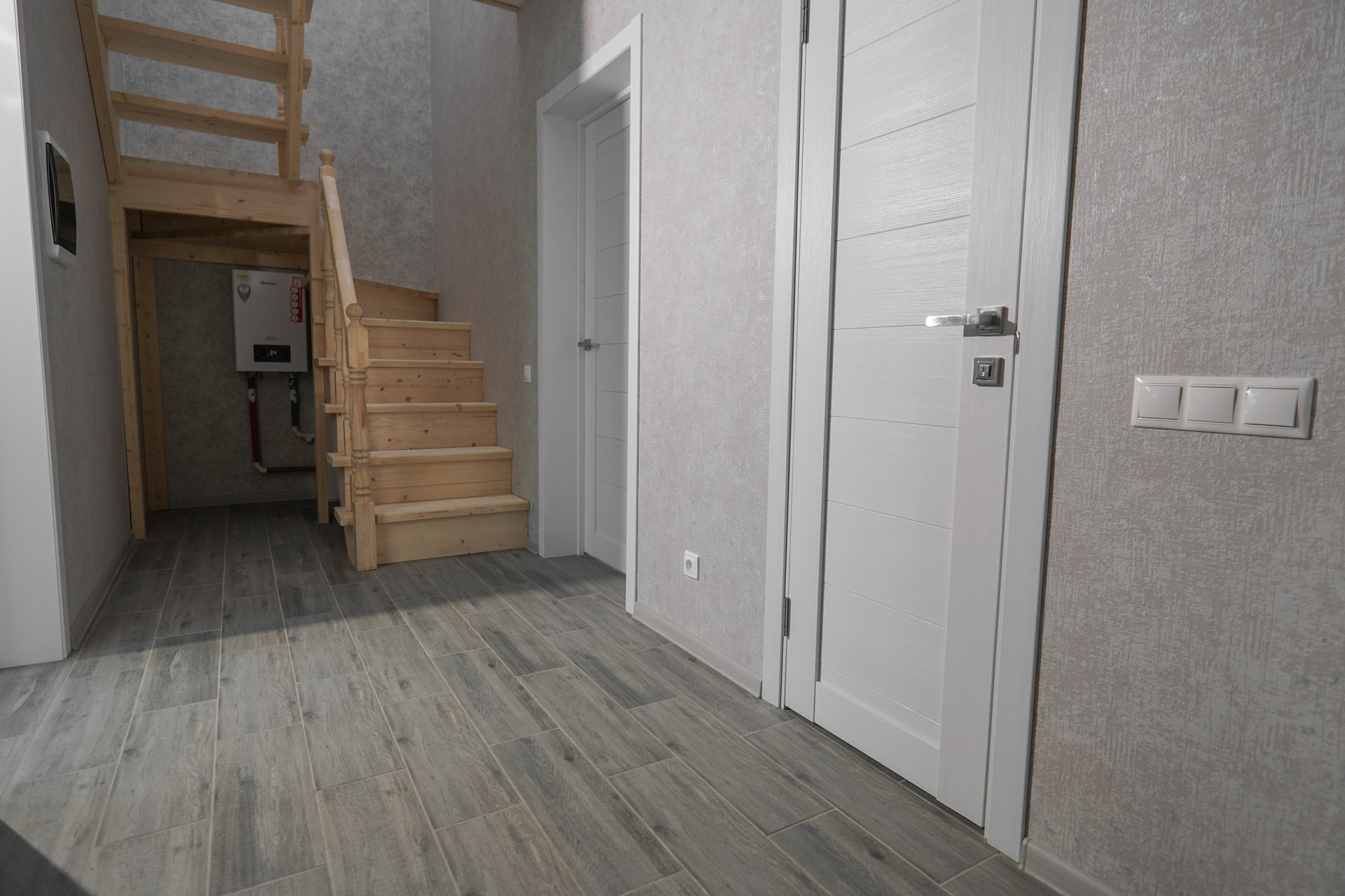 В доме два этажа. Первый этаж - кухня-гостиная, санузел, комната. Второй этаж - три комнаты, санузел.