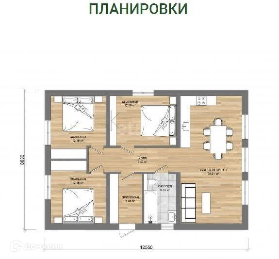 Дом площадью 90 кв.м. имеет удобную планировку: 3 спальни, санузел, котельная. Местом встречи всей семьи станет кухня-гостиная 29 кв.м. с выходом на террасу.