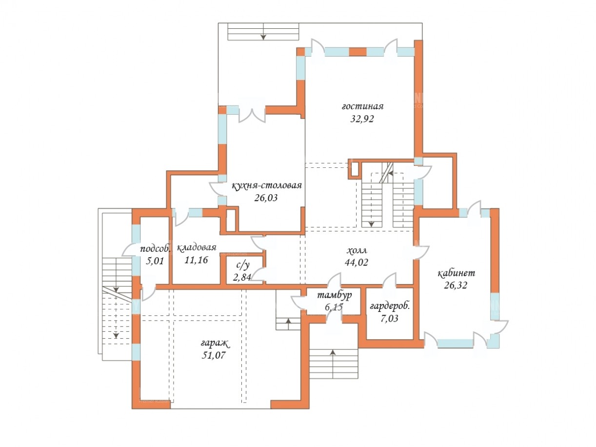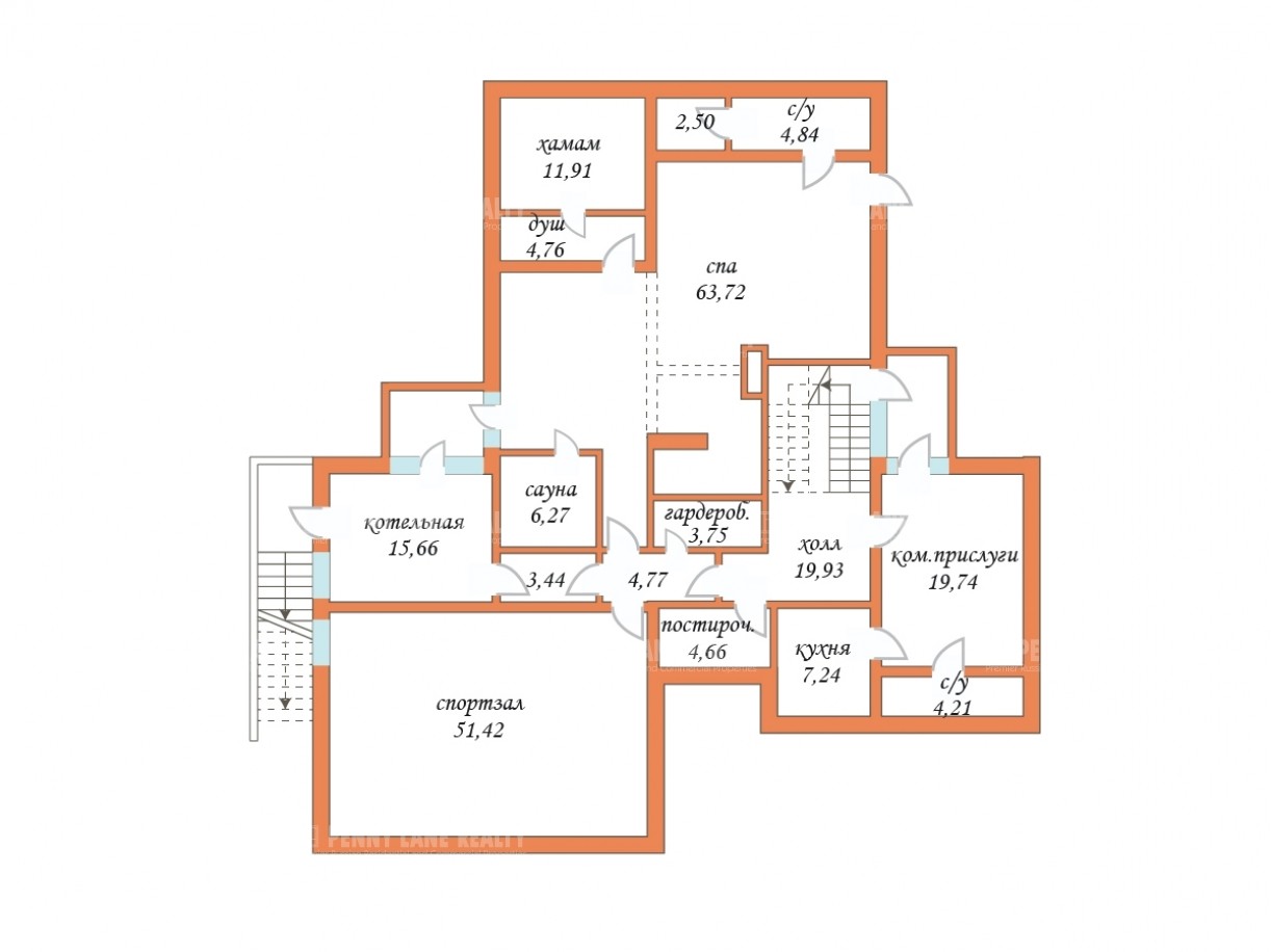Цоколь: холл, спальные апартаменты (2 комнаты, с ванной), спортивный зал, гардеробная для спортзала и СПА-зоны, хамам, джакузи, финская сауна, зона отдыха с барной стойкой и ТV, 2 душевые с с/узлом, техпомещения - бойлерная с приточно-вытяжной установкой с отдельным выходом из дома.