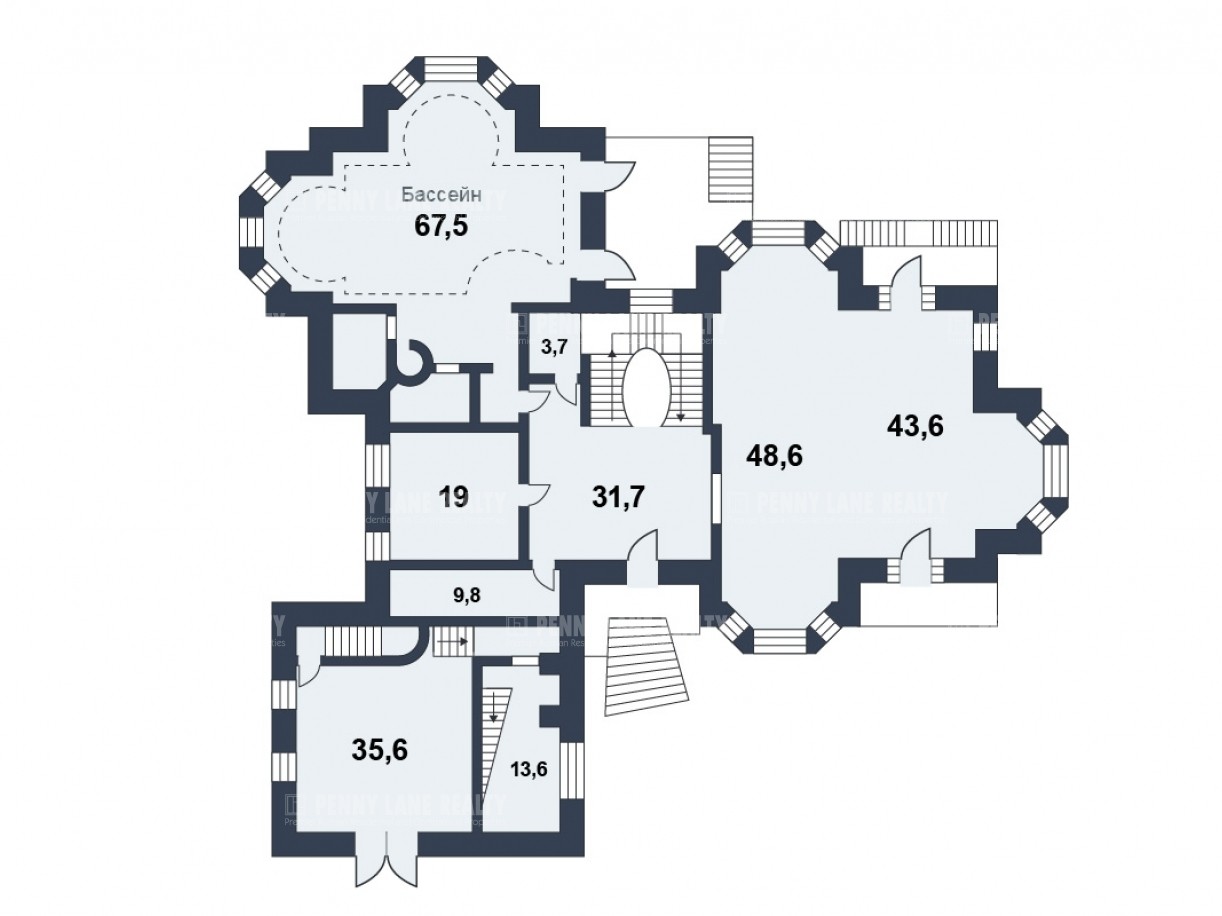 1 этаж: гостиная с камином, спальня с выходом на балкон, кухня-столовая, зимний сад, тренажерный зал, с/у, бойлерная.