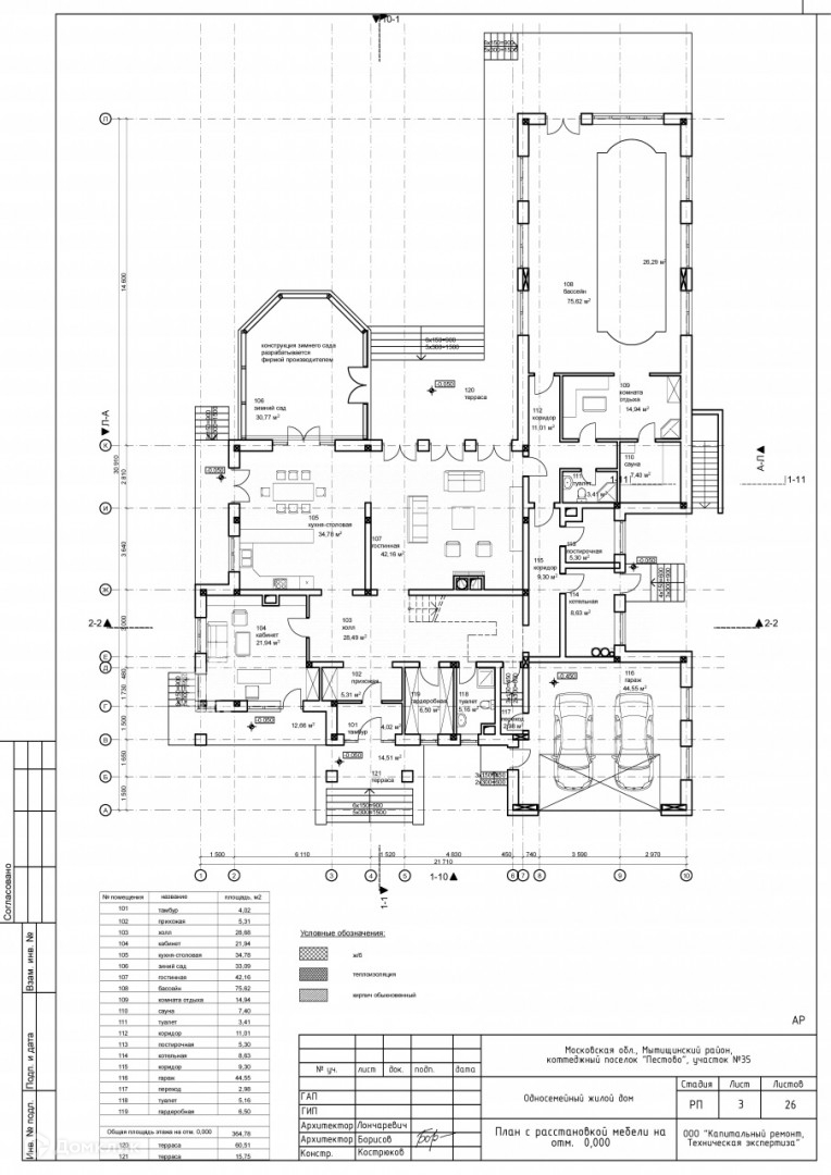 Первый этаж – Холл, кабинет, кухня-столовая, гостиная-каминнная, бассейн, сауна с комнатой отдыха, с/у, гардеробная, котельная.