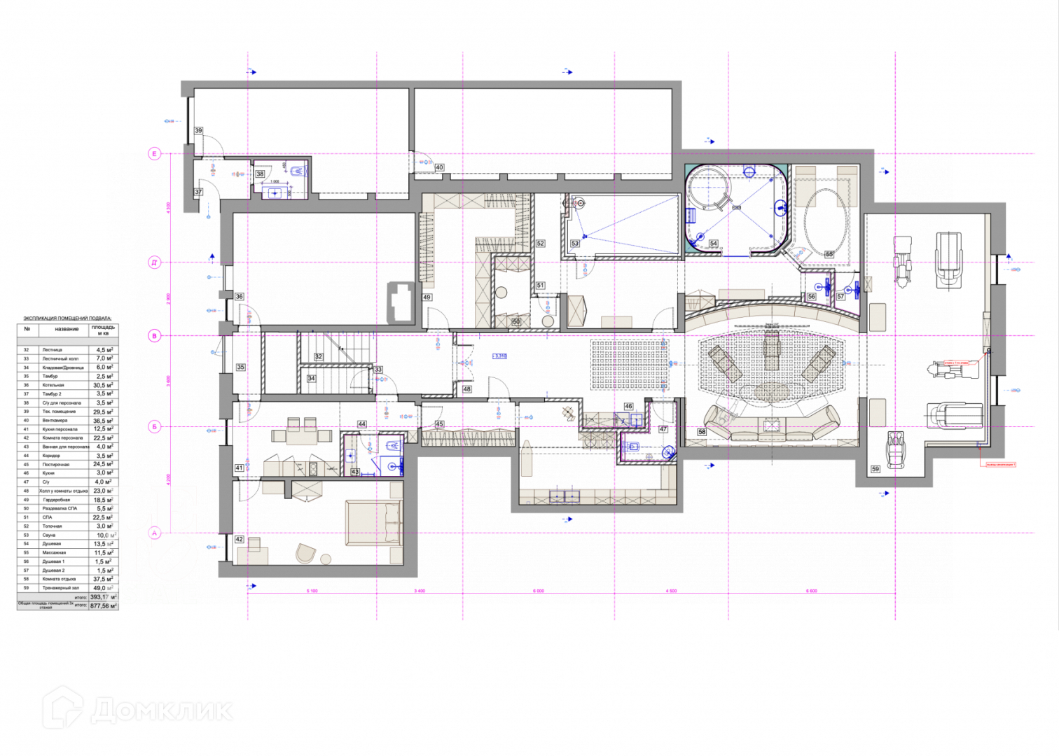 Лестница, лестничный холл, кладовая/дровница, тамбур, котельная, тамбур 2, с/у для персонала, тех. помещение, венткамера, кухня персонала, комната персонала, ванная для персонал, коридор, постирочная, кухня, с/у, холл у комнаты отдыха, гардеробная, раздевалка СПА, СПА, топочная, сауна, душевая, массажная, душевая 1, душевая 2, комната отдыха, тренажерный зал.