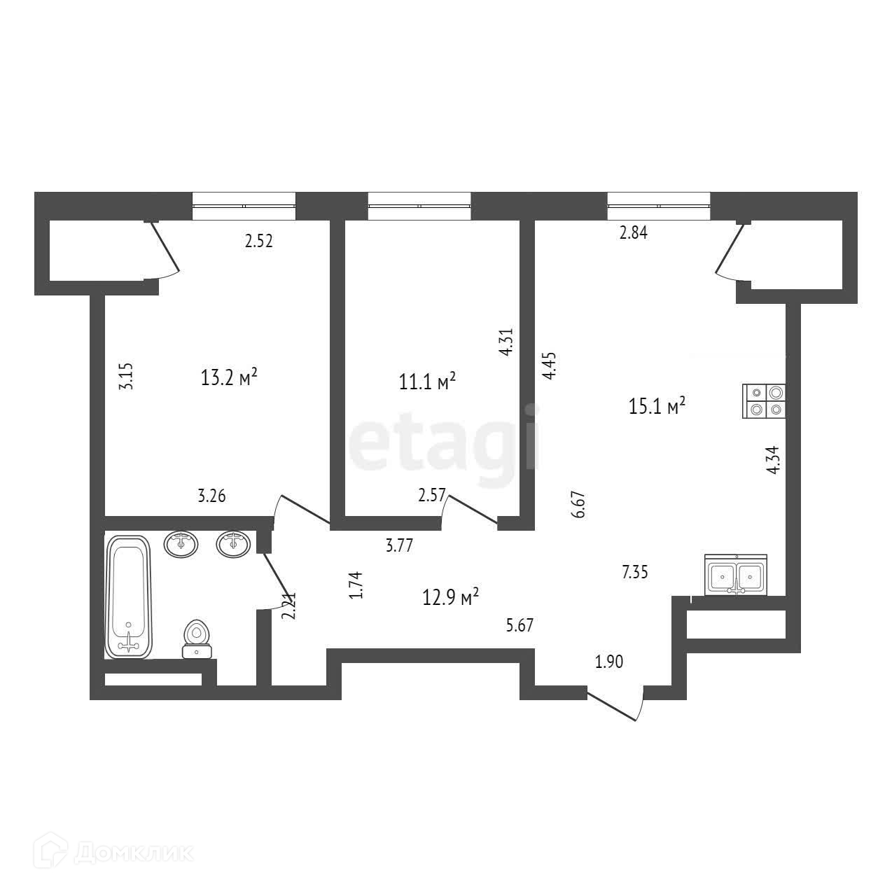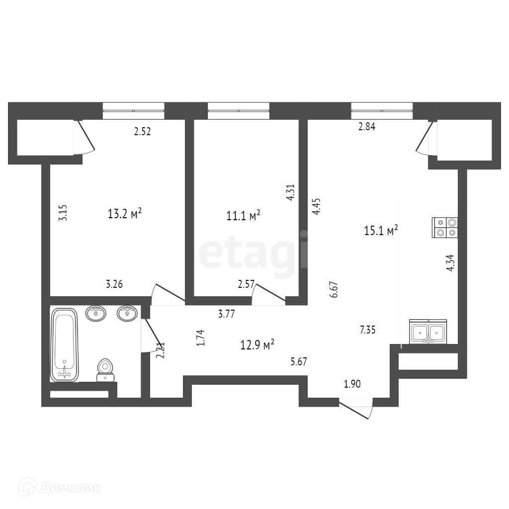Планировкой предусмотрены: кухня-гостиная площадью 27 м2, спальня взрослая, спальня для детей, санузел совмещен. Квартира никаких вложений не требует.