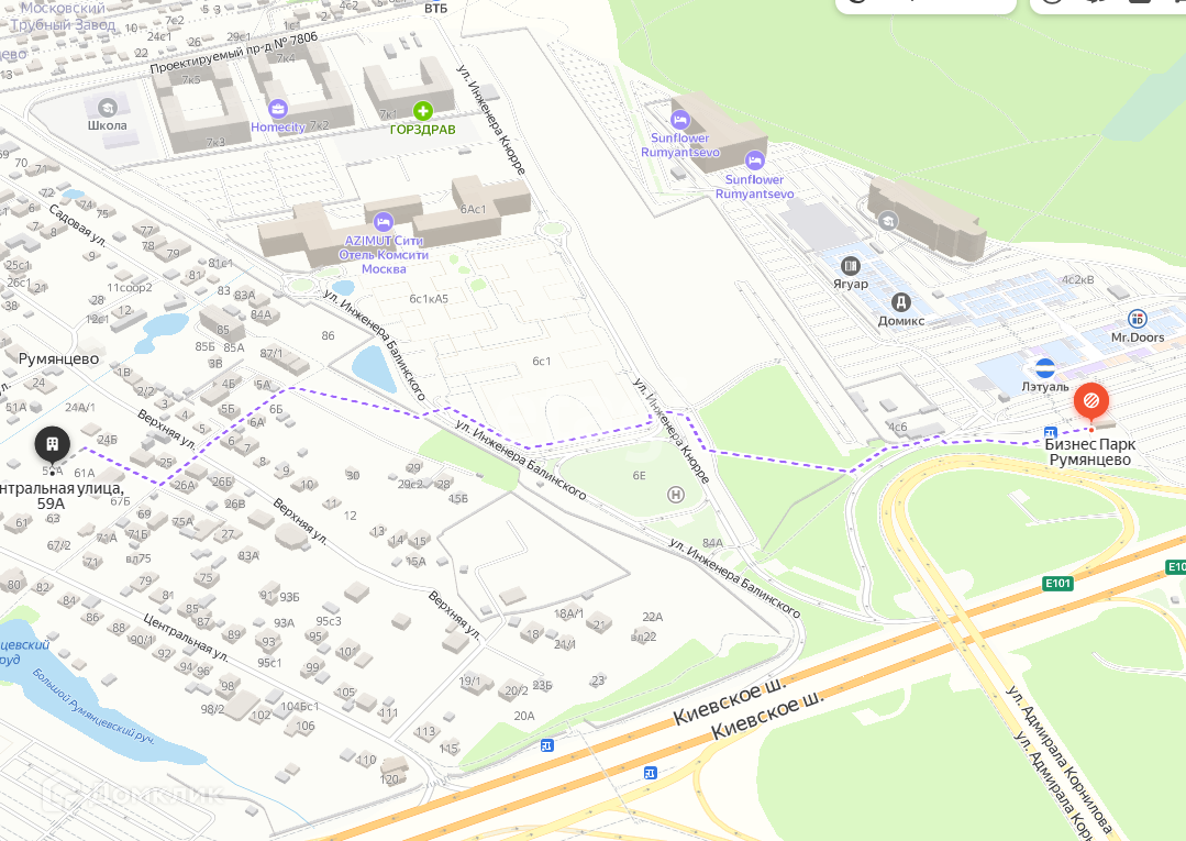 Заезд с Киевского ш (4км от МКАД). От м Cаларьево, Солнцево - 15 минут (5,4км) на личном транспорте. В шаговой доступности находятся: торговый центр Family Room, Румянцевский пруд, школа и детский сад. Так же рядом находится Тропарёвский лесопарк.