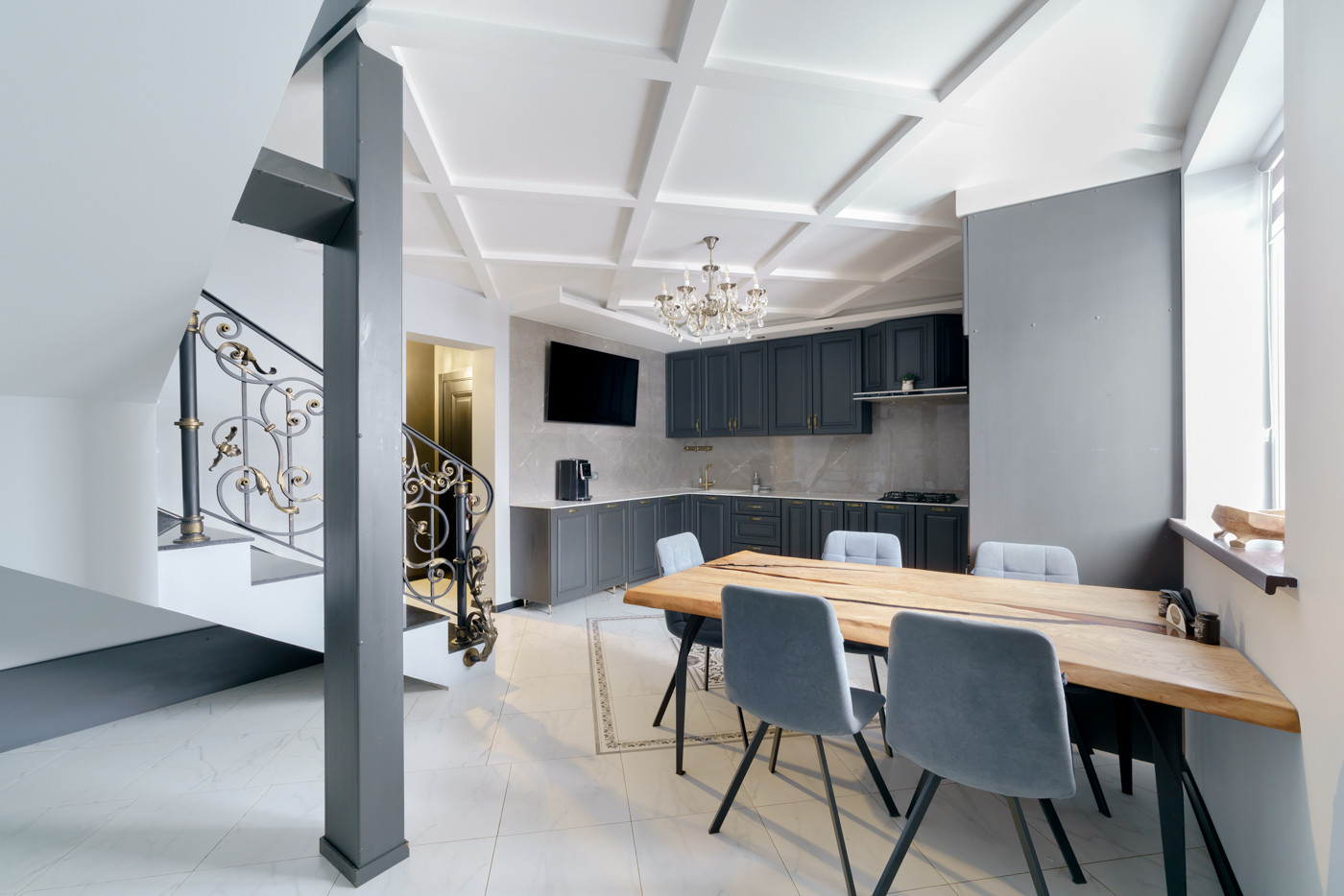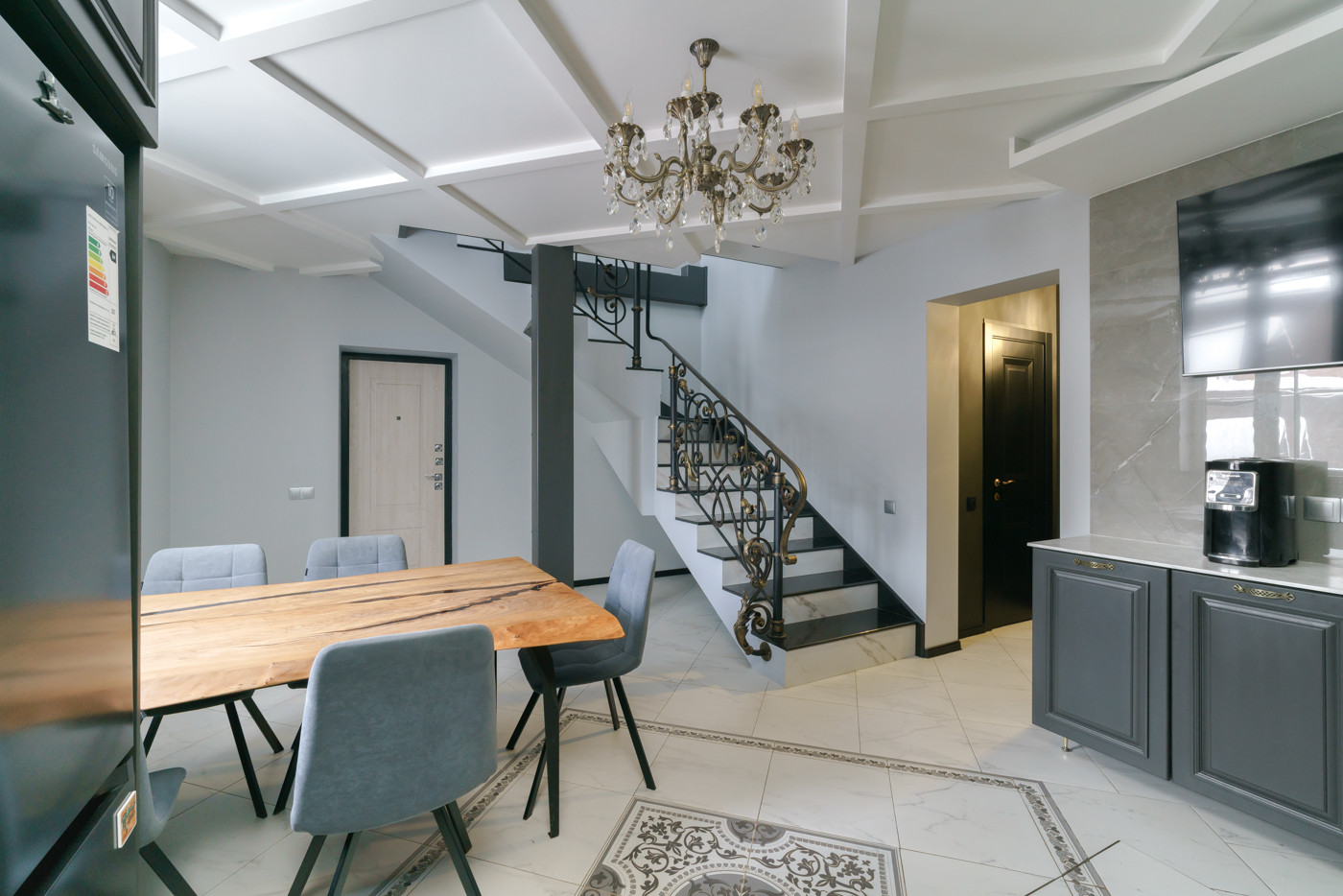 Отдельное внимание хотелось бы уделить лестнице, которая является сердцем дома. Это дорогой авторский проект, где каждая ступень выполнена из натурального камня, а перила выкованы вручную, каждый элемент, каждый лепесток.