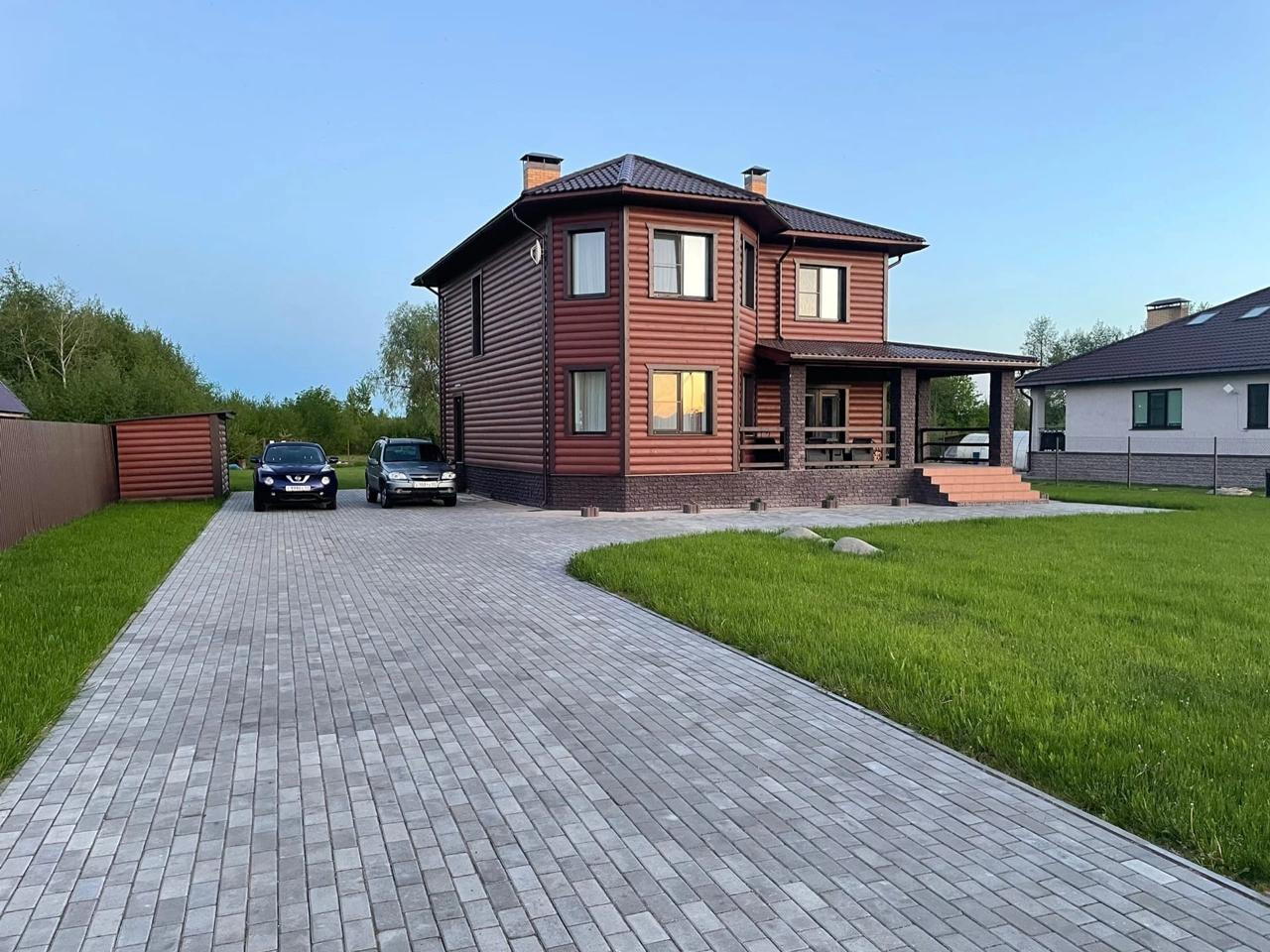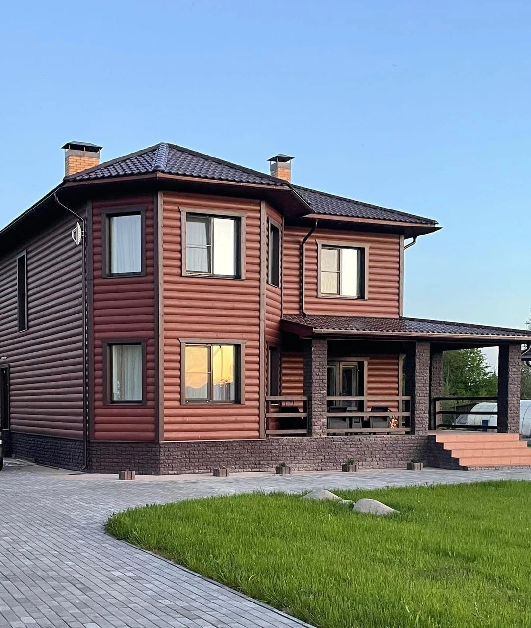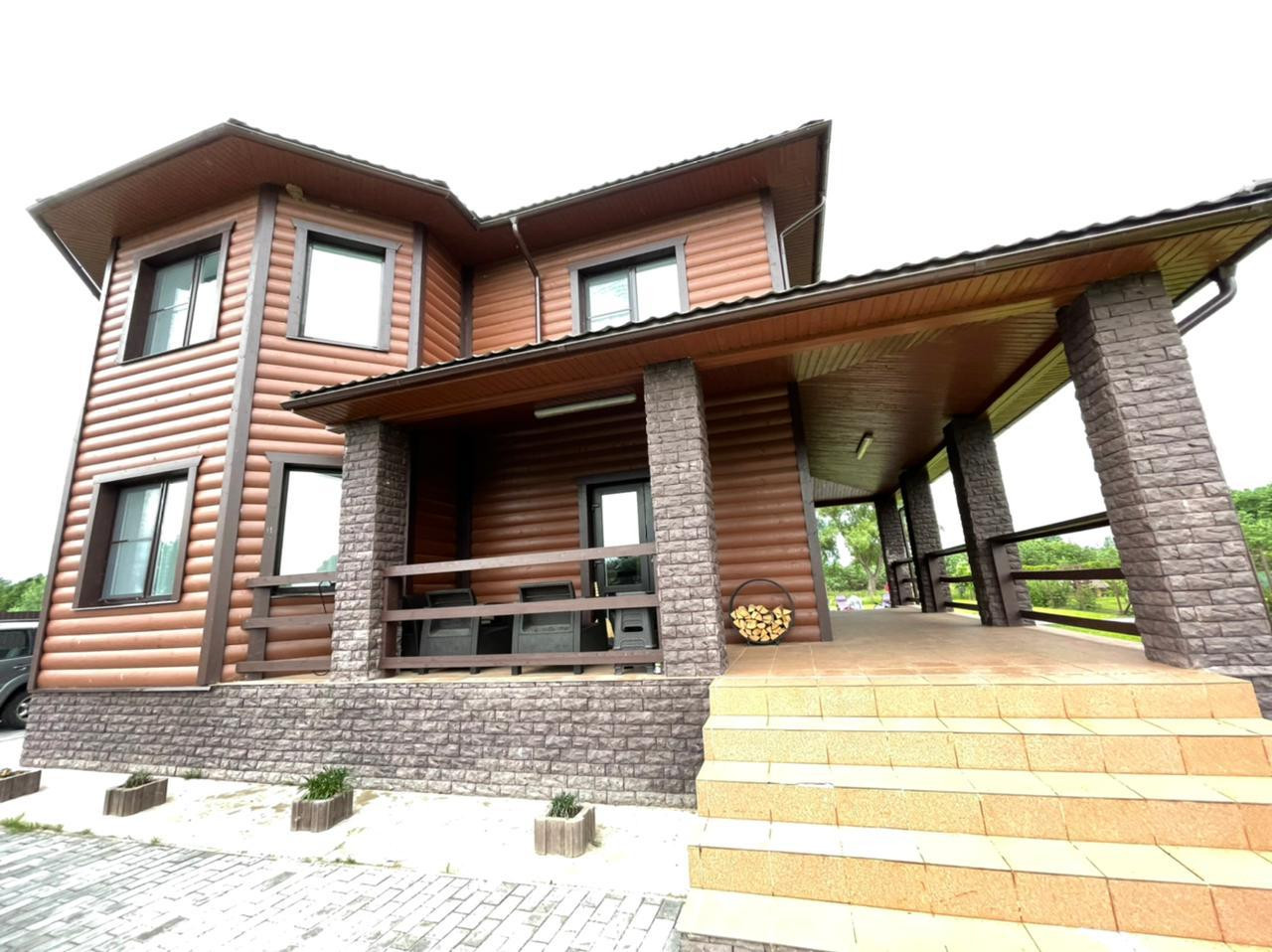 Построен из пескоцементных блоков, облицовка-блокхаус.