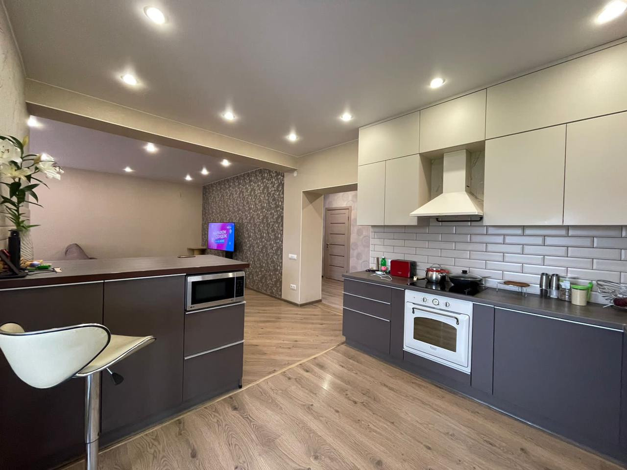 На кухне встроенная бытовая техника: плита, духовка, вытяжка, посудомоечная машина.
