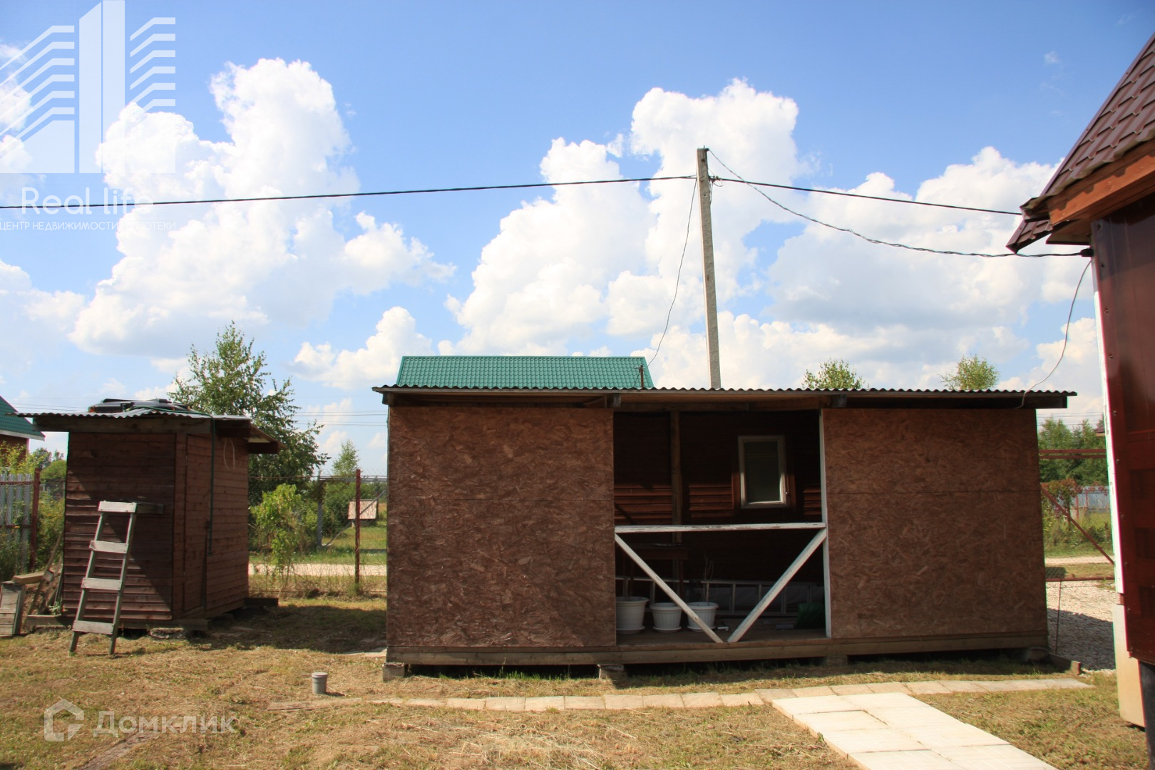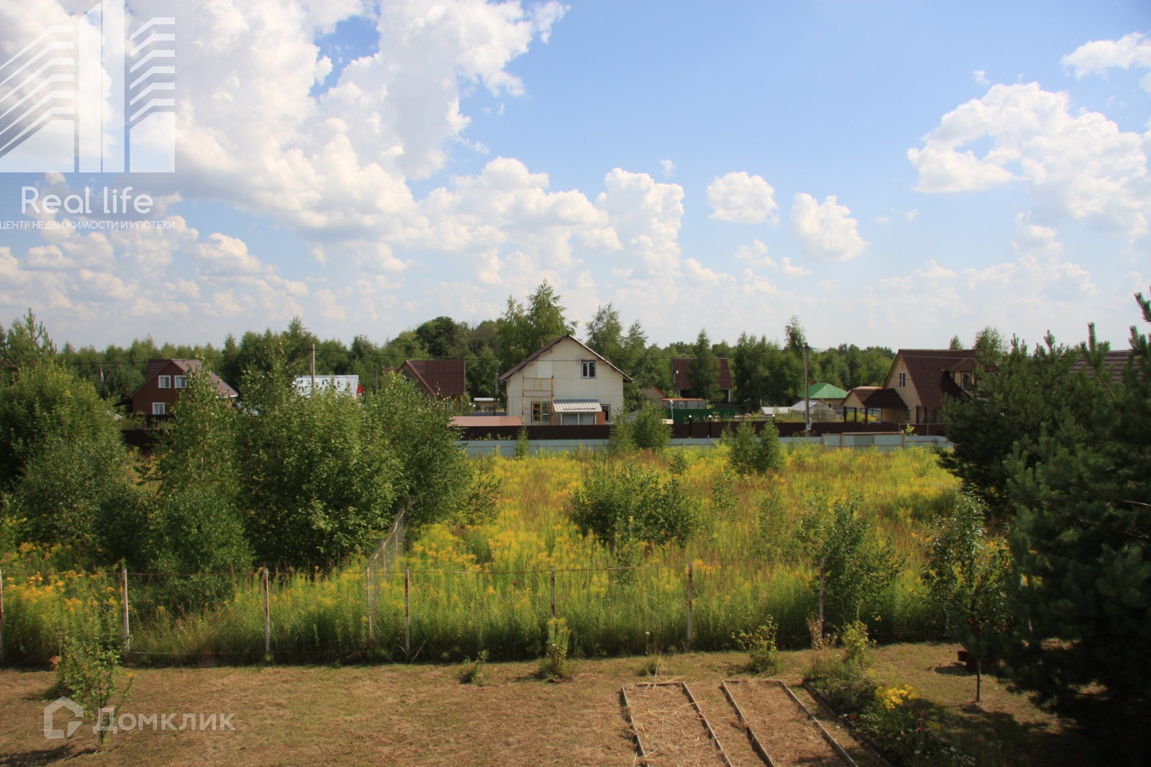 Участок ровный, квадратный. Огорожен забором из рабицы. На участке дополнительные постройки: парник, летний душ, веранда.