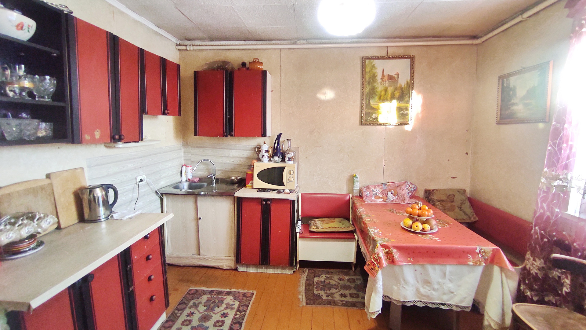 Теперь непосредственно к дому, он построен в 1995 году, на монолитном ленточном фундаменте, полностью кирпичный, снаружи и внутри поштукатурен, в комнатах обои, санузел частично в плитке, кухня пластиковые панели.
