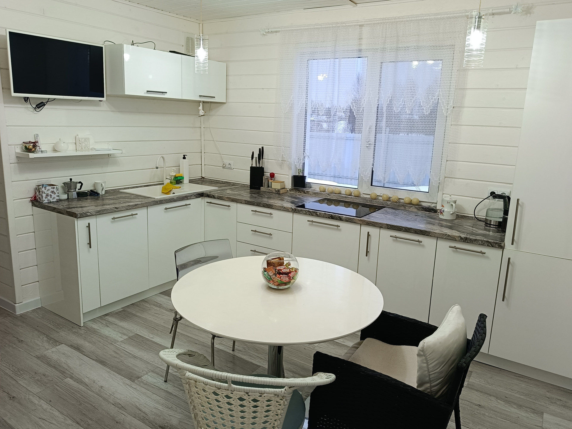 Техника: 3 телевизора, посудомоечная машина, стиральная машина, холодильник, варочная поверхность.