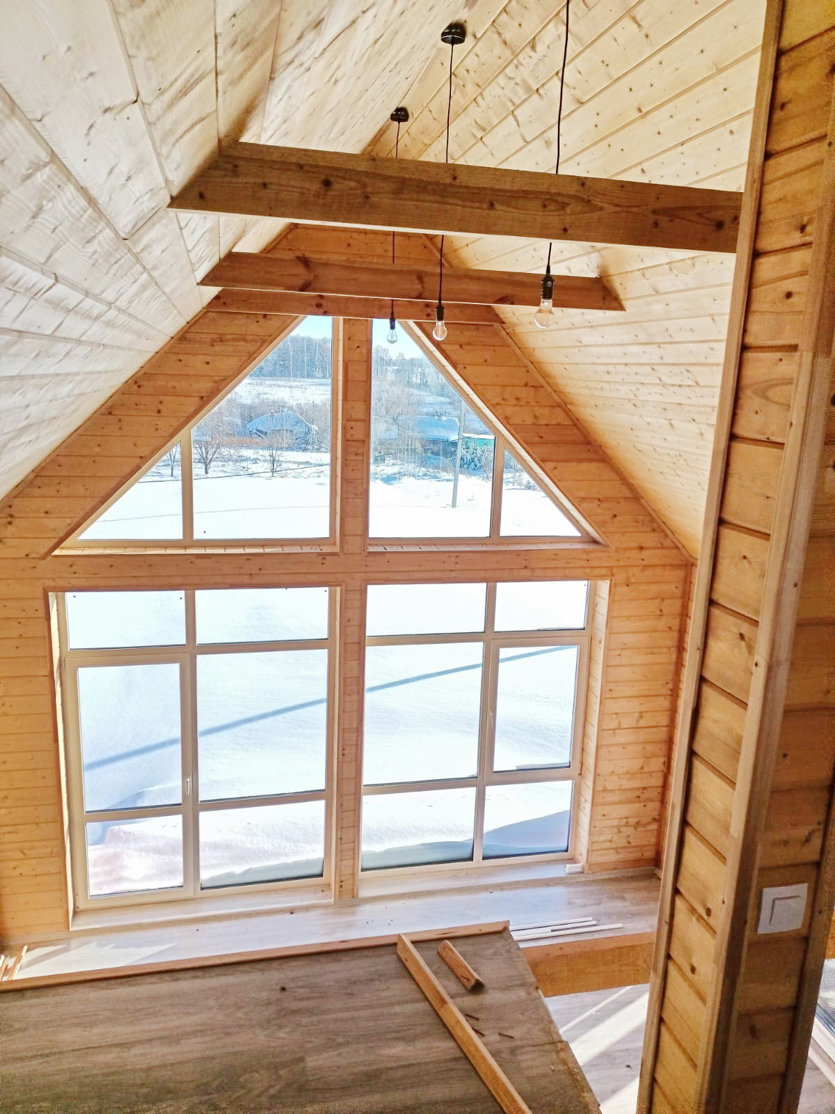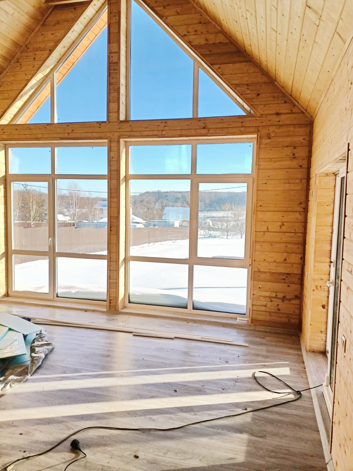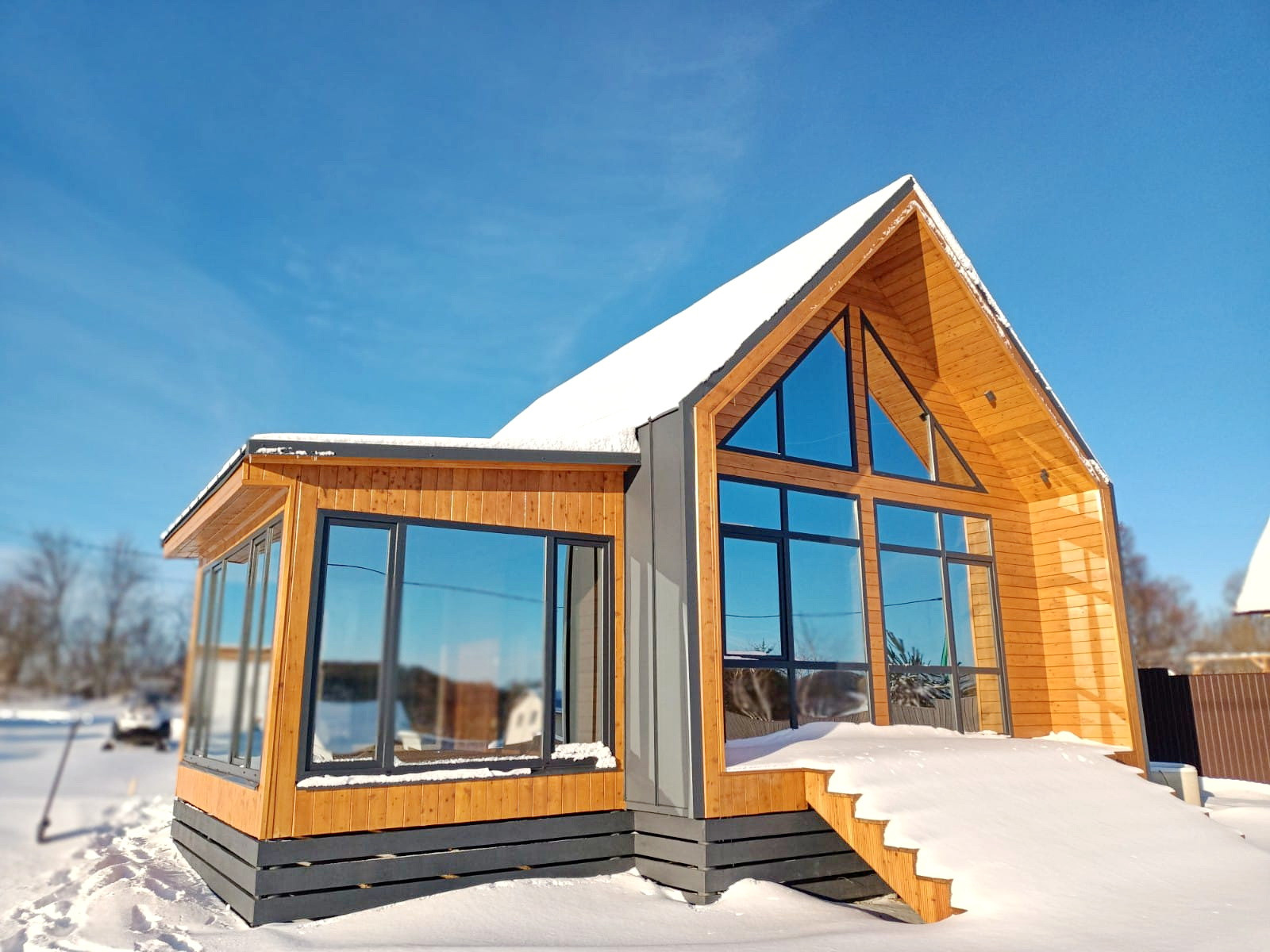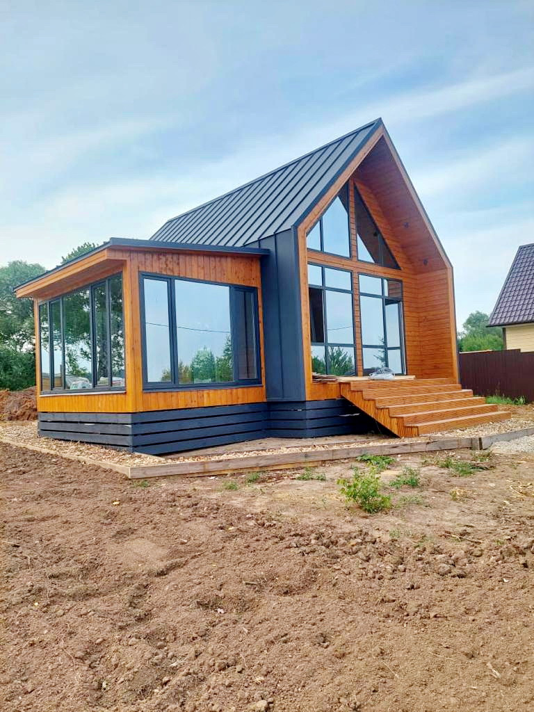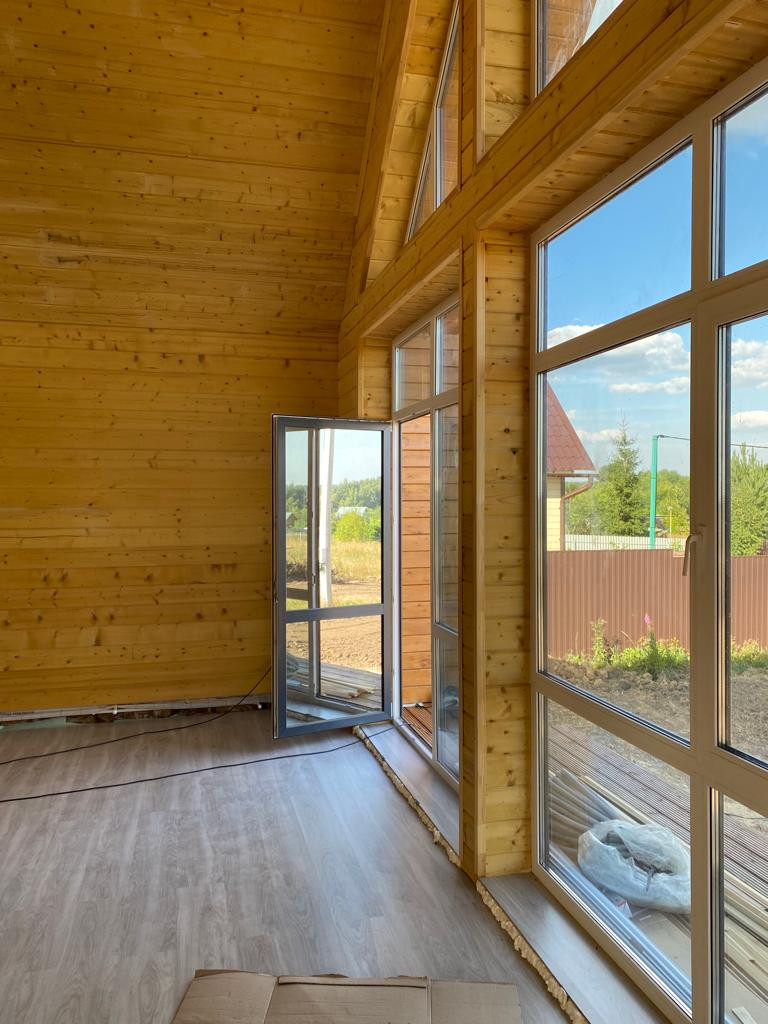 Панорамные окна дают очень много света и простора в доме, они выполнены с ламинацией под фасад дома, и не только красивые, но и спасают летом от жары так как имеют специальное покрытие для защиты от ультрафиолета.