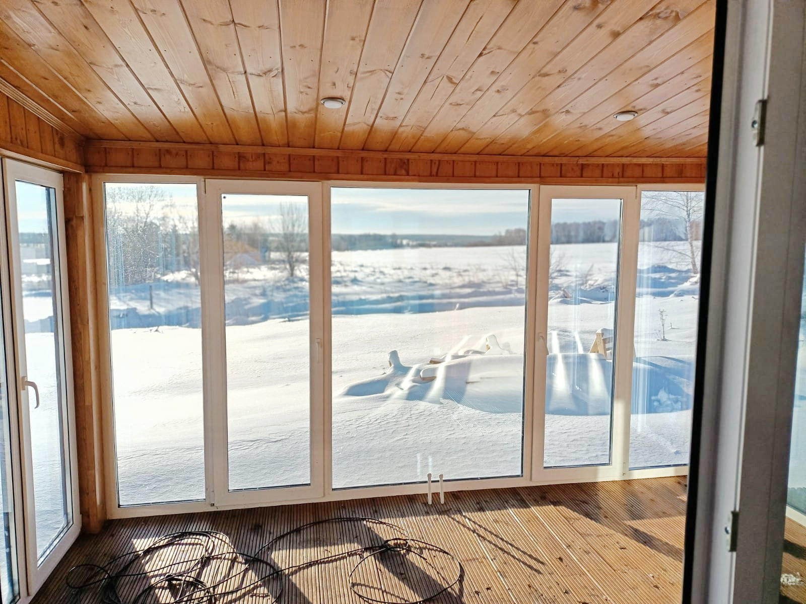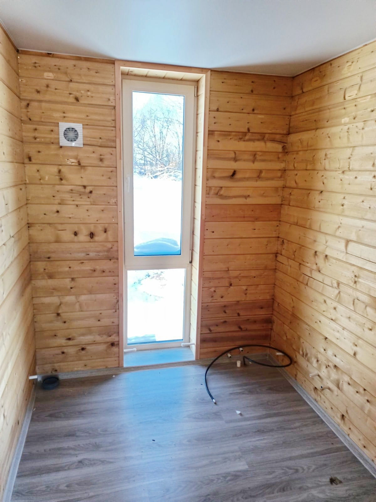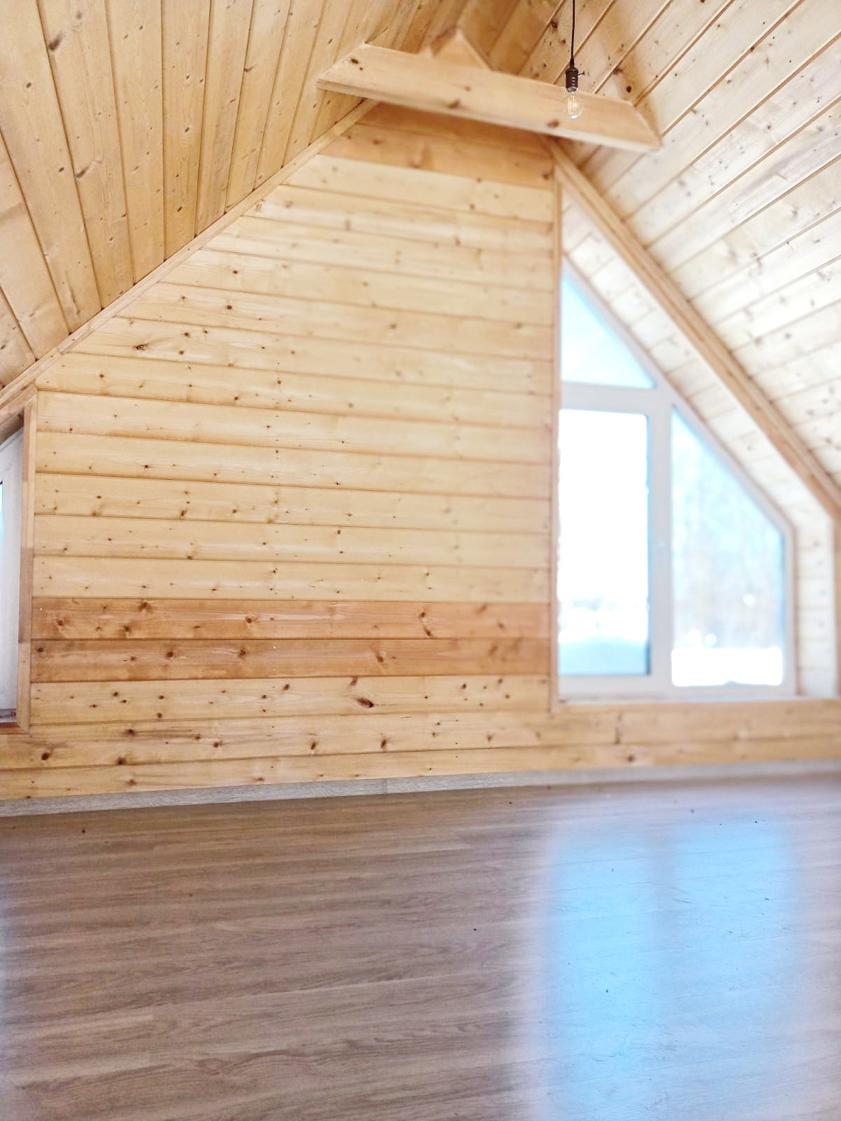 Внутри дом обшит планкеном из Архангельской лиственницы, он отличается от вагонки сроком службы и удобством при его обслуживании.