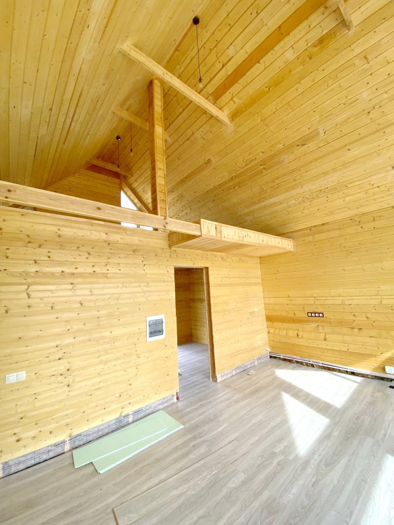В доме уже сделана разводка электричества, водопровода и канализации, а также все готово для монтажа системы отопления, осталось только установить сантехнику, бытовую технику и мебель на свой вкус.