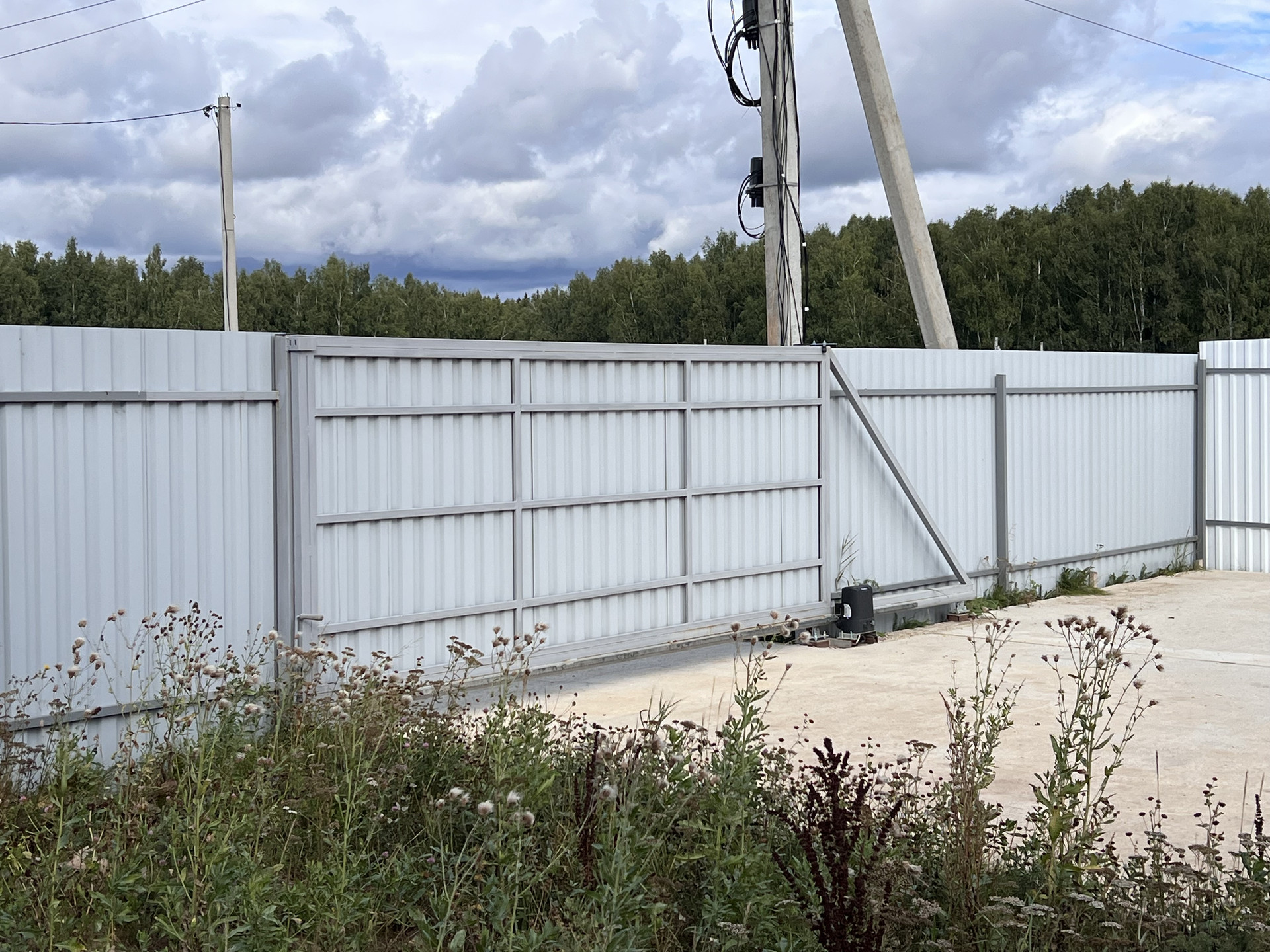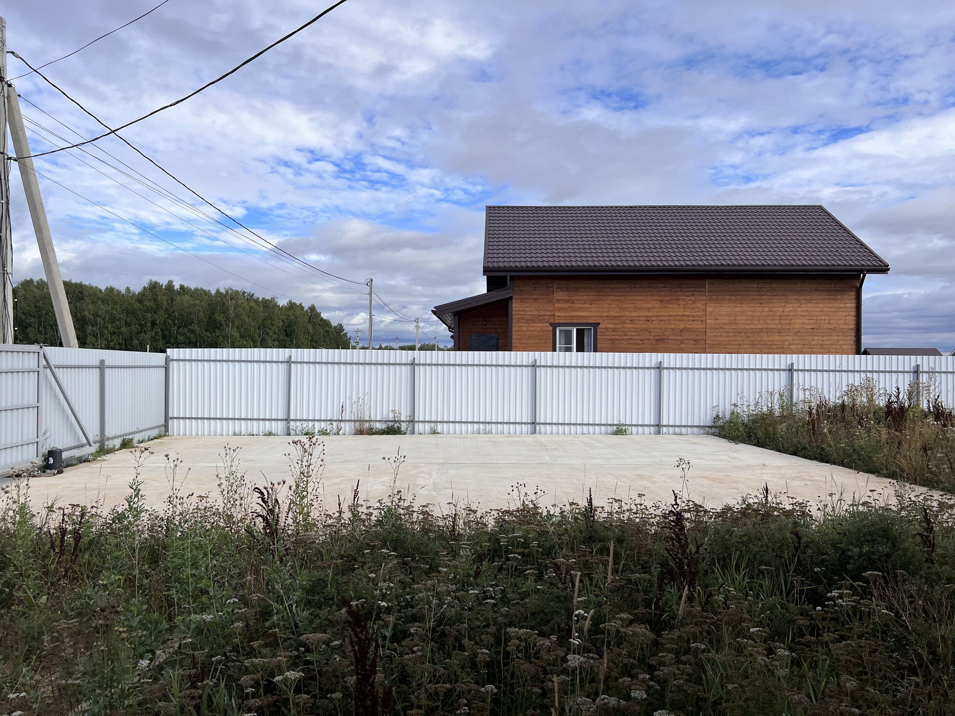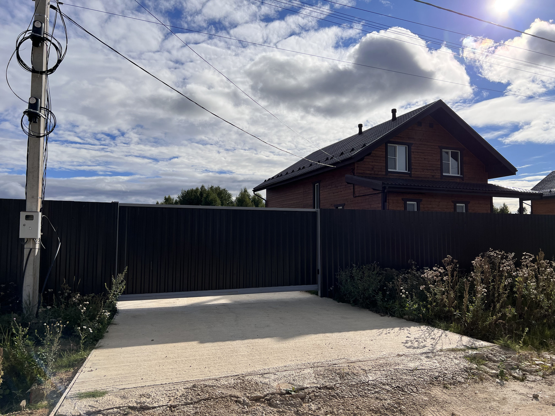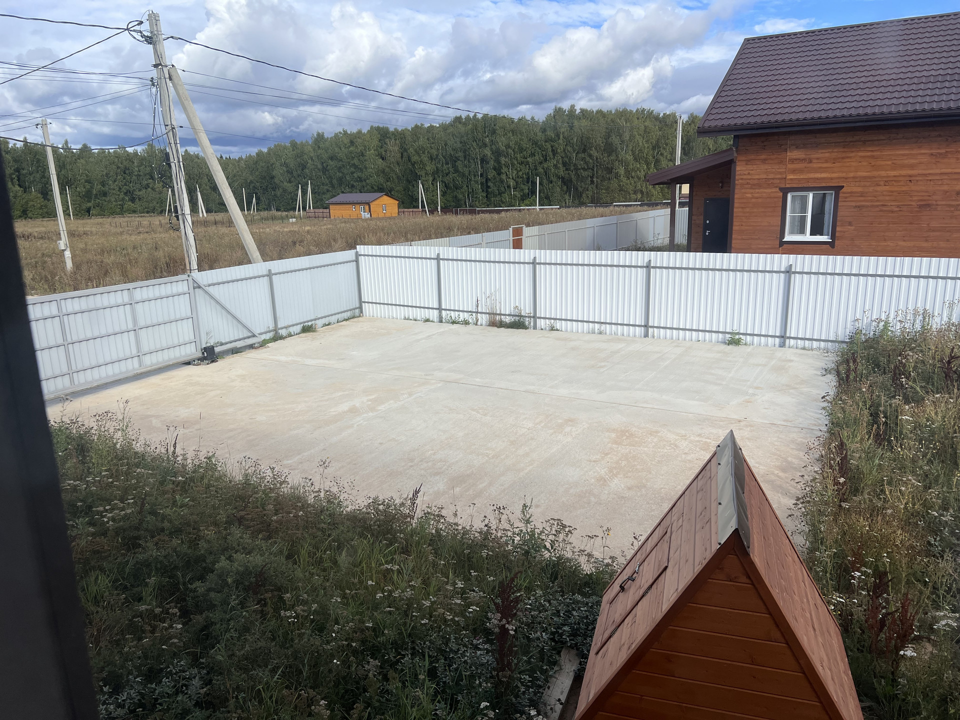 Огорожен. Оборудован подъезд к участку. Откатные электрические ворота. Сделана бетонная площадка под навес для парковки нескольких машин. Оборудована отмостка вокруг дома.