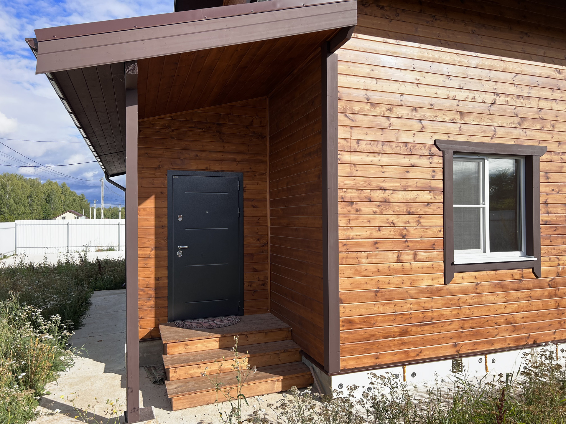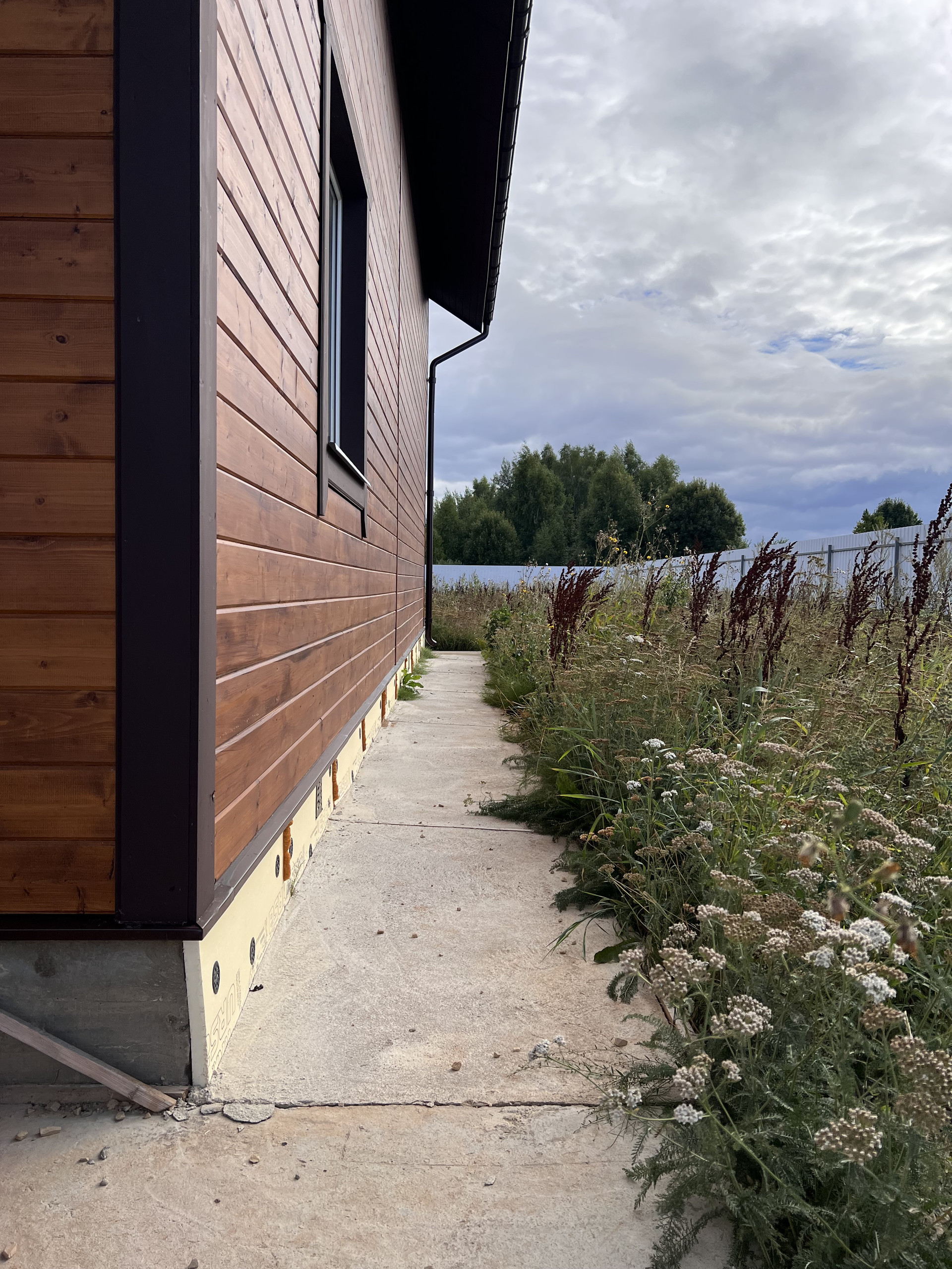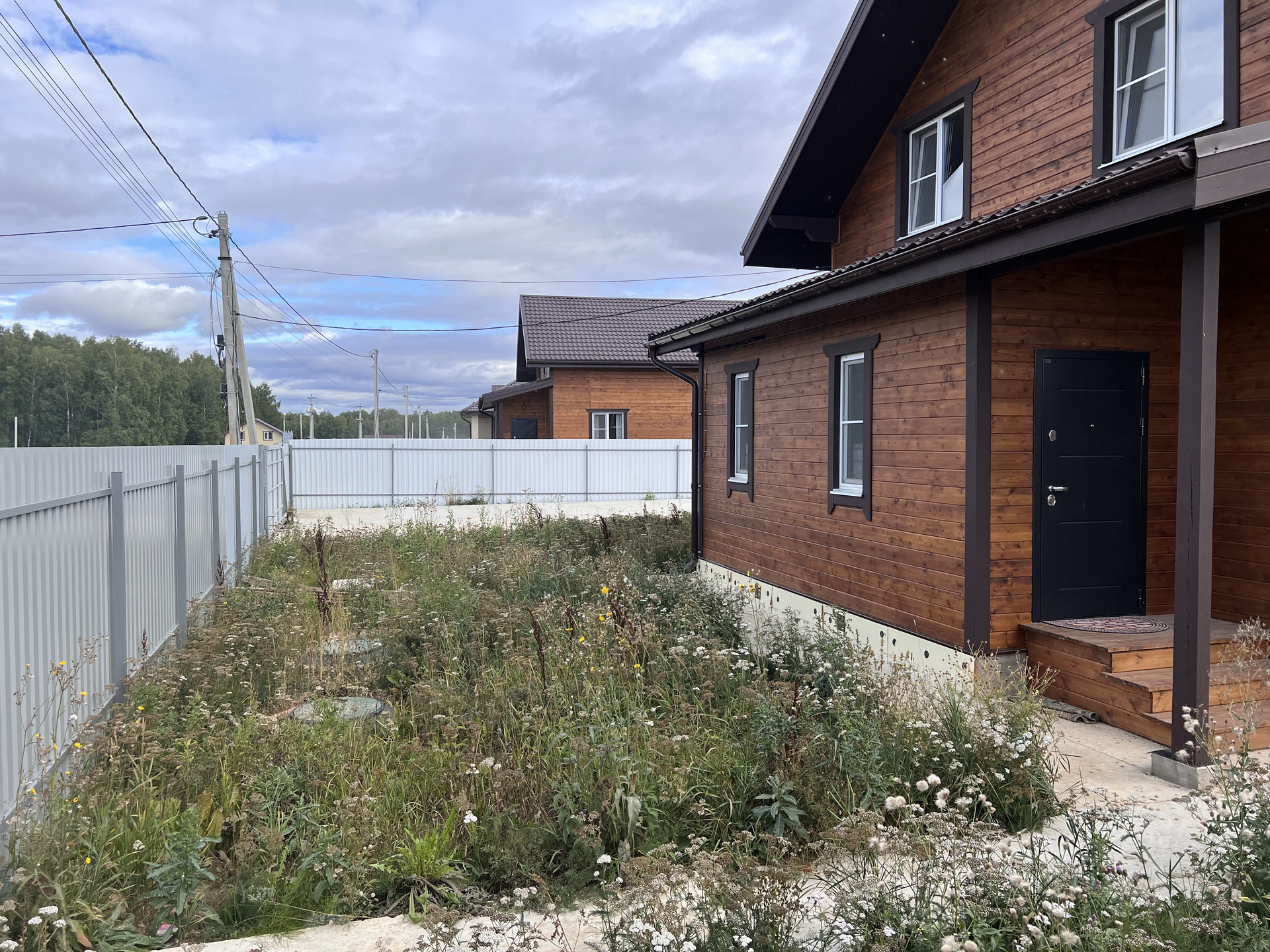 Огорожен. Оборудован подъезд к участку. Откатные электрические ворота. Сделана бетонная площадка под навес для парковки нескольких машин. Оборудована отмостка вокруг дома.