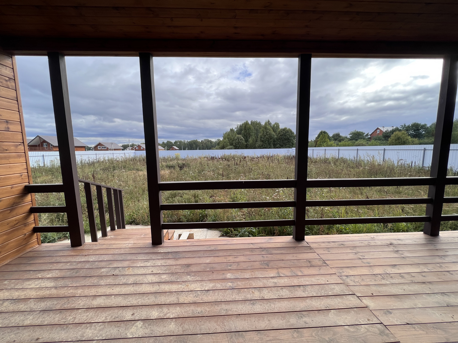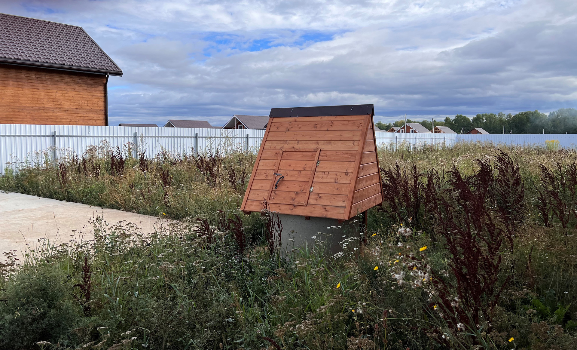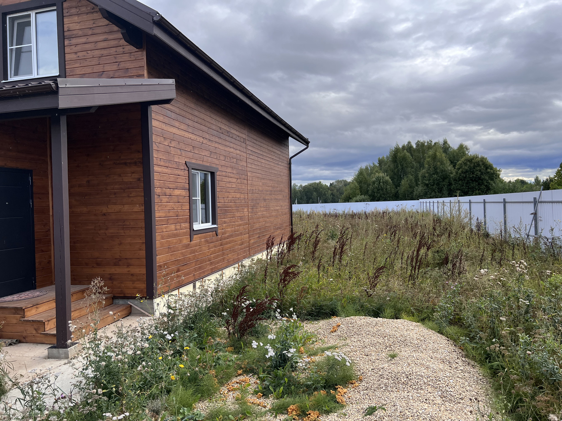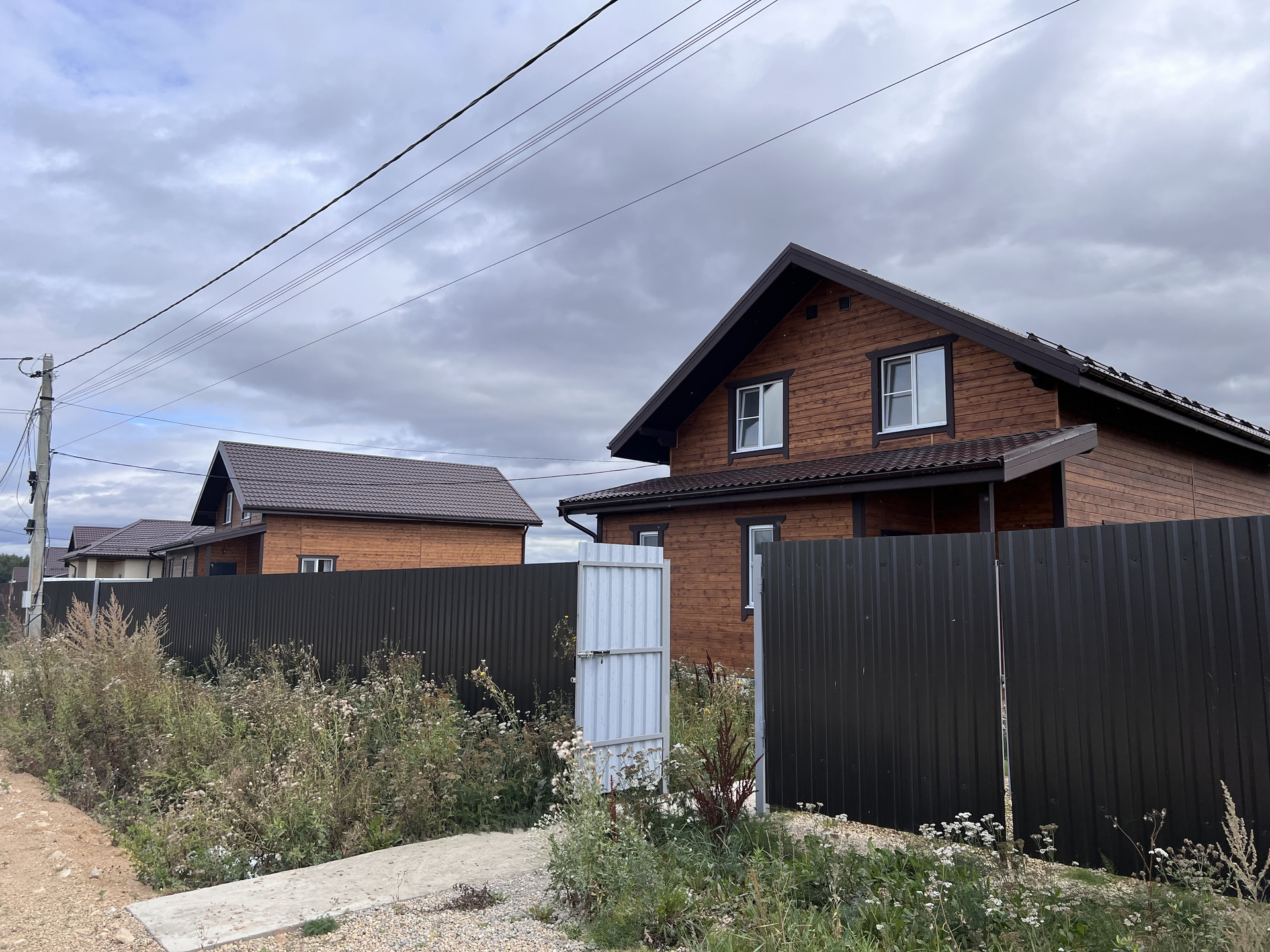 Огорожен. Оборудован подъезд к участку. Откатные электрические ворота. Сделана бетонная площадка под навес для парковки нескольких машин. Оборудована отмостка вокруг дома.