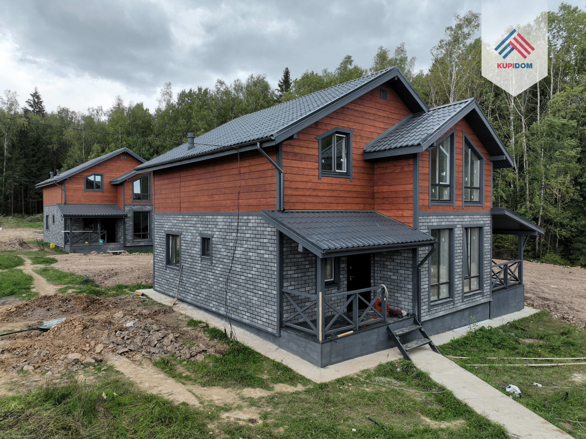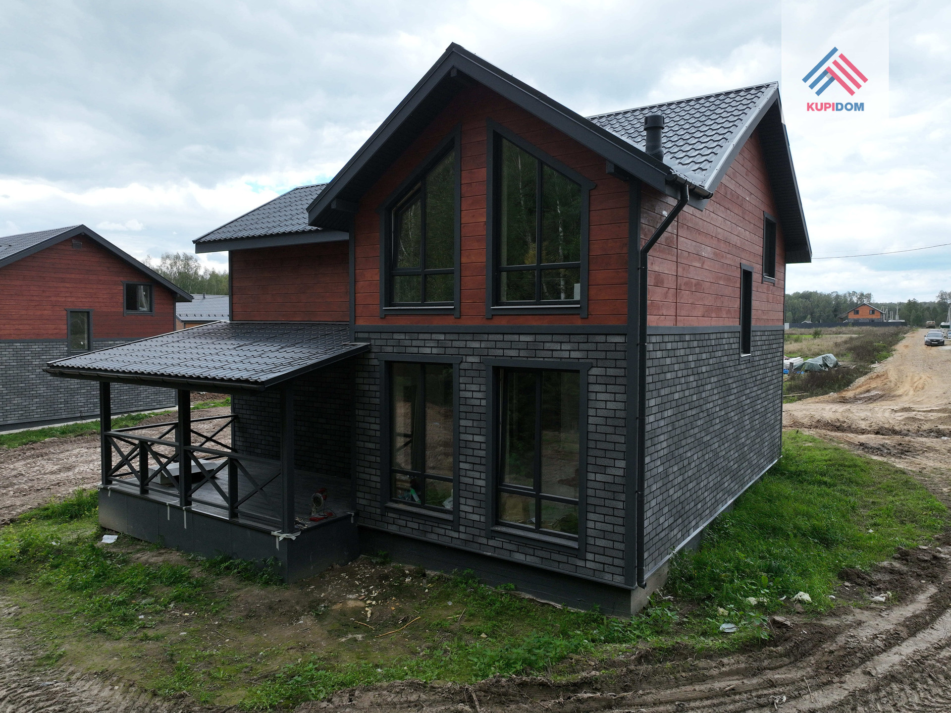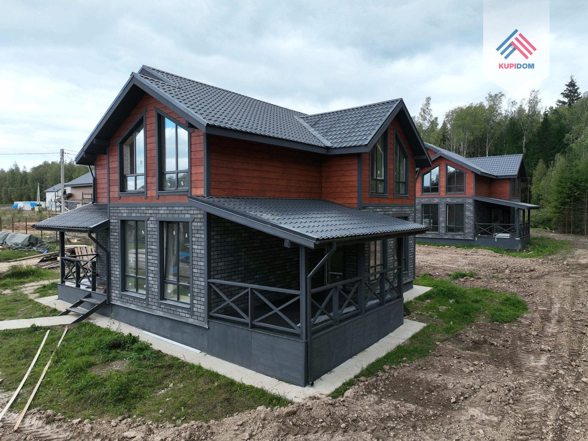 Фундамент – ростверк с монолитной плитой, армированный. Материал стен - газоблок Bonolit 30 с утеплением 50 мм; Внешняя отделка: имитация бруса / фасадная плитка «HAUBERK» Технониколь; Окна - REHAU 70 профиль, двухкамерные стеклопакеты в темной ламинациии с поворотнооткидным механизмом; Кровля - Метталлочерепица Grand Line; Установлена водосточная система; Крыша и фасад - вентилируемые.