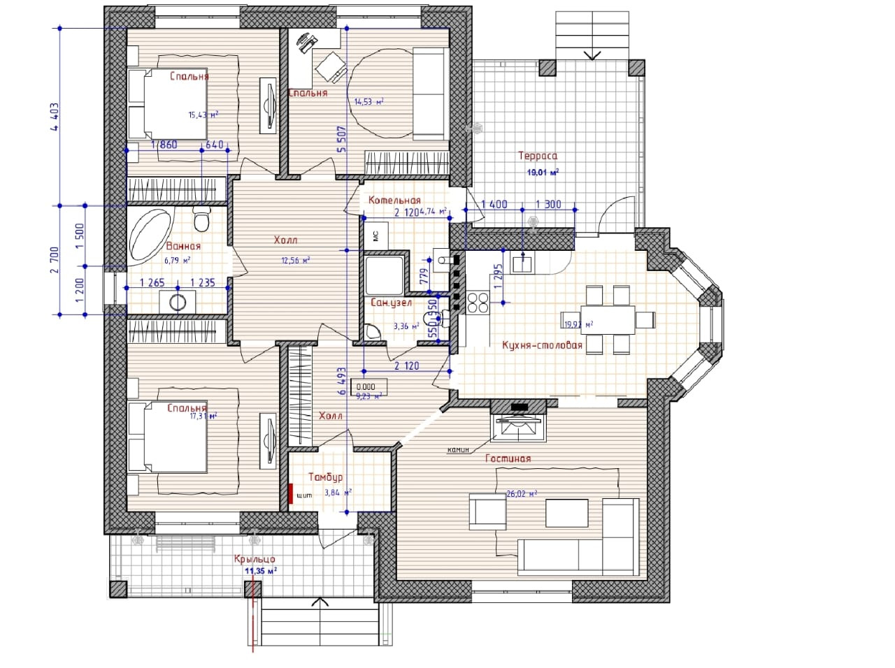 ✅При площади в 133 м2, пятно застройки 186 за счет толщины стен.