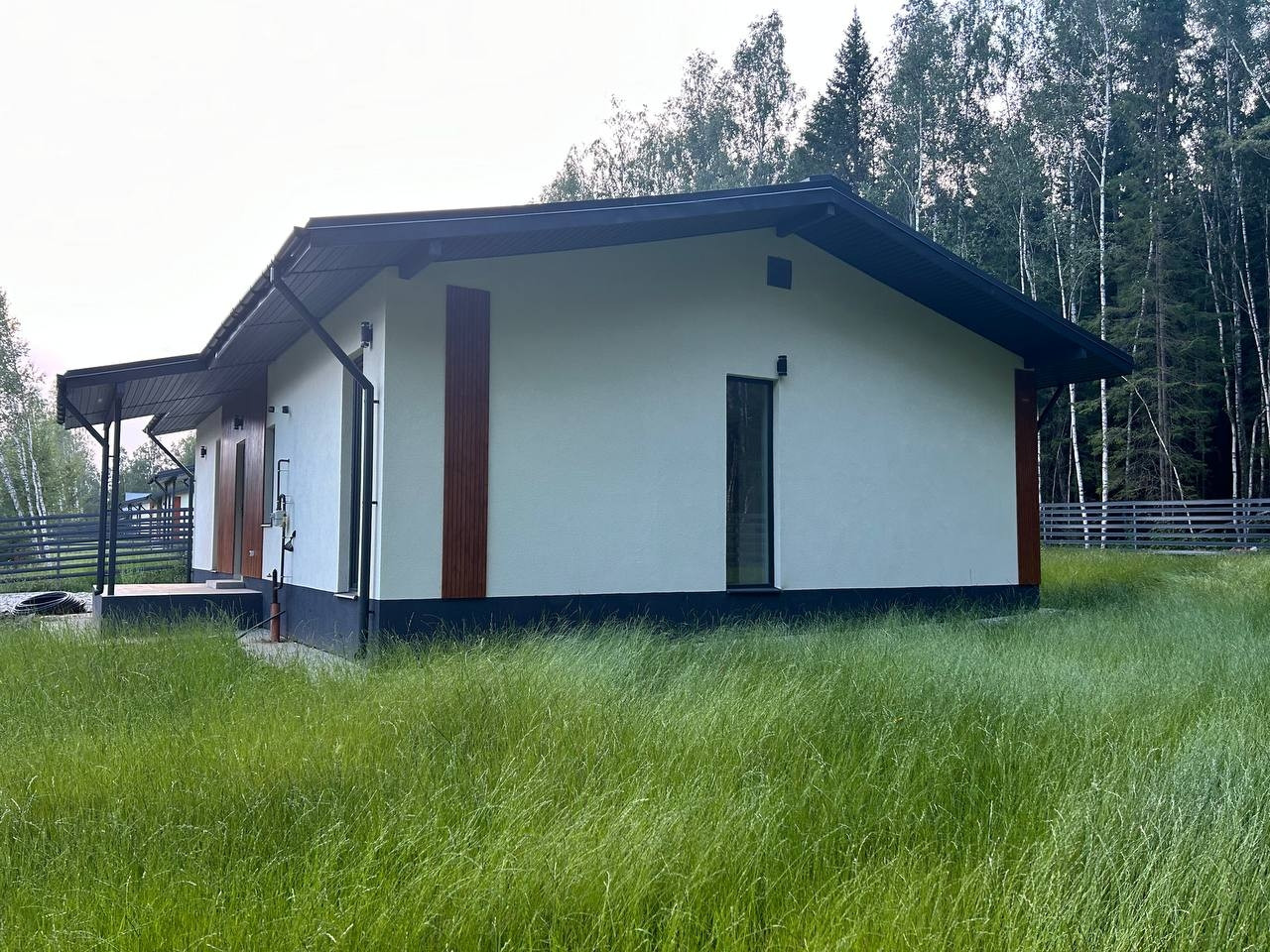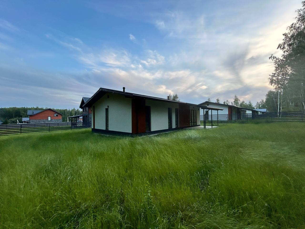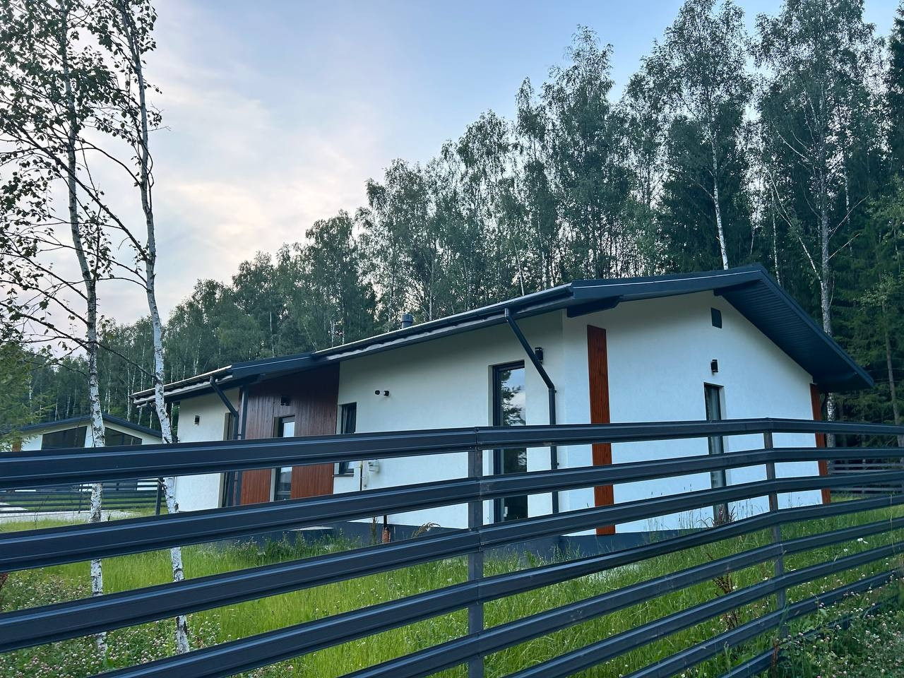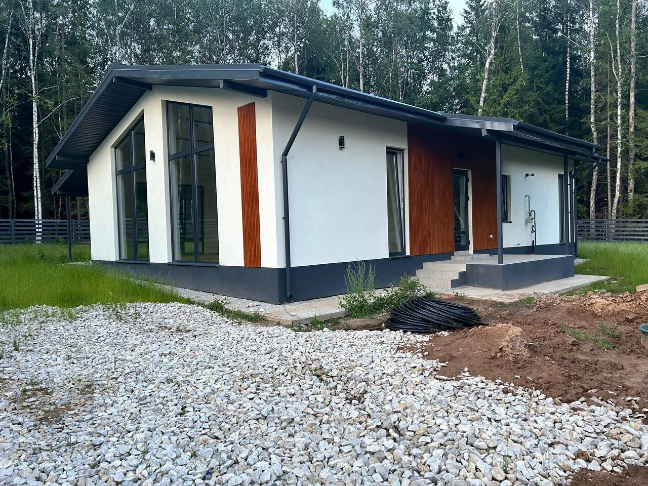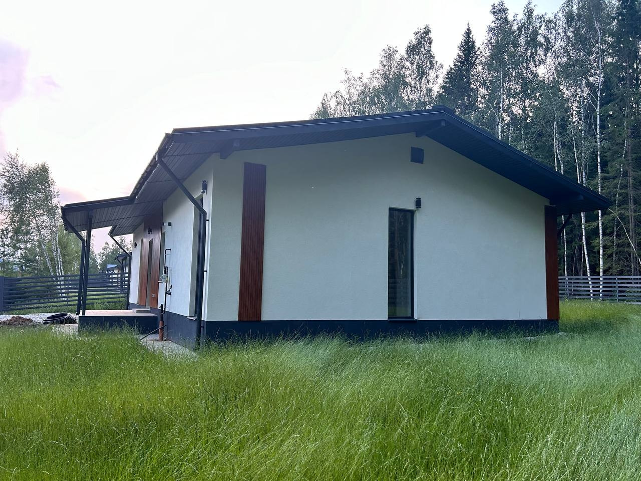 Фундамент - монолитная армированная плита. Крыша – мягкая кровля, окна - двухкамерные стеклопакеты Rehau. В доме по всему первому этажу и в жилой комнате водяной теплый пол, потолки натяжные. Стены газоблок + утеплитель. Вентилируемые фасады и кровля. Откатные ворота, забор по всему периметру участка, до дома бетонированная дорожка, отмостка. Ровная подъездная дорога от шоссе до поселка. Круглогодичный подъезд.