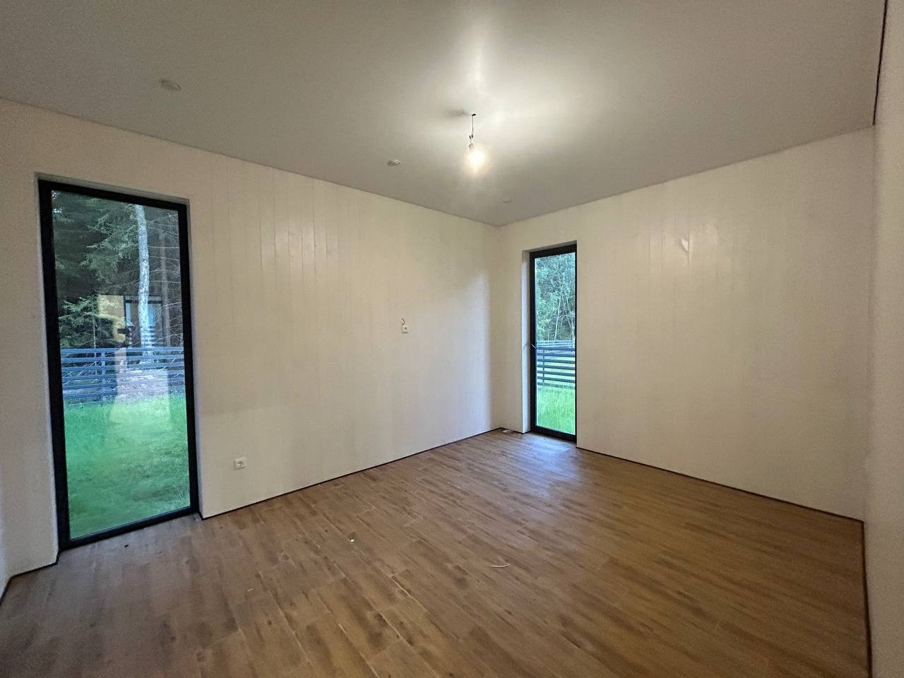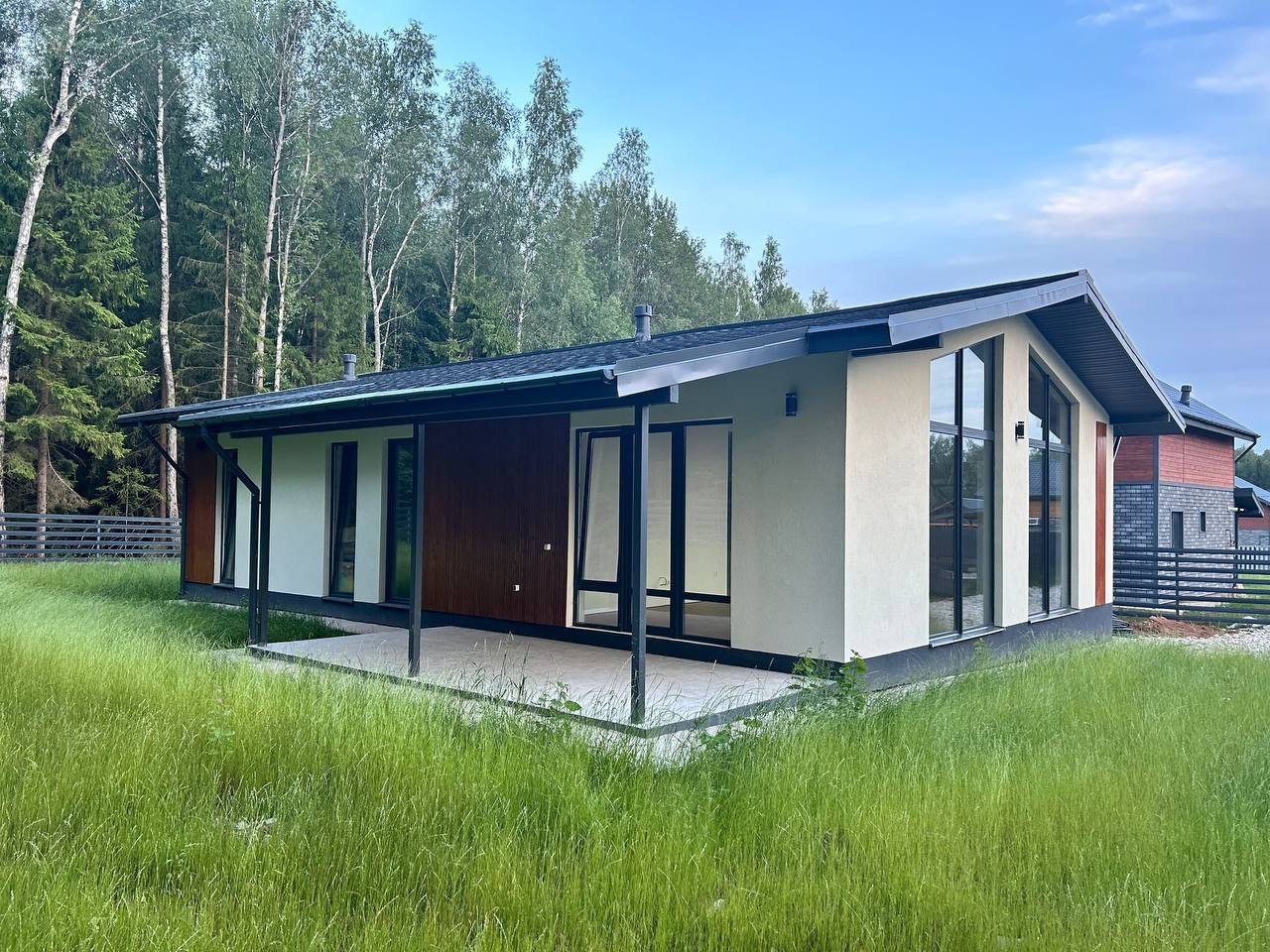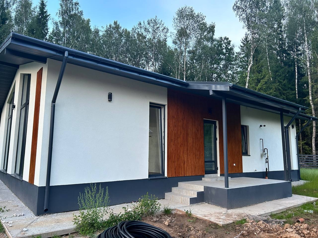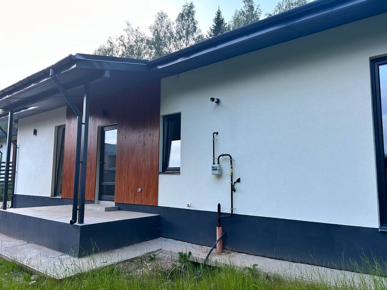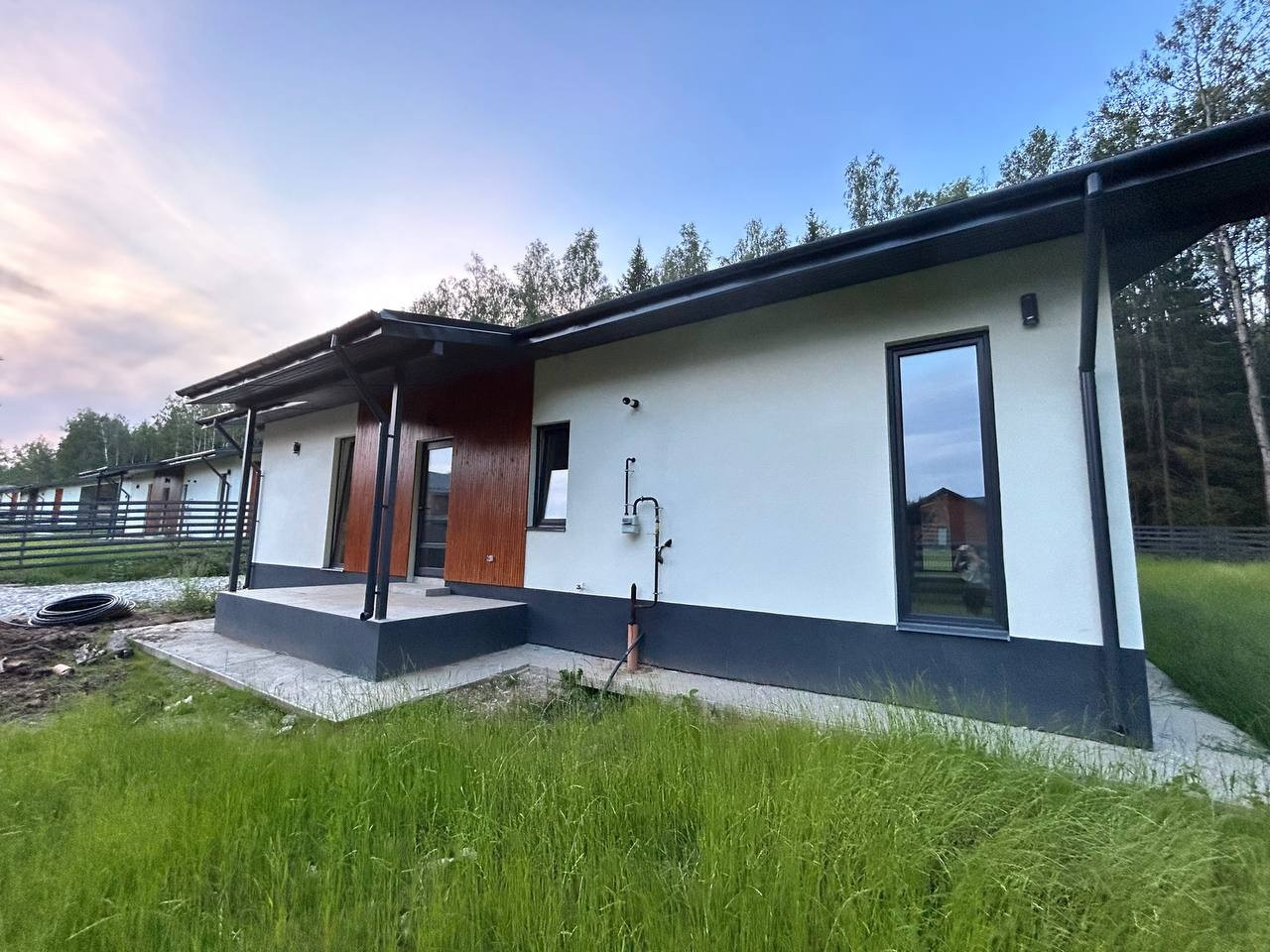 Фундамент - монолитная армированная плита. Крыша – мягкая кровля, окна - двухкамерные стеклопакеты Rehau. В доме по всему первому этажу и в жилой комнате водяной теплый пол, потолки натяжные. Стены газоблок + утеплитель. Вентилируемые фасады и кровля. Откатные ворота, забор по всему периметру участка, до дома бетонированная дорожка, отмостка. Ровная подъездная дорога от шоссе до поселка. Круглогодичный подъезд.