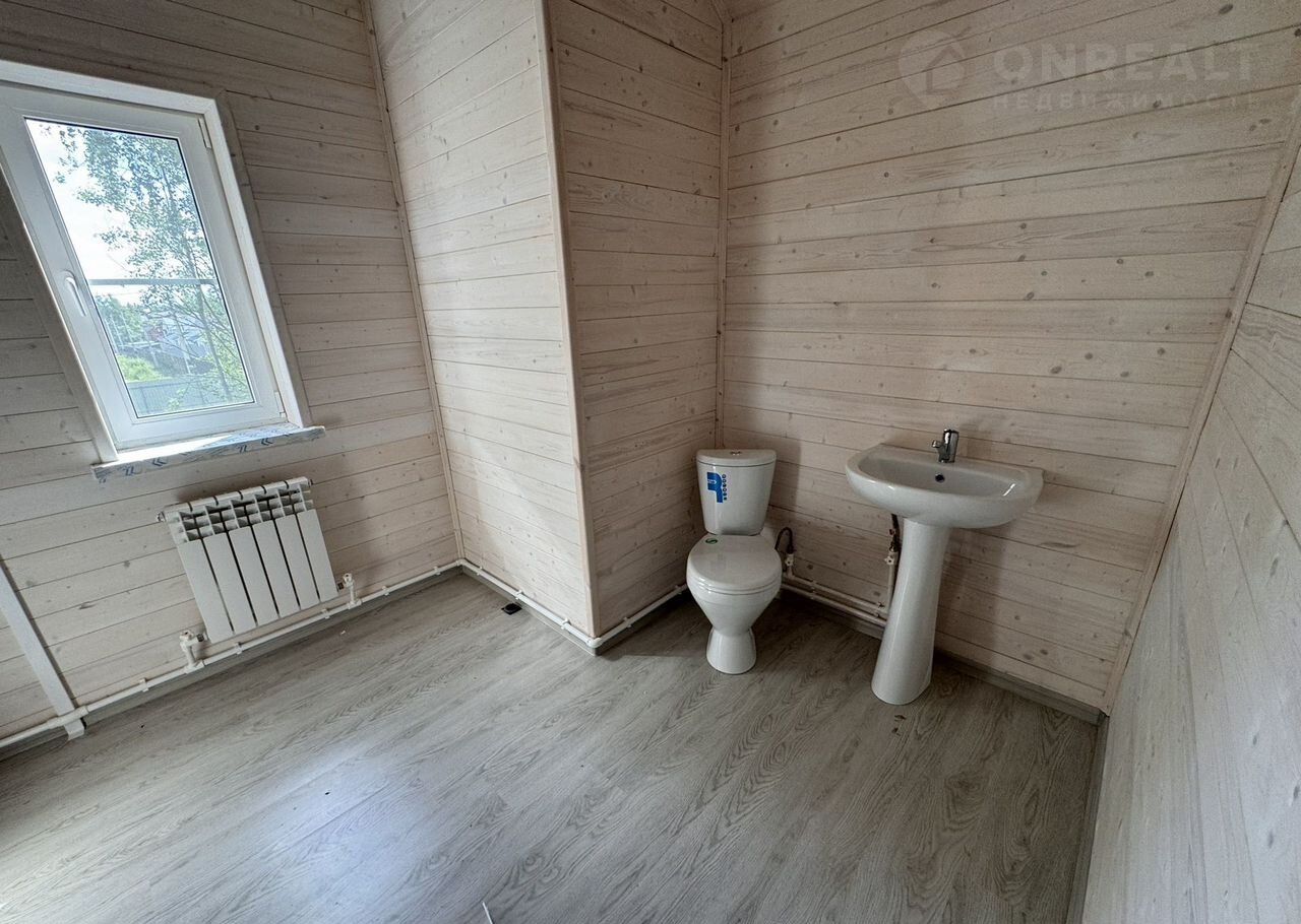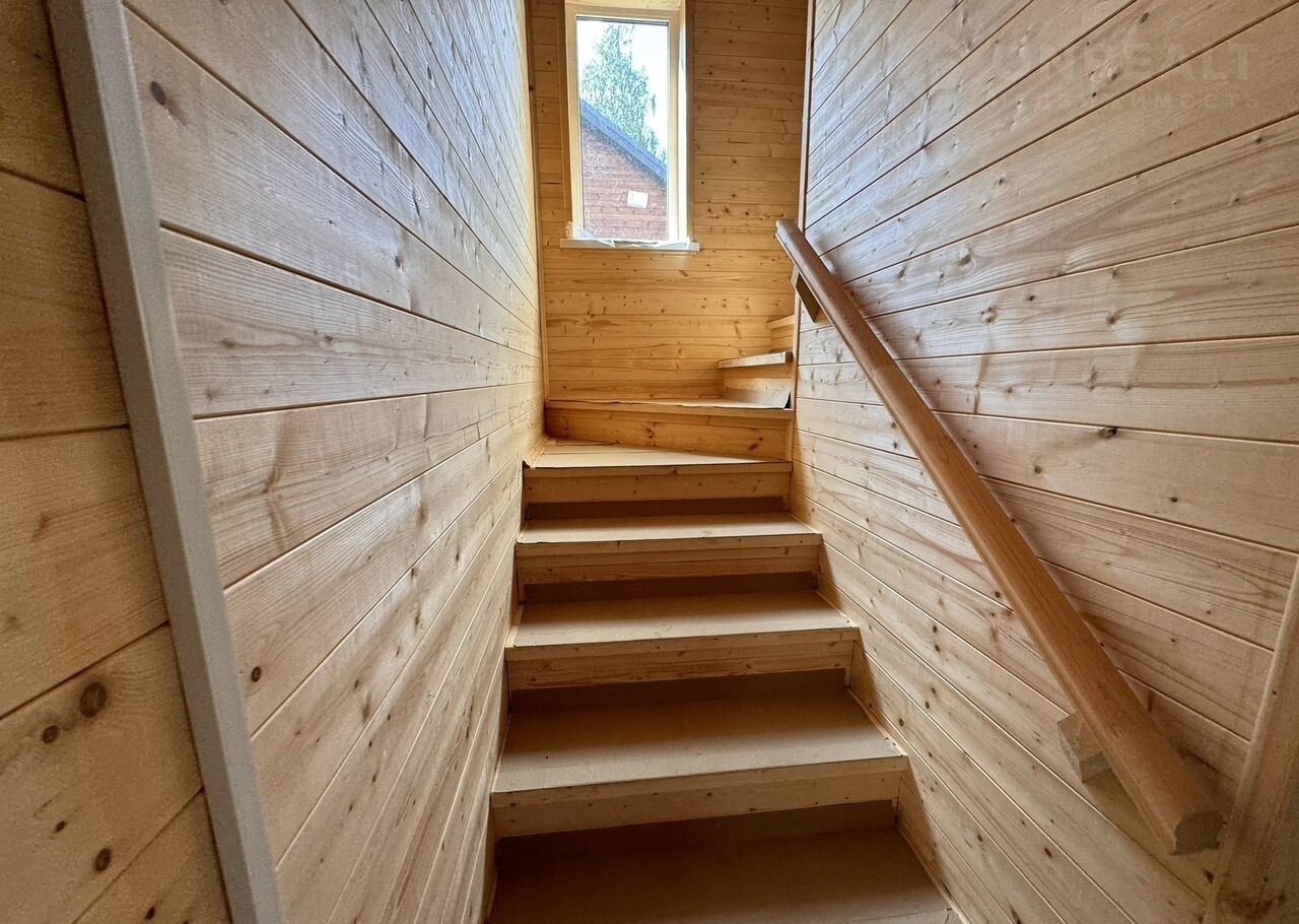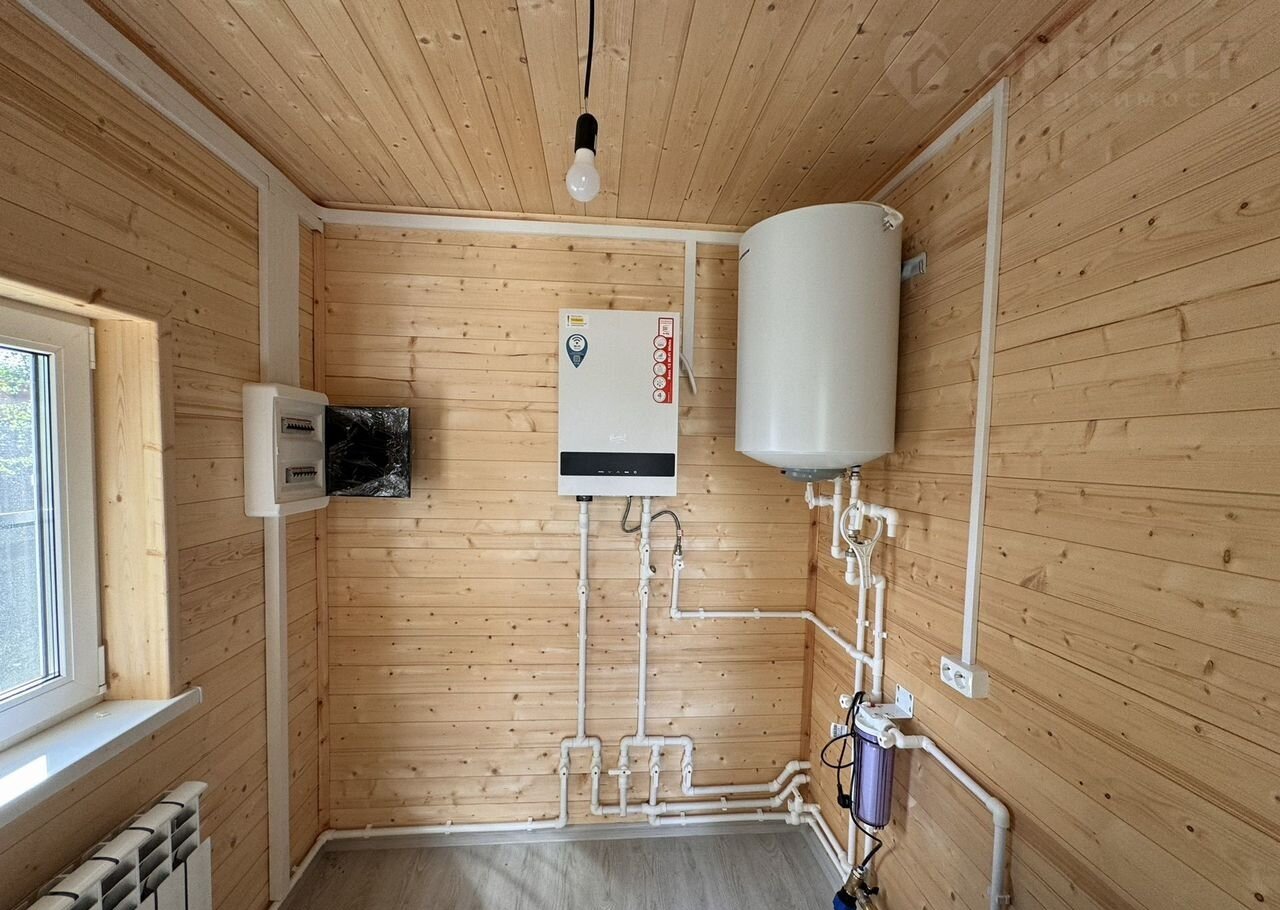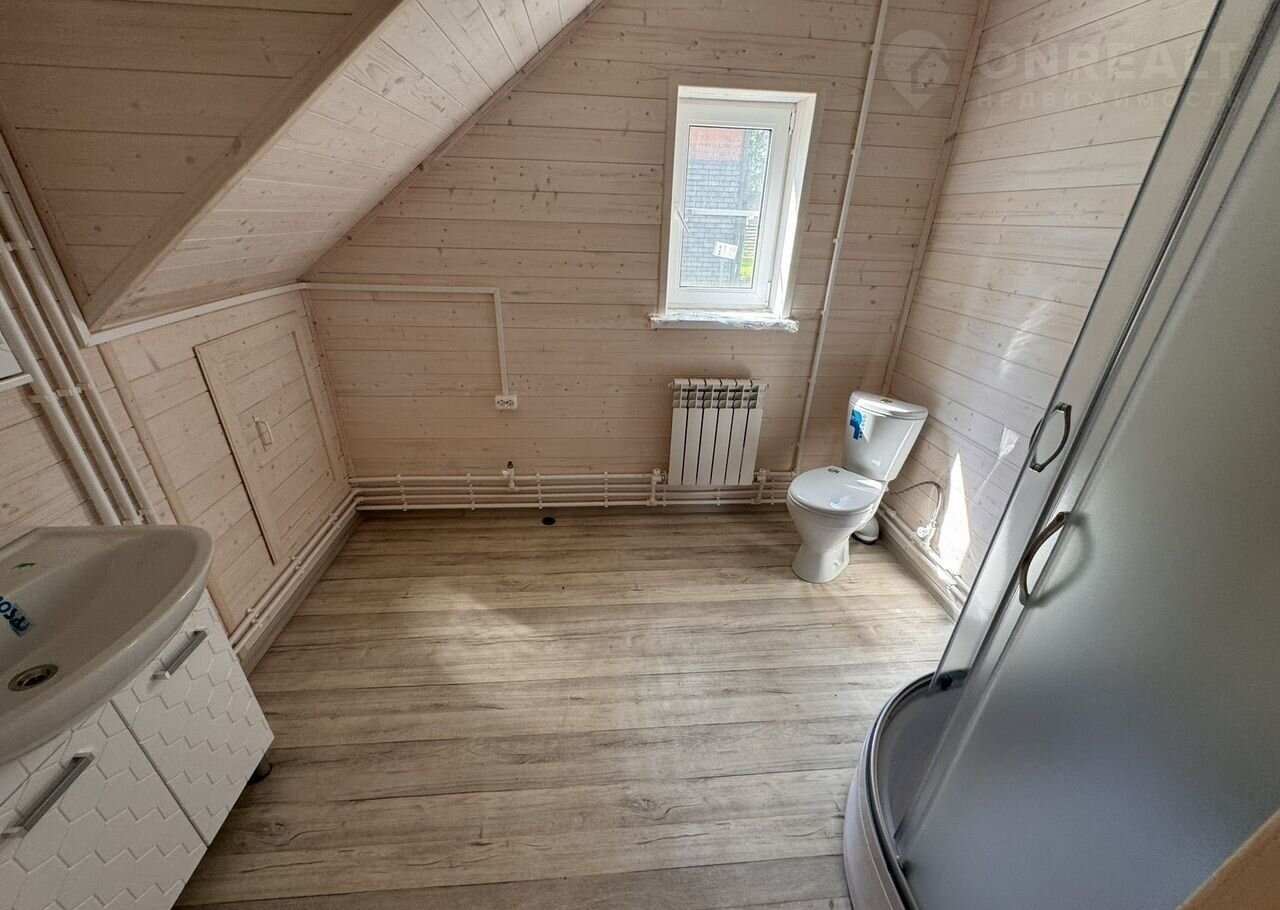 Планировка: на 1-ом этаже: крыльцо, бойлерная, коридор, санузел с сантехникой, кухня-гостиная с выходом на большую террасу, спальня. На 2-м этаже: холл, 3 спальни, балкон и санузел ( сантехника установлена) .