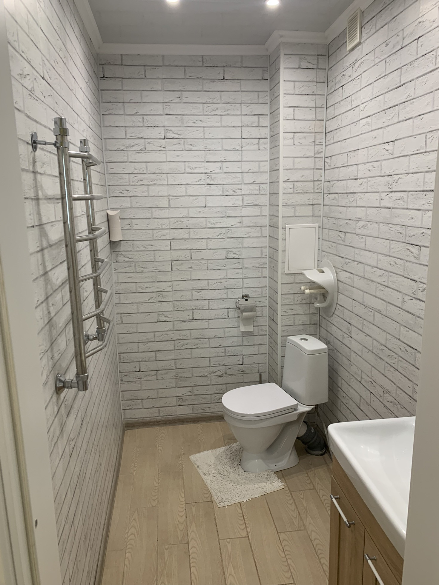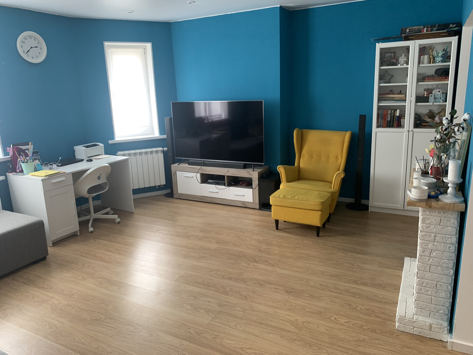 Большая гостиная (20 метров), санузел (3.5 метра). Водяные теплые полы на всем этаже, батареи с термодатчиками.