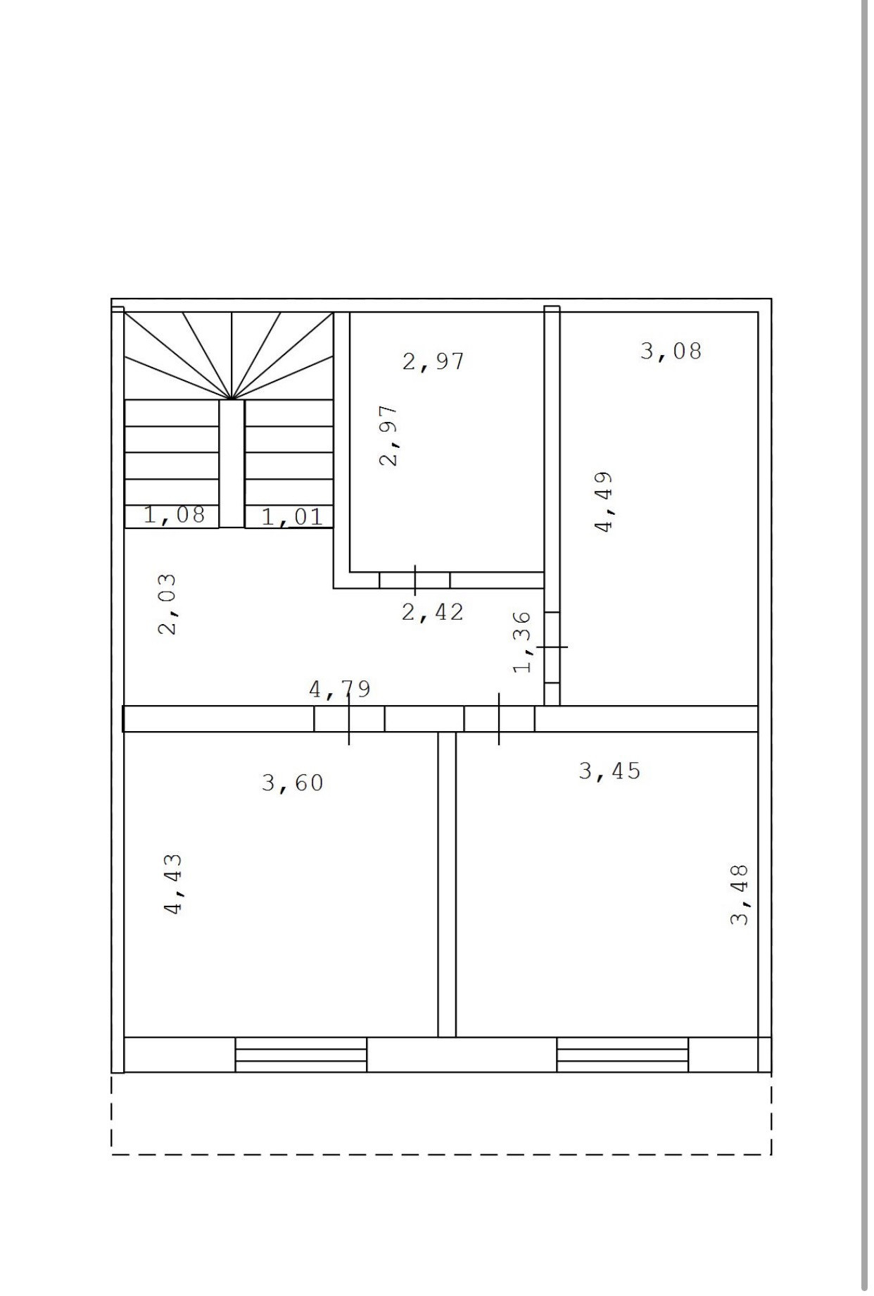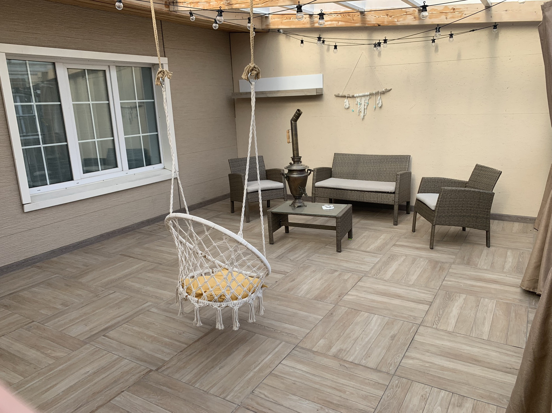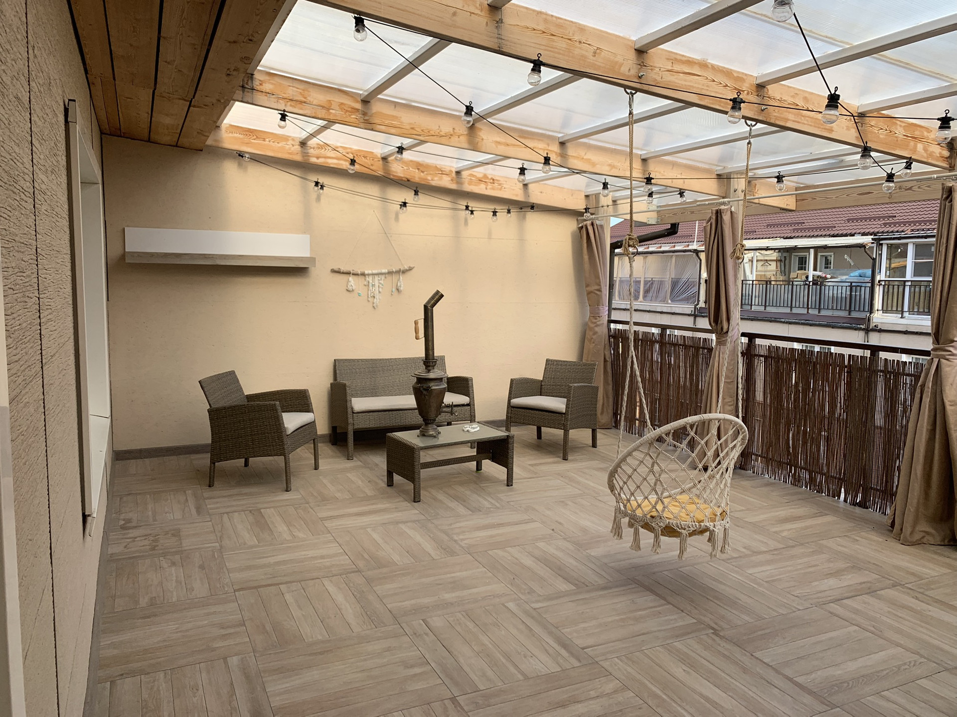 Третий этаж: большая комната (20метров), маленький санузел (есть выходы под воду и канализацию, не использовался по назначению, использовался как склад) и огромная терраса более 30 метров - на полу плитка, сделан ремонт стен, крыша накрыта поликарбонатом, деревянные стойки из лиственницы.